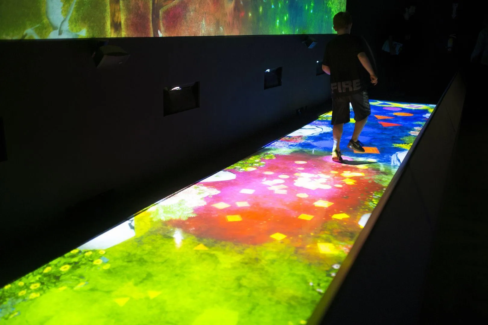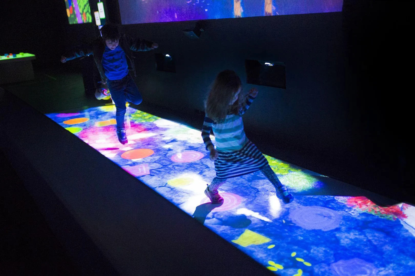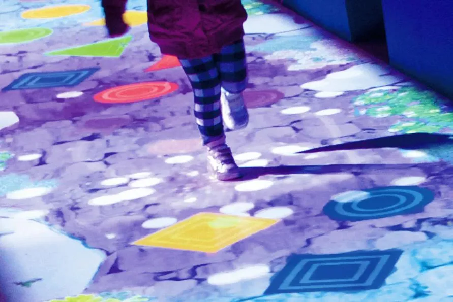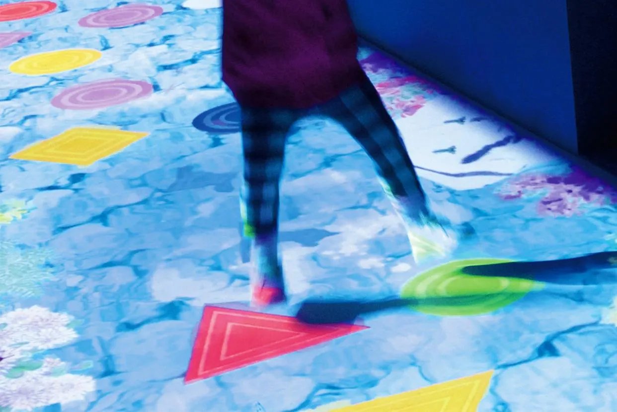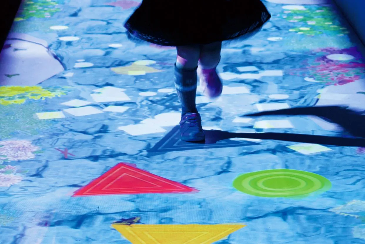 물에 떠있는 ○△□ 위를 뛰어다니면 소리가 나면서 지나간 길을 따라 공간이 변화합니다.