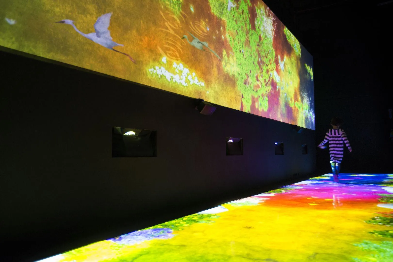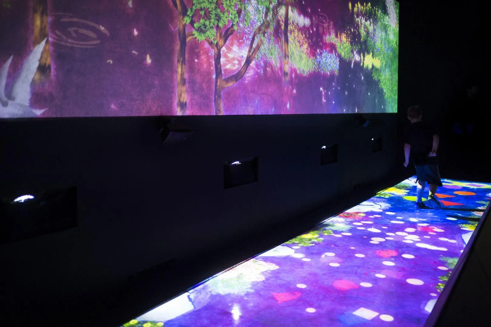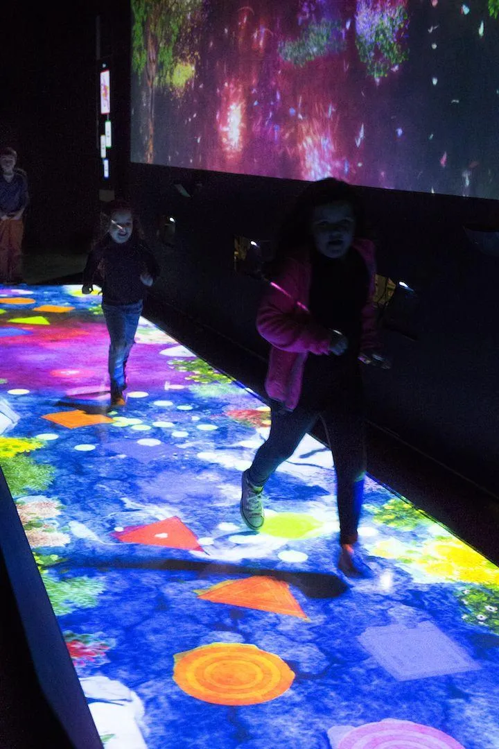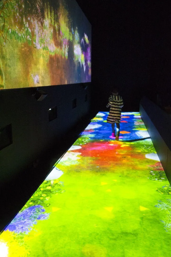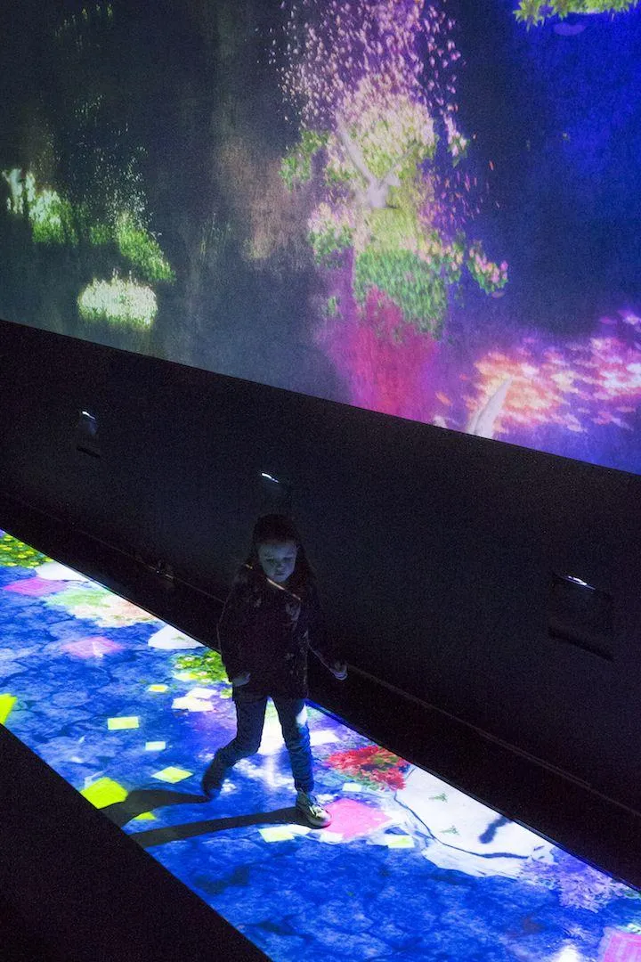 물에 떠있는 ○△□ 위를 뛰어다니면 소리가 나면서 지나간 길을 따라 공간이 변화합니다.