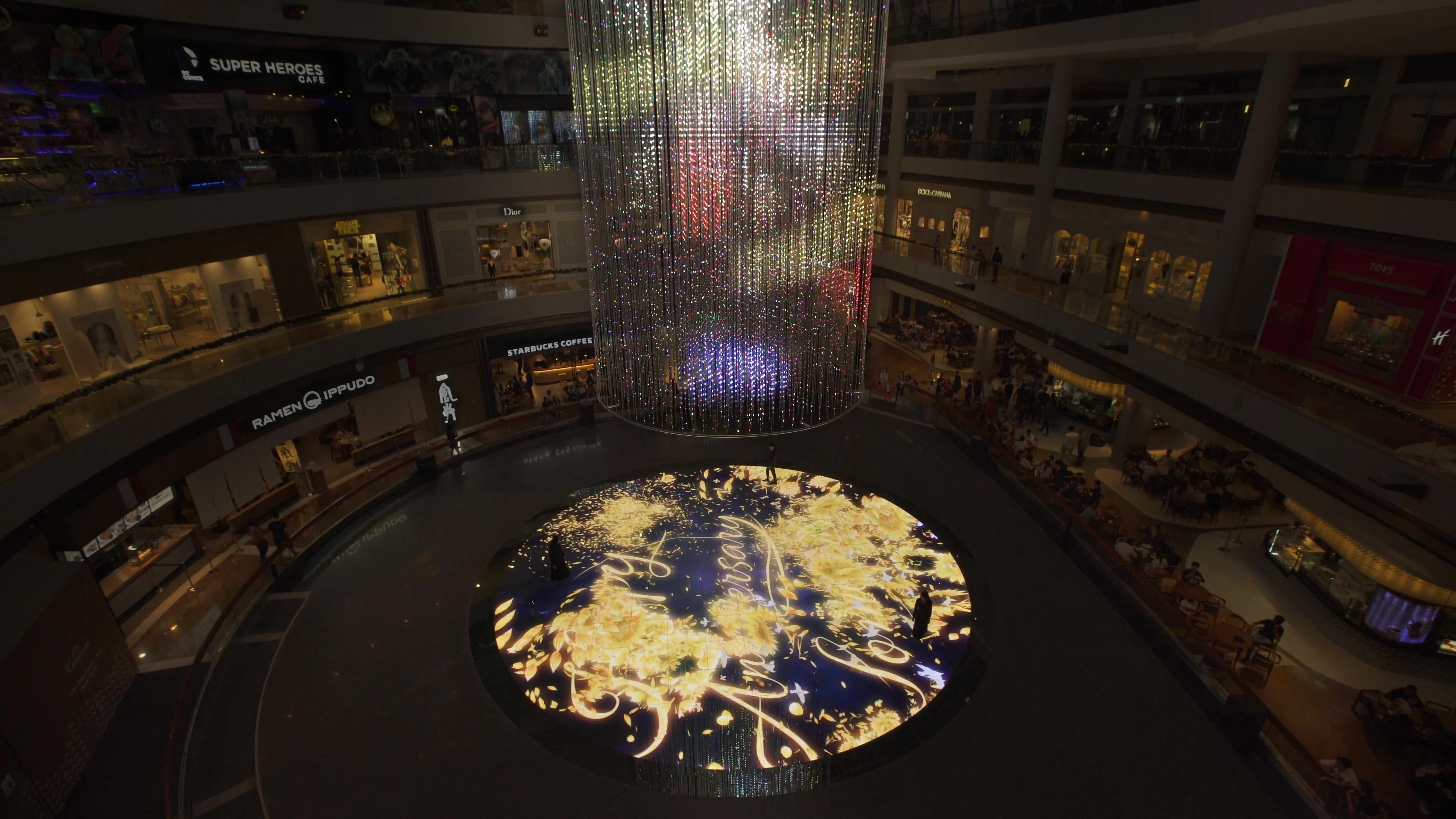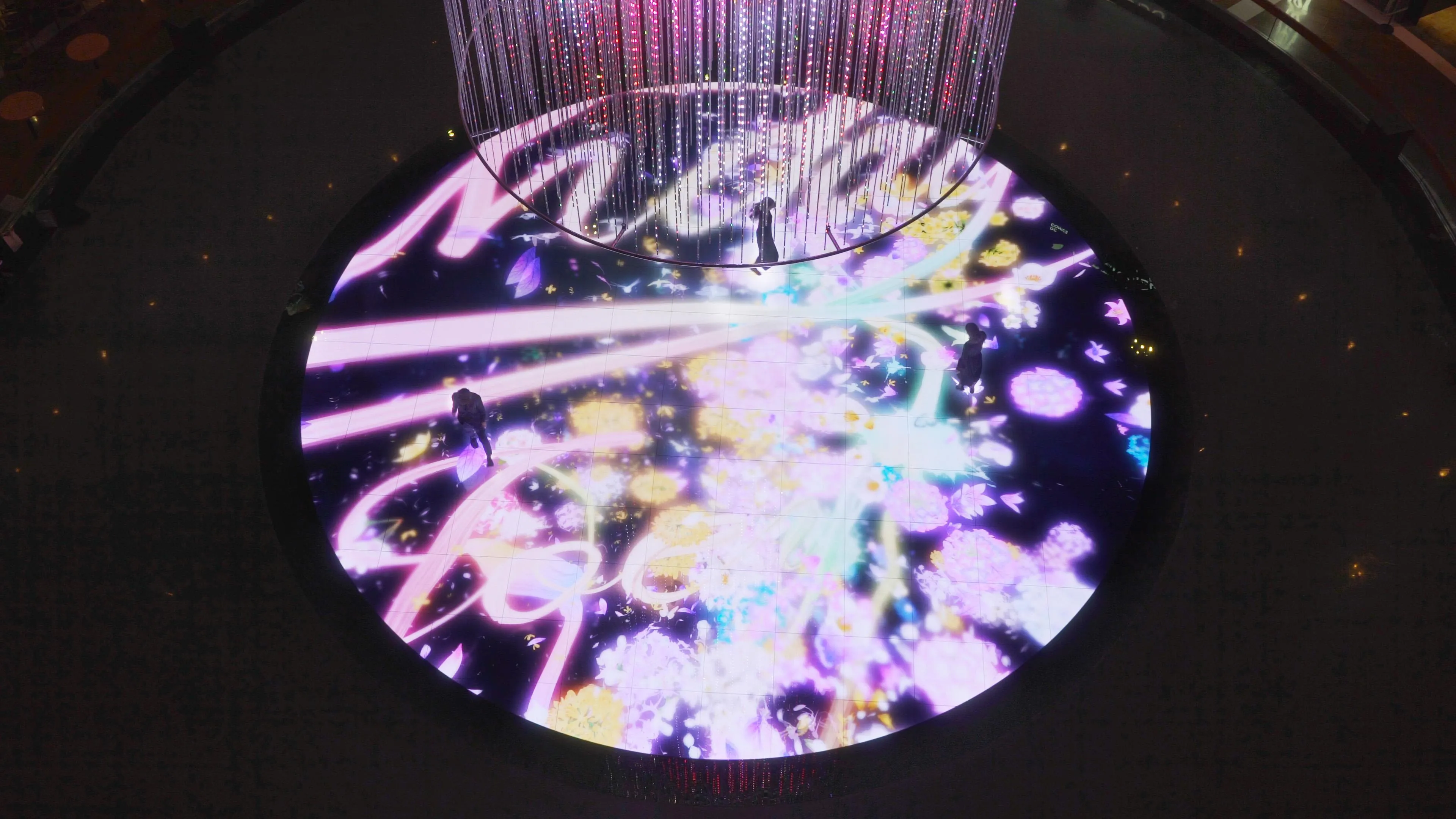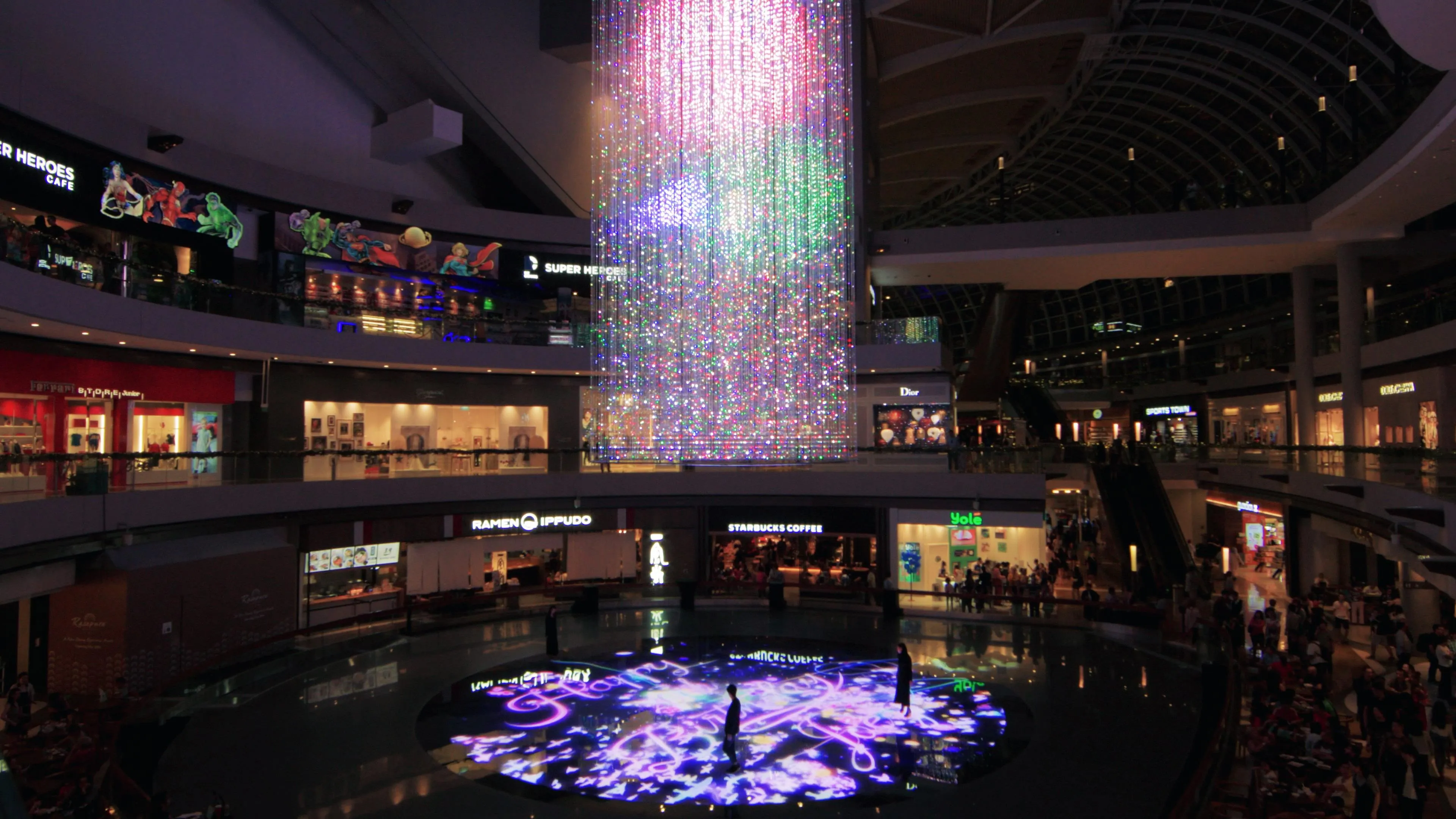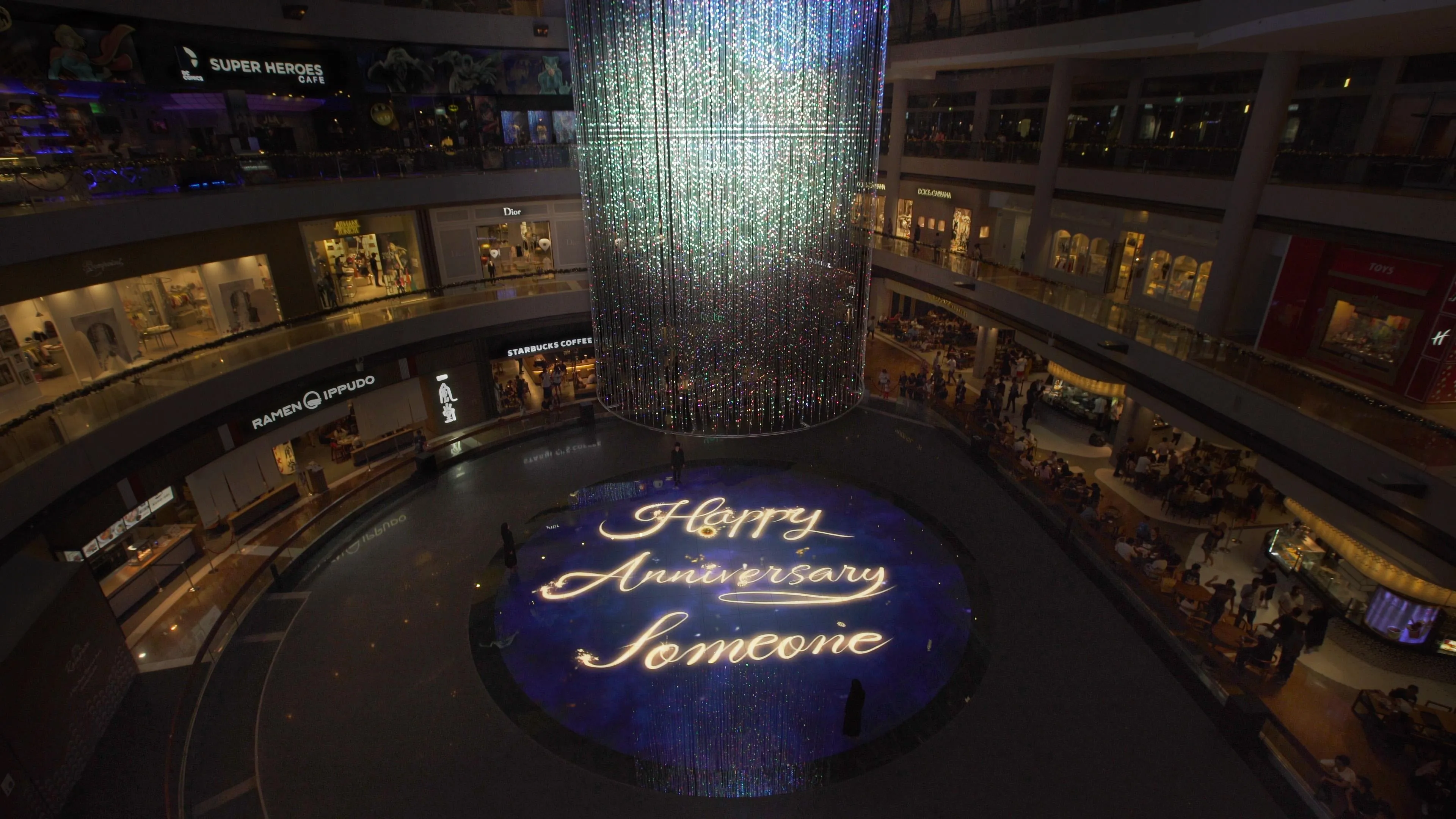 teamLab, 2017, Interactive Digital Installation + Light Sculpture, Happy Birthday:1 min 22 sec, Happy Anniversary / Will You Marry Me?: 1 min 44 sec, H: 19800 mm W: 15000 mm D: 15000 mm, Sound: DAISHI DANCE