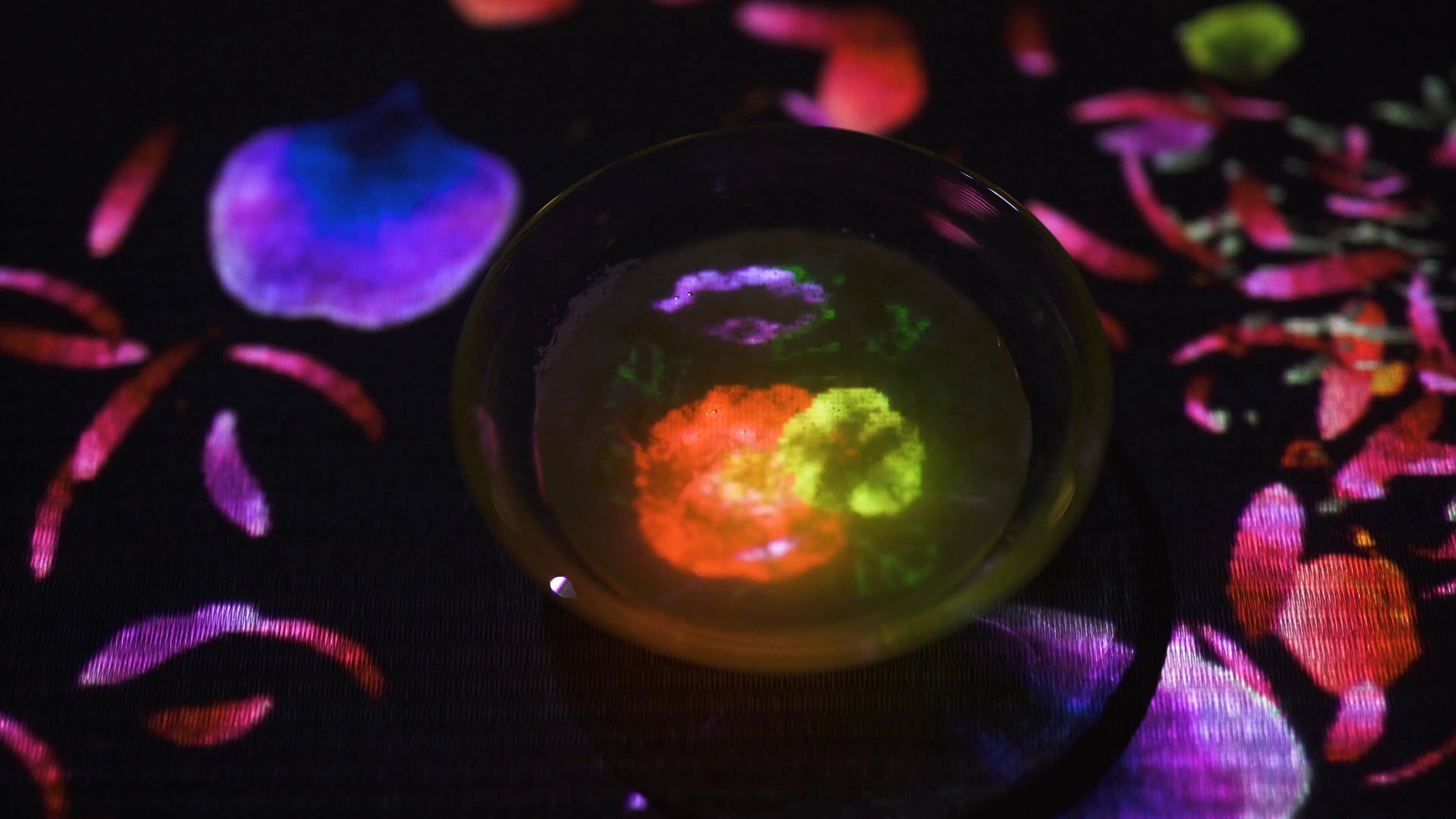 The dots of light blink and change color in cycles unique to each dot. A spontaneous order phenomenon occurs between dots that are close to each other, and their hues and the rhythm at which they blink gradually synchronize. When people touch them, the rhythm of the blinking hues change and are randomized, but the dots close to each other once again cause a spontaneous order phenomenon between them.