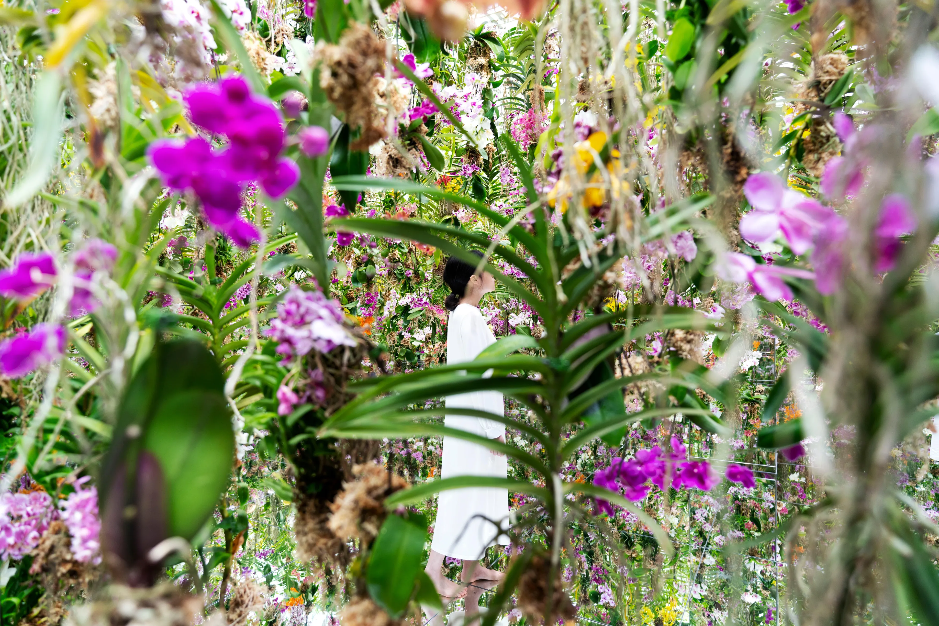 Orchids are known to have co-evolved with certain pollen-carrying insects. The flowers’ aromas become stronger at the time of day when the partner insects are active. Because of this, the scent of the artwork space changes each moment between morning, day, evening, and night. Since many of the orchids in this work are partnered with nocturnal insects, the tightly-packed orchids produce a powerful fragrance at night.