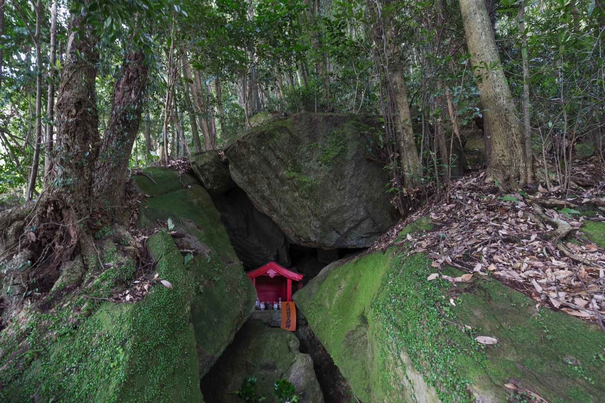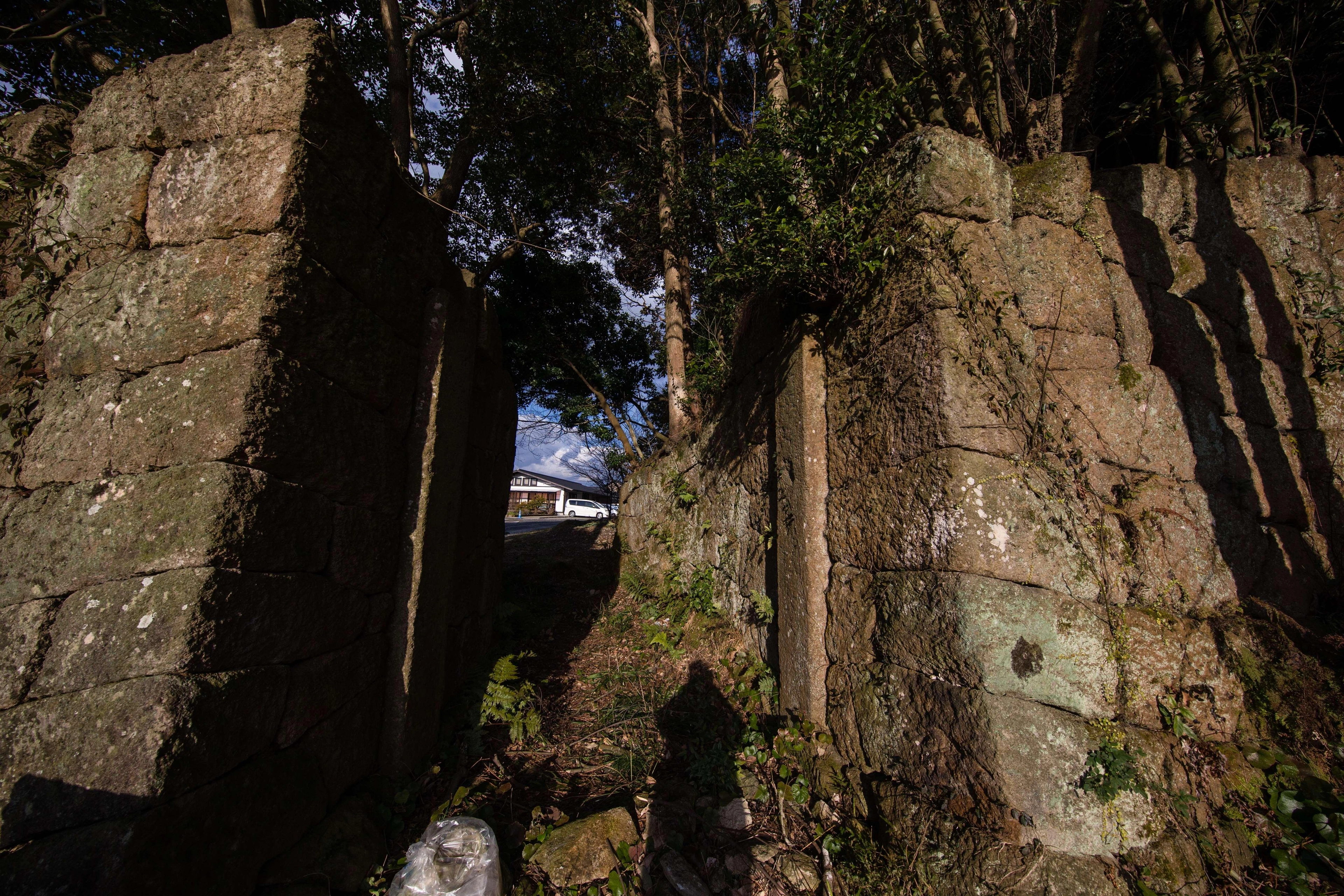 Within the forest, there is an enormous megalith, almost supernatural in its formation, known as an iwakura (a dwelling place of a god in ancient Japanese nature worship, or “animism”) that has been preserved as a small shrine. Around the 7th century, a sorcerer named En-no-gyouza-ozunu carved a 23-meter-tall figure over the entire surface of a sheer cliff on Mount Mifuneyama. And 1,300 years ago, the priest Gyoki, who created the Great Buddha in Nara, came to Mifuneyama, carved 500 Arhats and Buddha figures directly onto the rock face of the caves within the forest, which remain to this day. On the edge of the forest, the stone gate of Tsuzaki Castle and other ruins remain within and along the borderline of the forest.