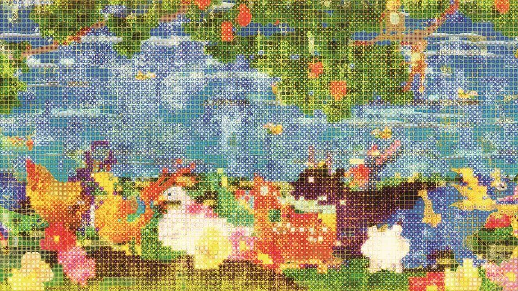 The squares of the screen are fixed while the space continues to move, and thus the color inside the squares is on a different time axis to the space. Seen as a whole from a distance, brilliantly shining  colors occur, and the world of plants and animals in the space will move at a slow time axis. When viewed up close, the colors divided by the finely drawn patterns of each square will change on a rapid time axis. Two time axes co-exist in this work.