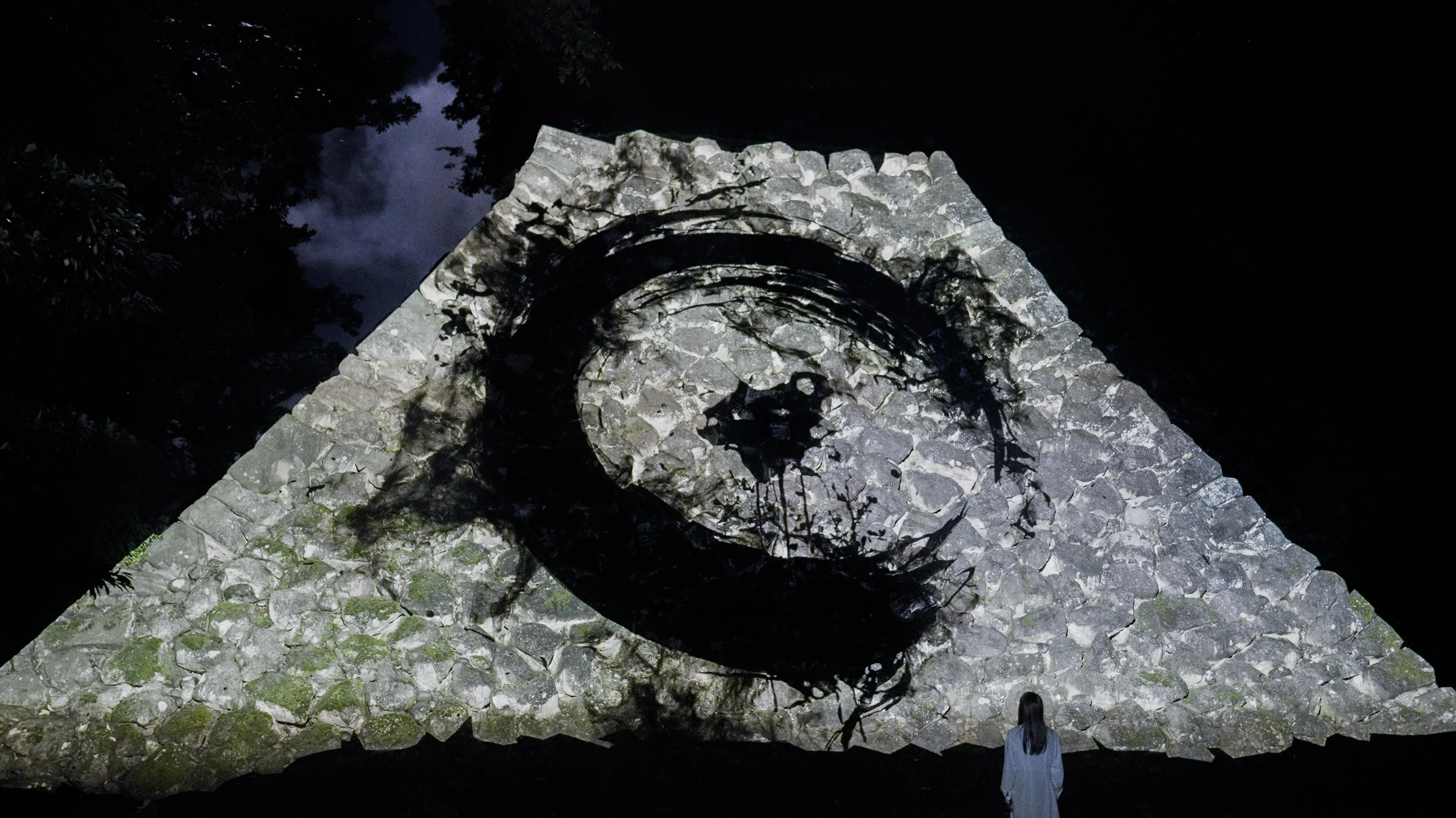 The black lines drawn with light express the absence of light, and cannot be distinguished from the shadows of the stone walls that have been weathered over the past several hundred years. The black calligraphy and the black shadows created by the long passing of time become one, infinitely drawing Enso on the stone walls.