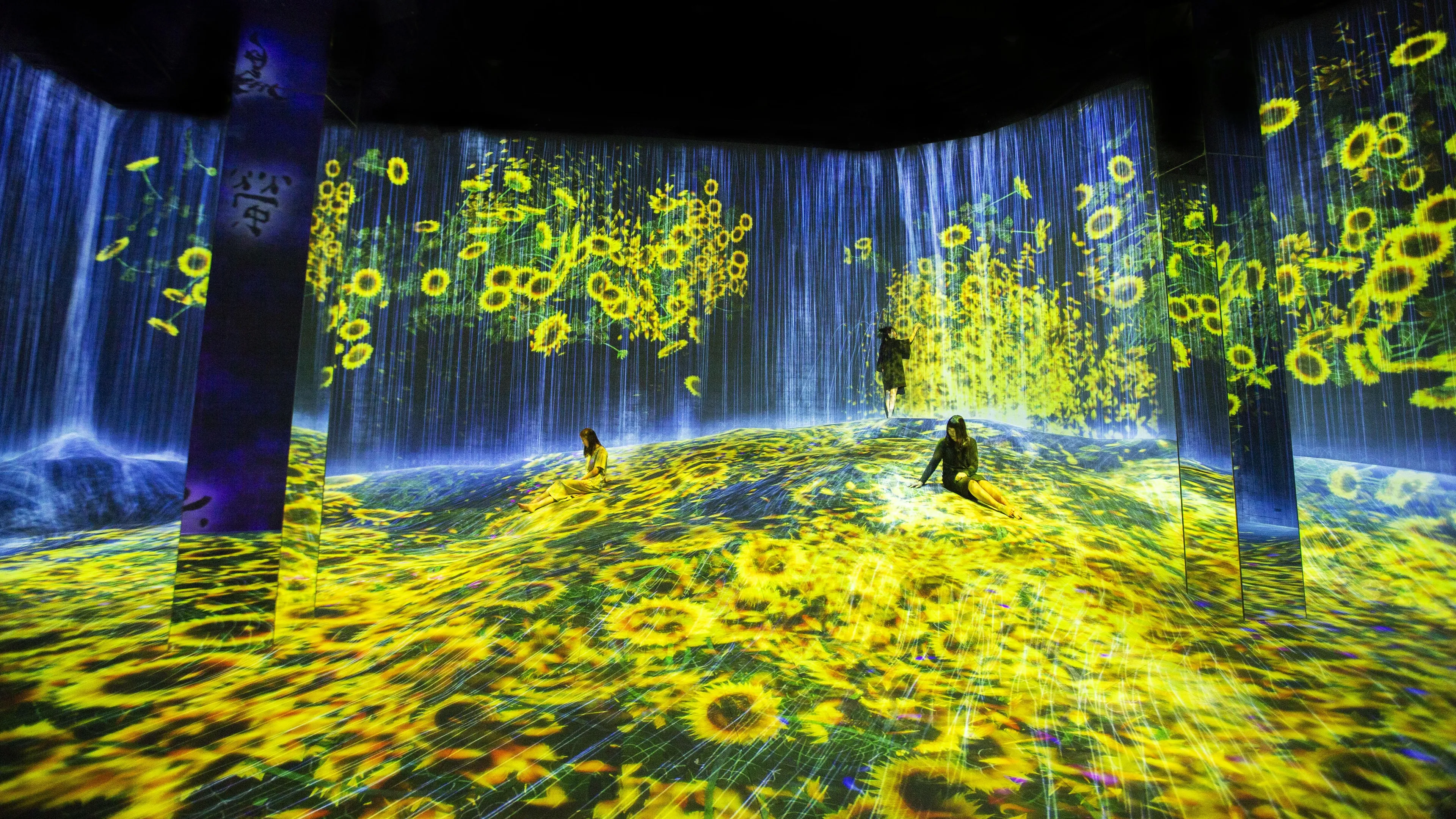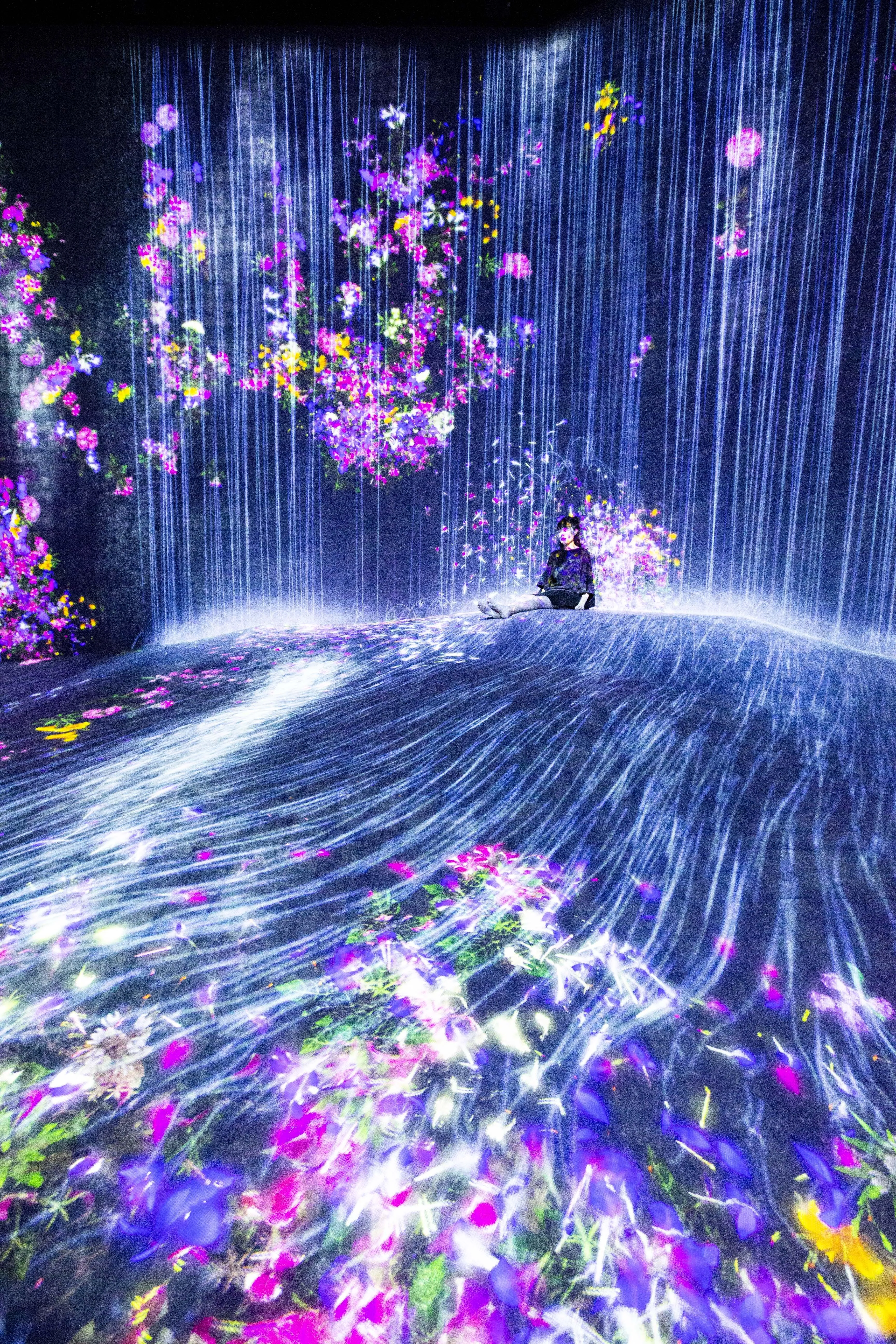 The artwork also influences other works. For example, the flow of water scatters the flowers that grow on the floor and the wall as part of Forest of Flowers and People: Lost, Immersed and Reborn. And the water in this artwork continuously flows into The Columns below, adding to the water there.