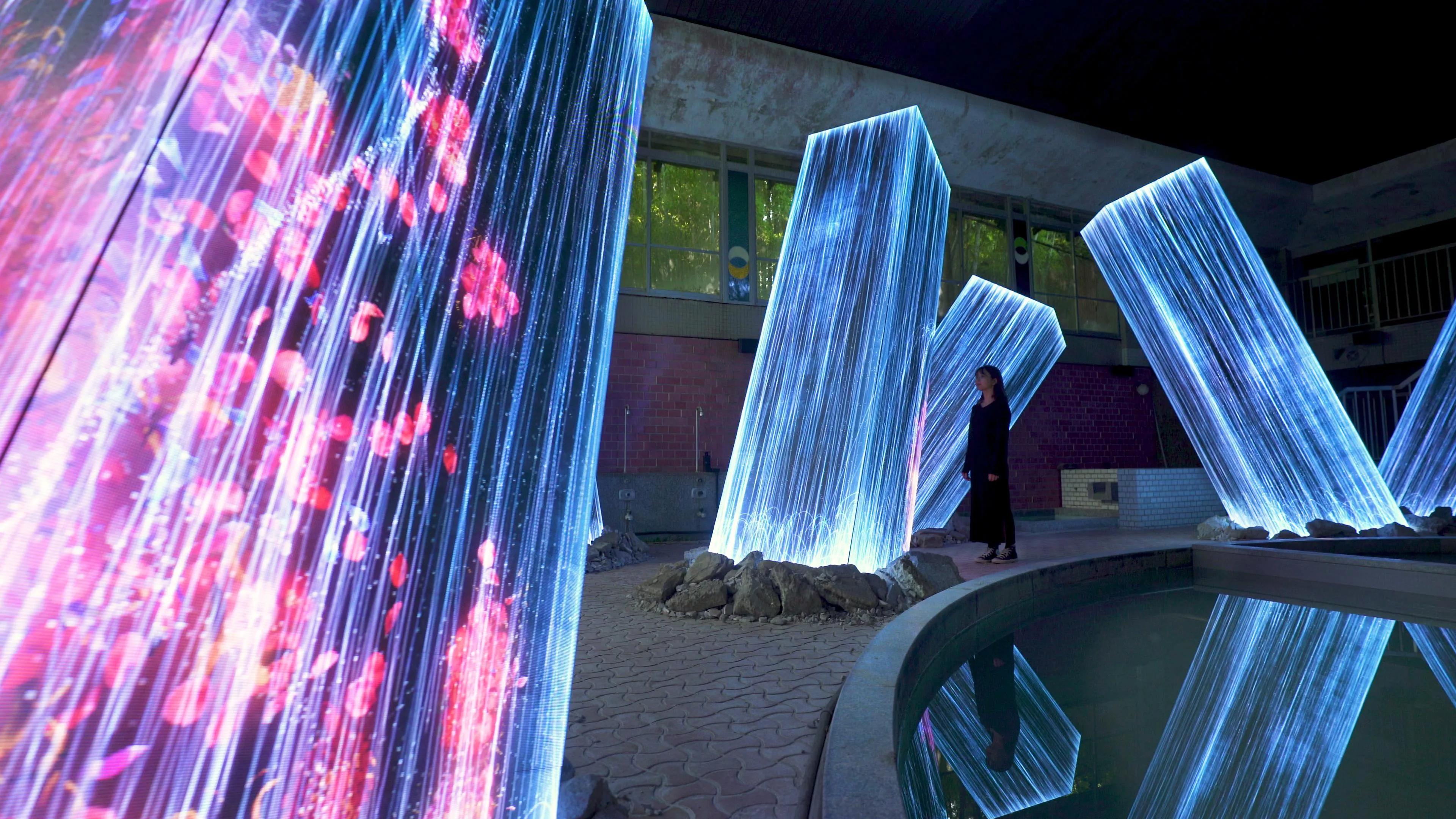 This artwork is in a state of continuous change. Over a period of one hour, a year’s worth of seasonal flowers blossoms and scatters. The flowers bud, grow, and blossom before their petals begin to wither and eventually fade away. The cycle of growth and decay repeats itself in perpetuity. If a person stays still, the flowers surrounding them grow and bloom more abundantly.