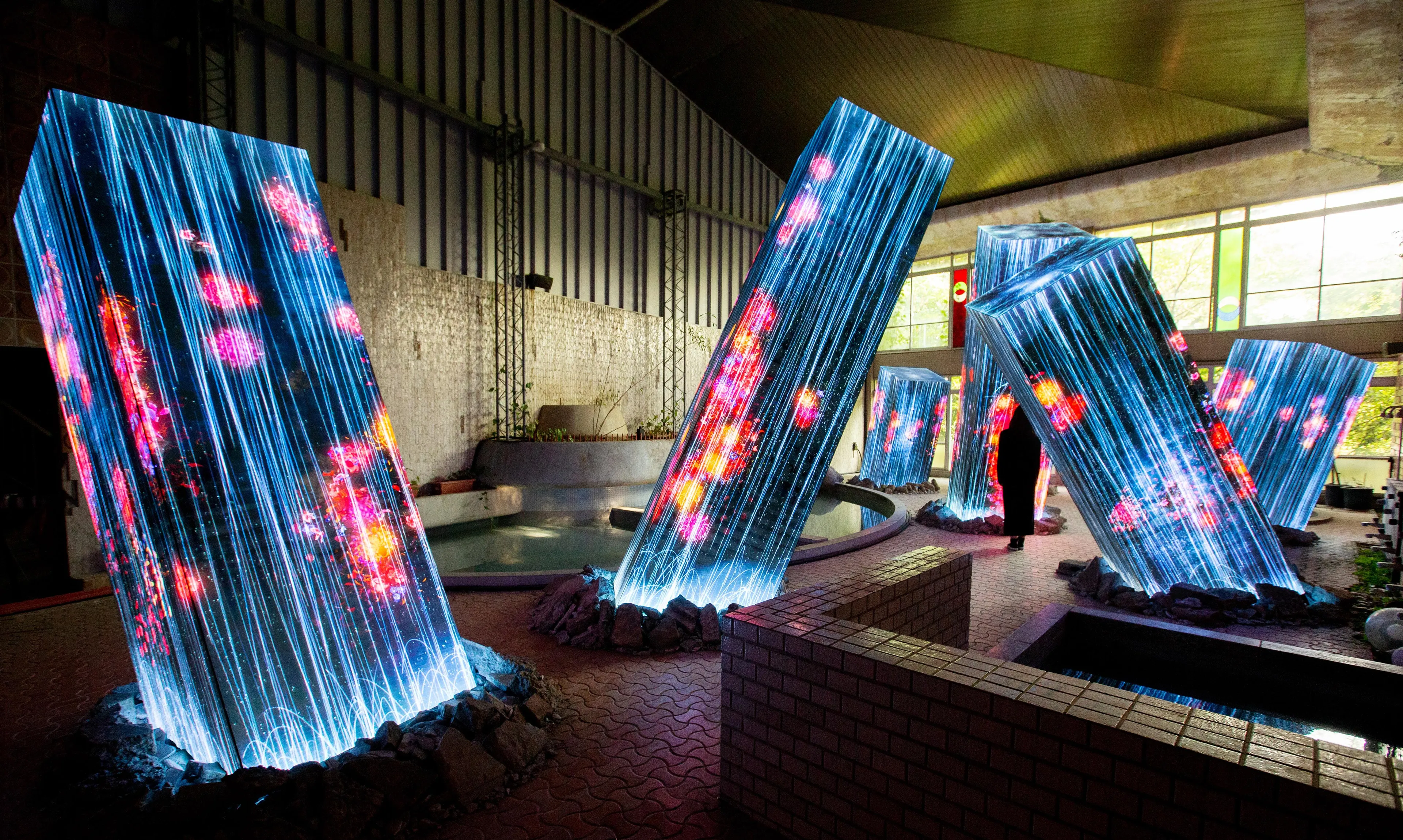 Water is represented by a continuum of numerous water particles. The interaction between the particles is calculated and then lines are drawn in relation to the behavior of the water particles. The lines are “flattened” using what teamLab considers to be ultrasubjective space.
