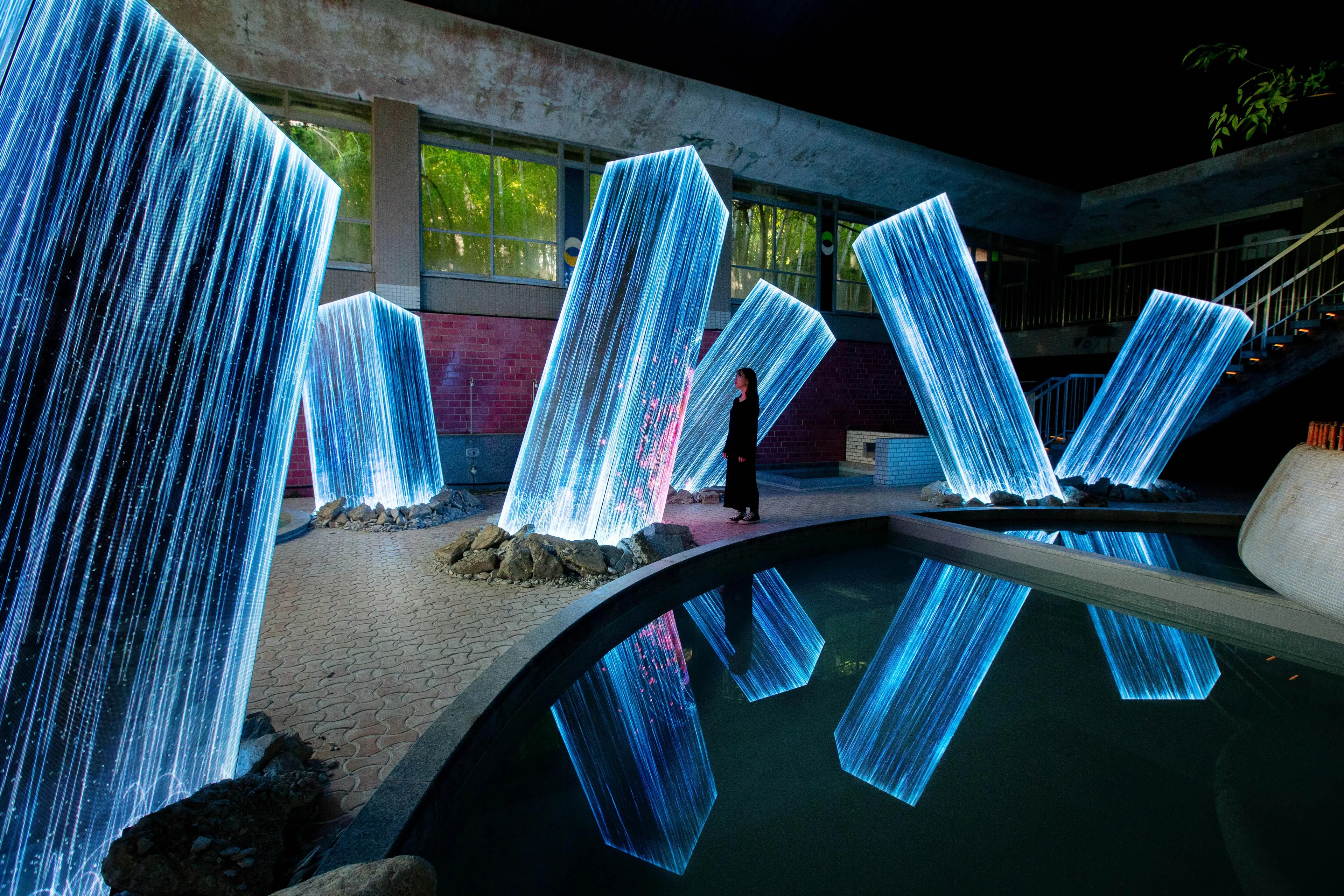 When people approach the artwork, the flow of the water changes. The movement of people influences the artwork, causing it to evolve continuously, while the artwork influences other works. For instance, the water causes the flowers in the work Flowers and People to scatter.