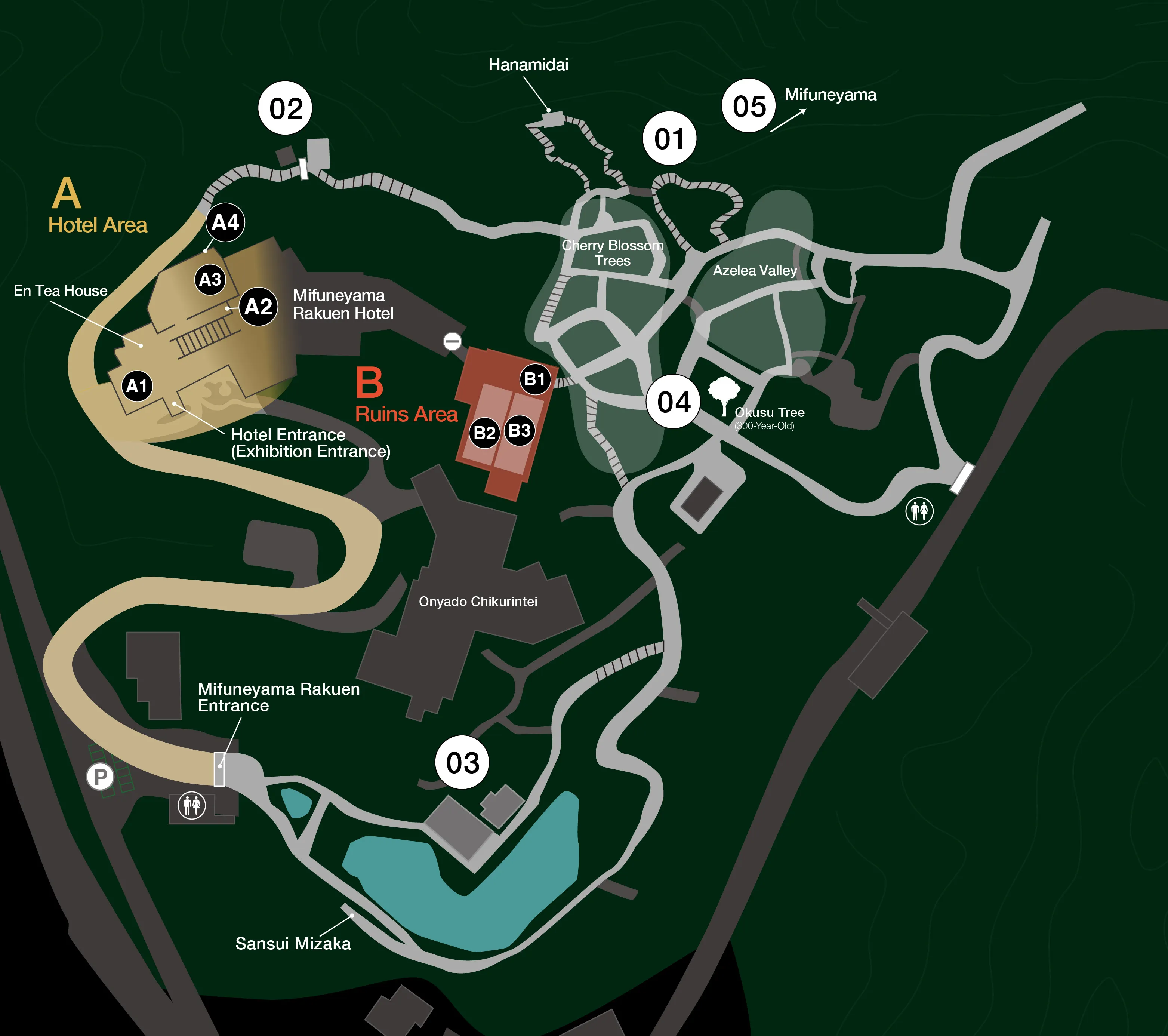 The 500,000 square meter Mifuneyama Rakuen Park was created in 1845, during the end of the Edo period. Sitting on the borderline of the park is the 3,000-year-old sacred Okusu tree of Takeo Shrine, which is Japan’s 7th largest. Also in the heart of the garden is another 300-year-old sacred tree. Knowing the significance of this, our forebears turned a portion of this forest into a garden, utilizing the trees of the natural forest. The border between the garden and the wild forest is ambiguous, and when wandering through the garden, before they know it, people will find themselves entering the woods and animal trails.