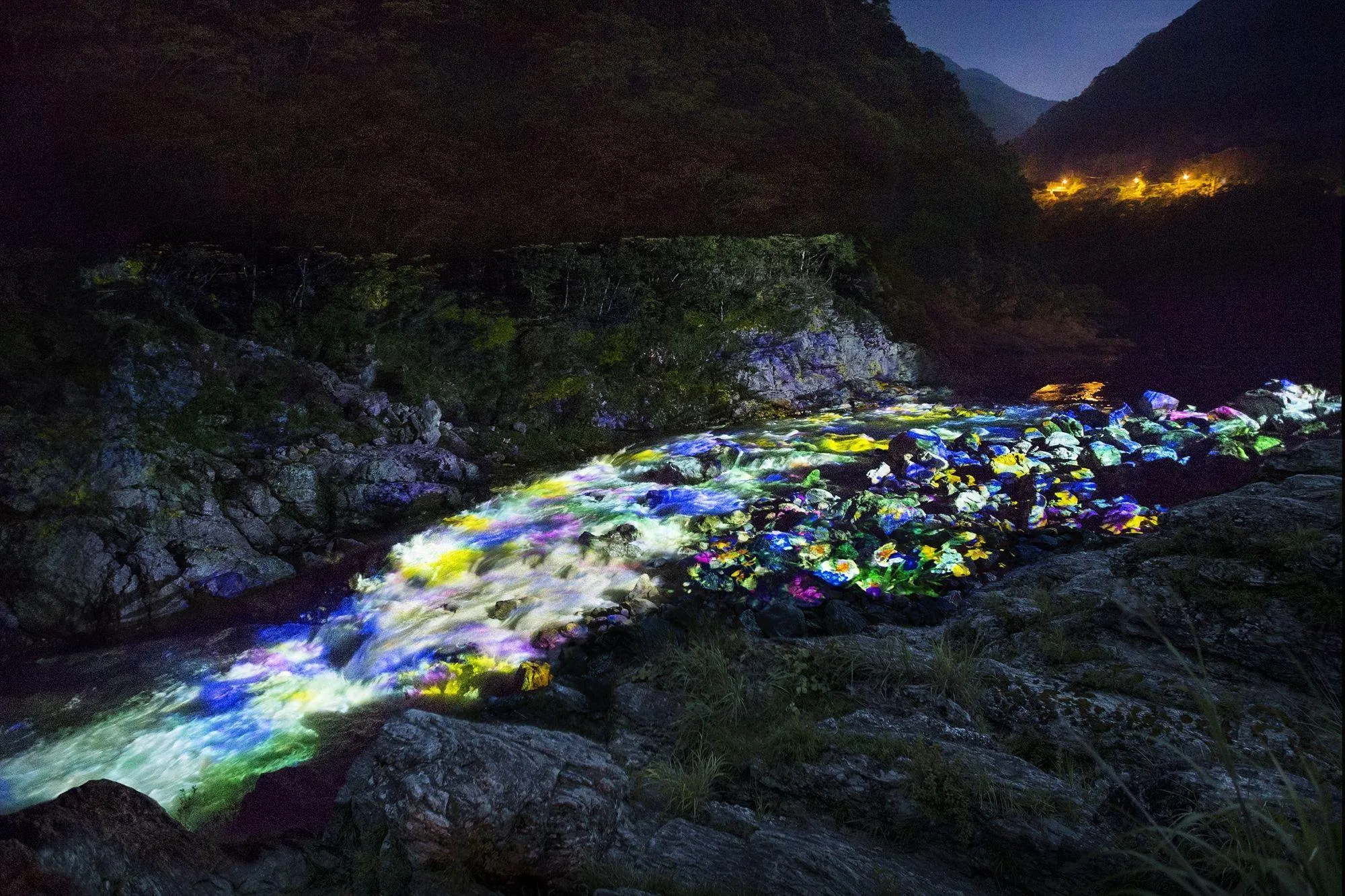 This artwork consists of a waterfall projected onto a sheer cliff, and flowers projected onto the river of Koboke gorge that flows beneath it.