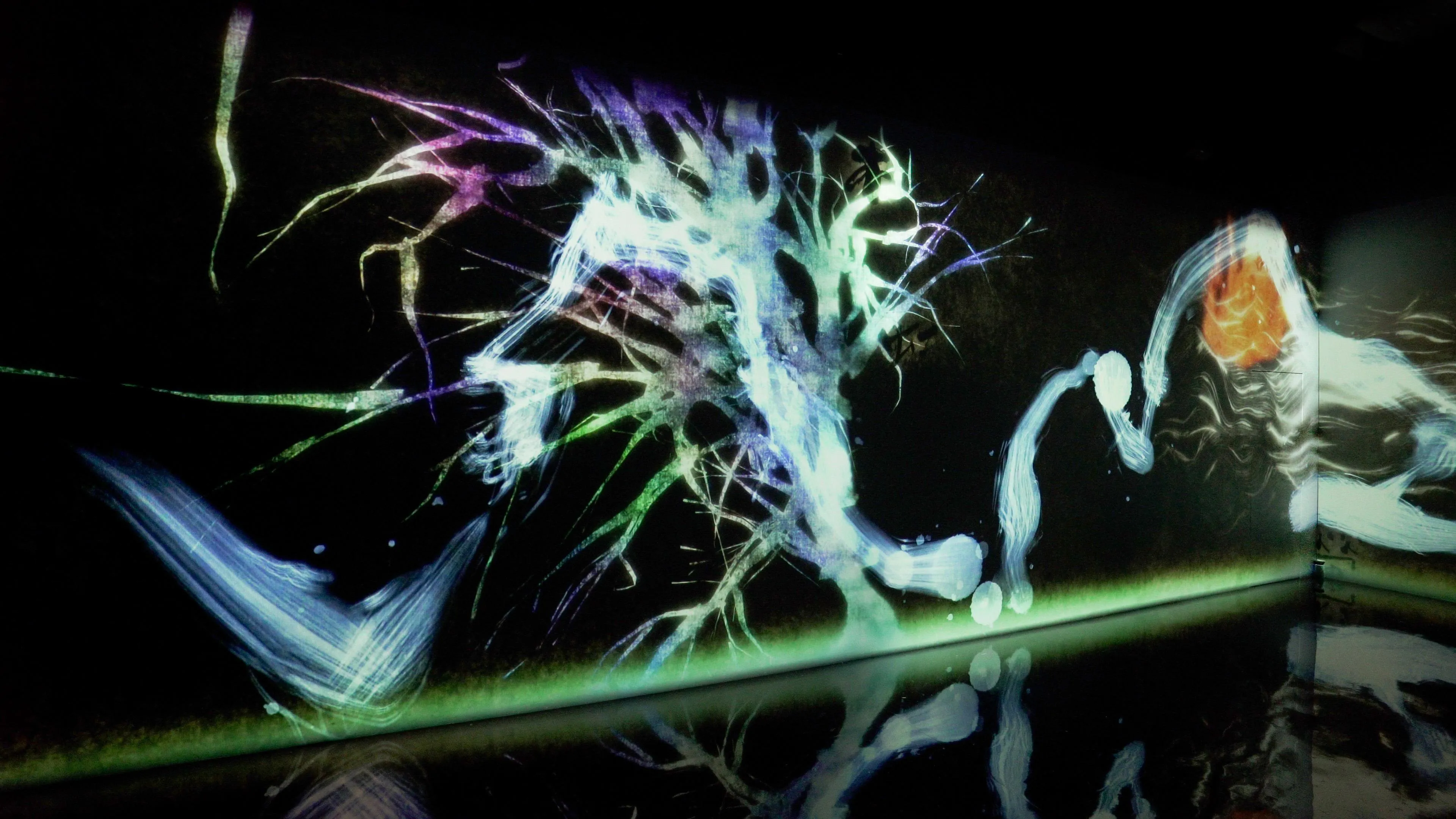 The monitor Spatial Calligraphy artwork Reversible Rotation transcends the boundaries of the display and draws across the entire space with a single stroke. This single stroke influences other artworks: it causes the flowers in Forest of Flowers and People: Lost, Immersed and Reborn to scatter.