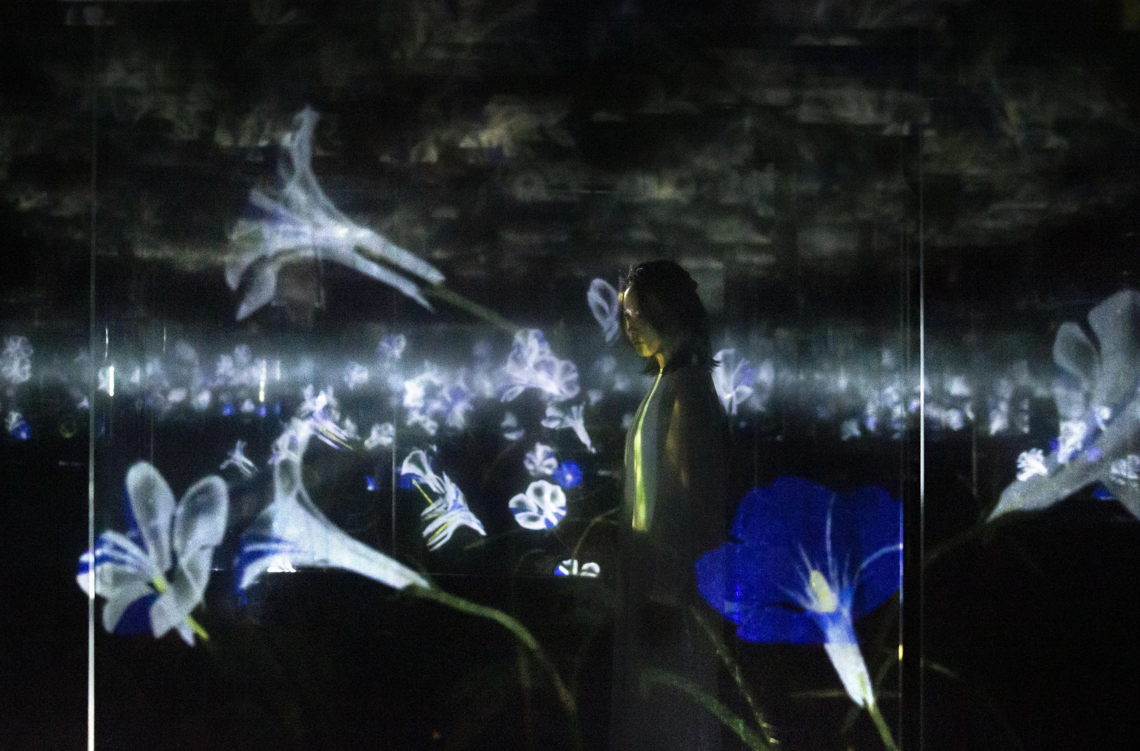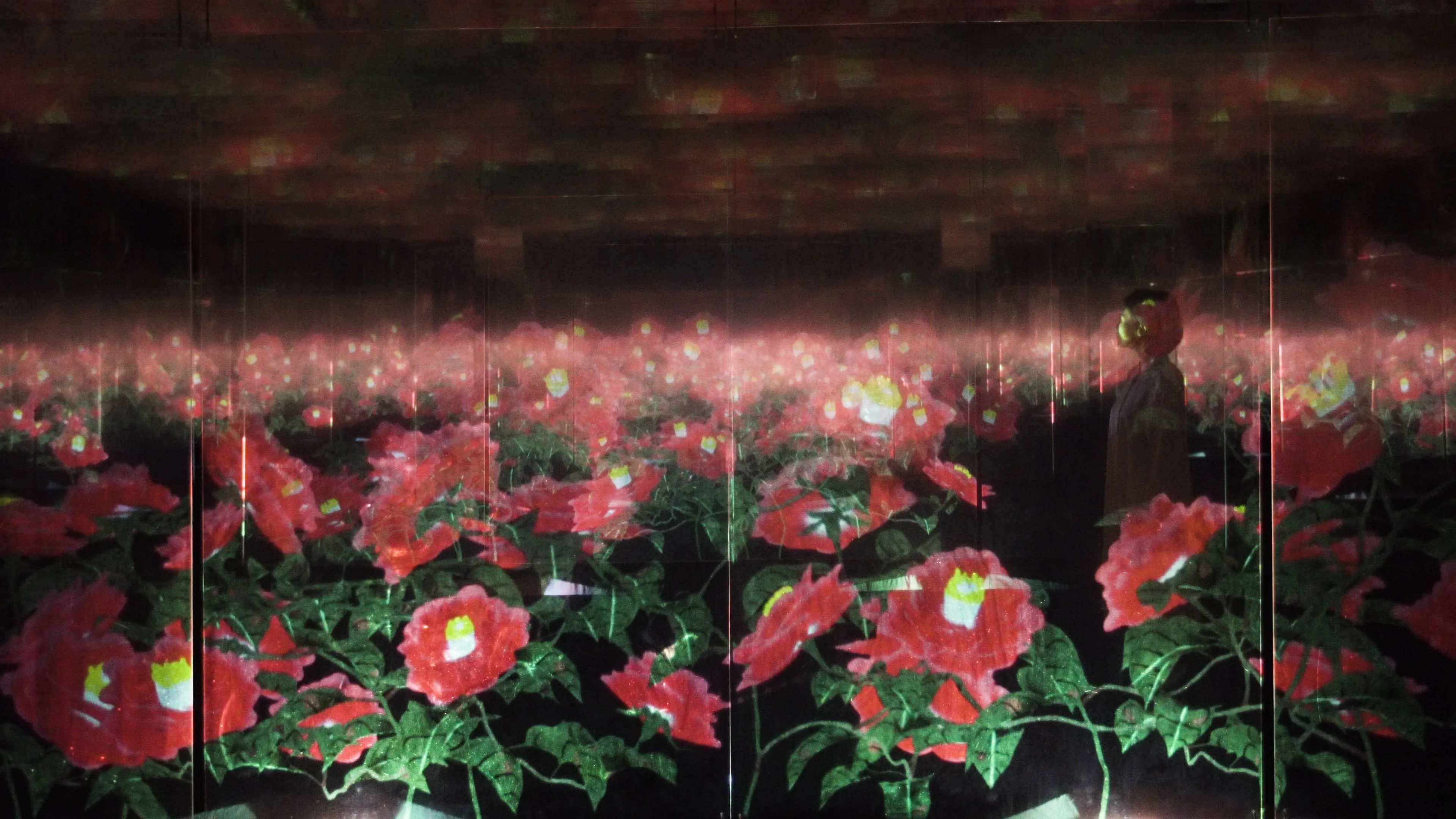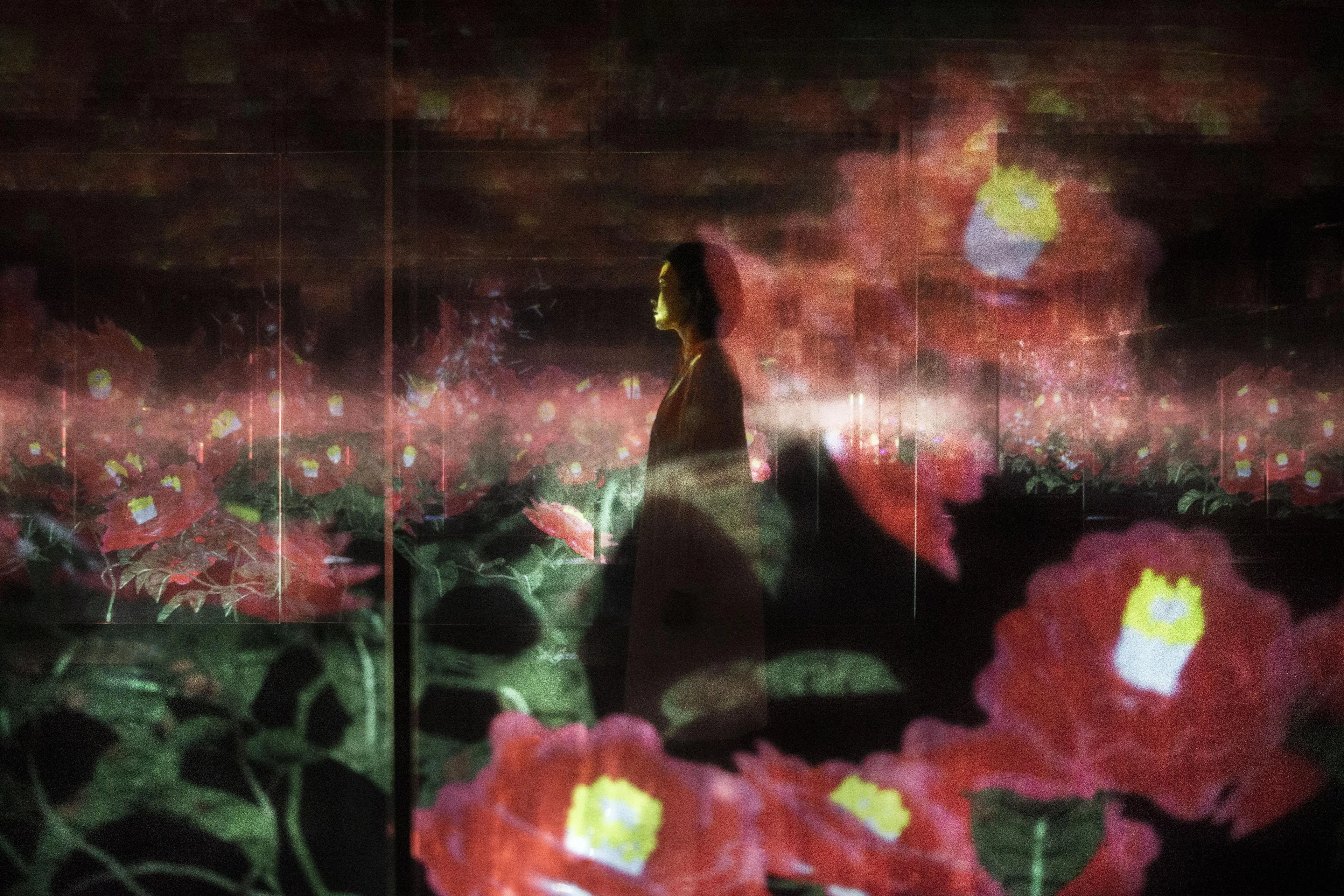 When a person is seen across the screens, layered with the flowers, the person appears as though they themself exist in the artwork world of the flowers. In other words, a person seen across the screens will become one not only with the exhibition space, but with the artwork world as well.