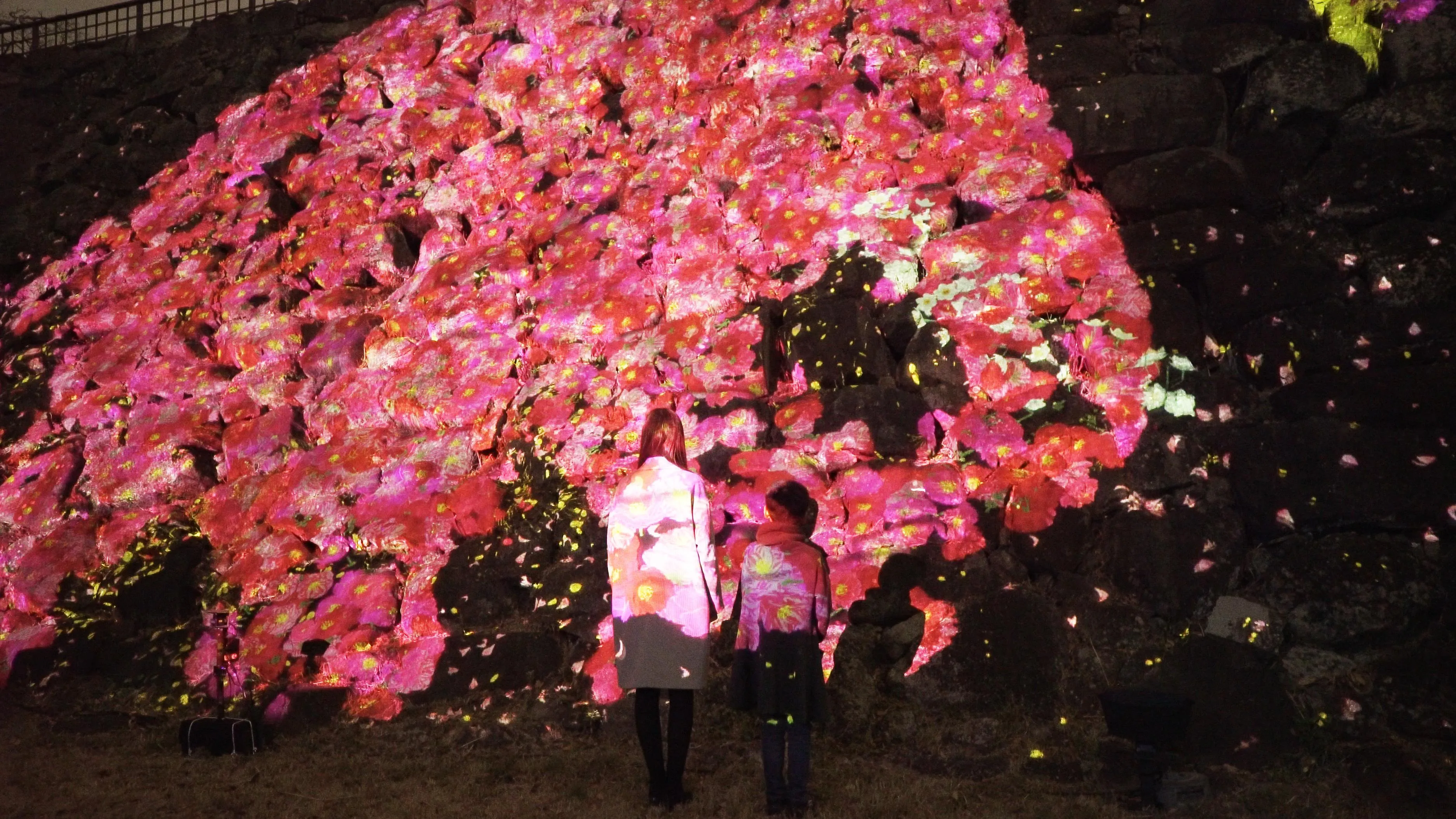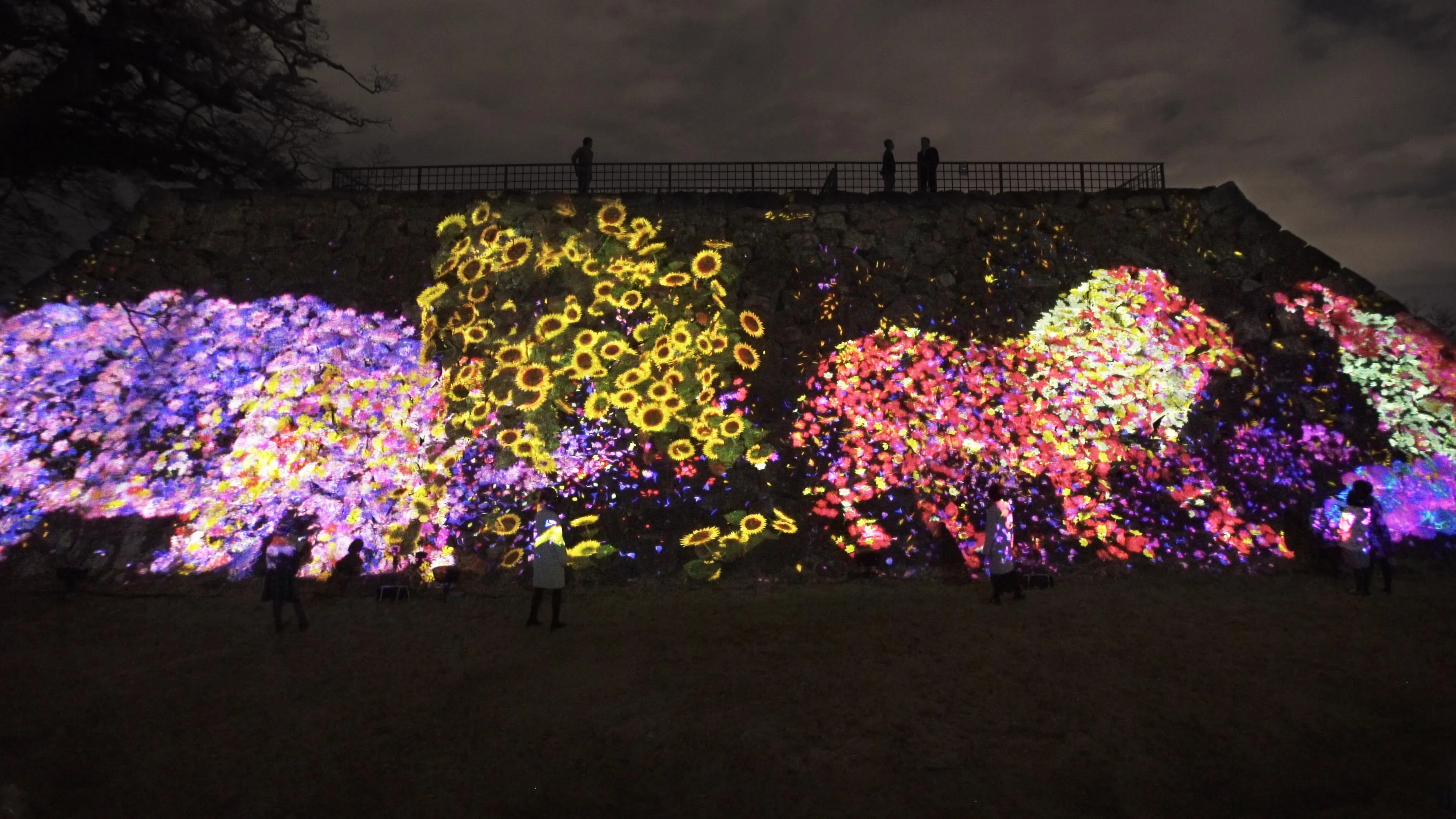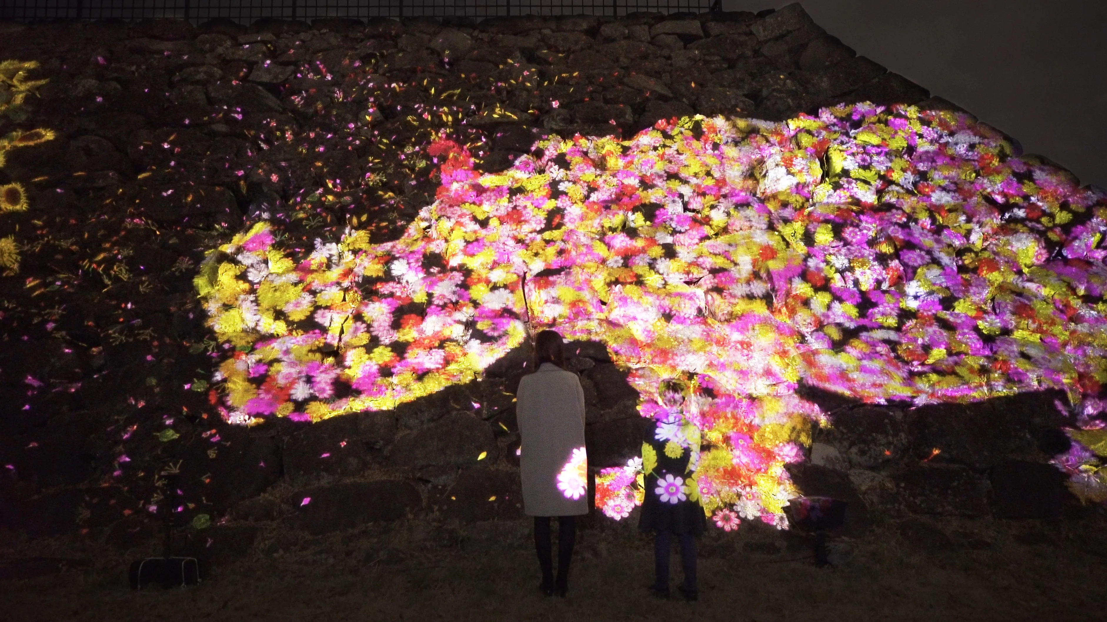 Flowers grow from the bodies of animals that inhabit the 60m long, 10m high stone walls of Fukuoka Castle ruins.
