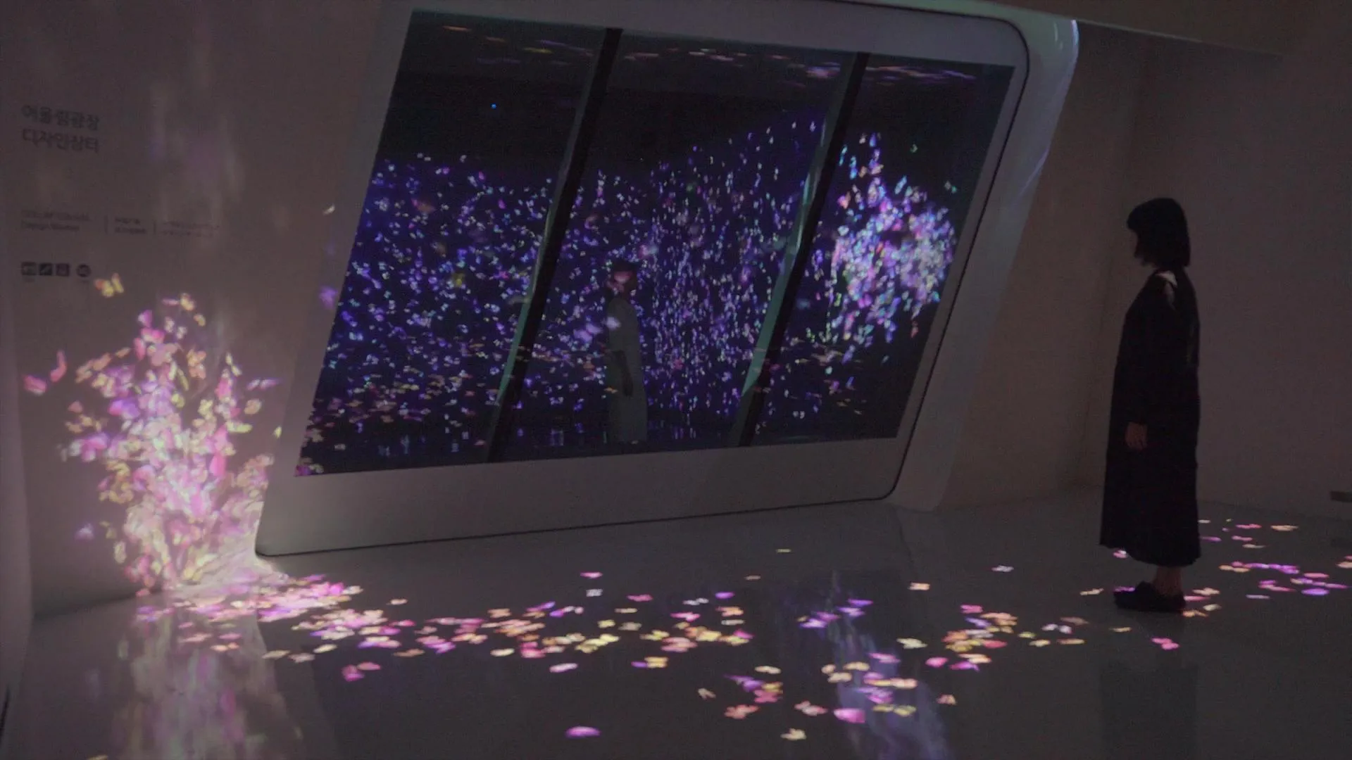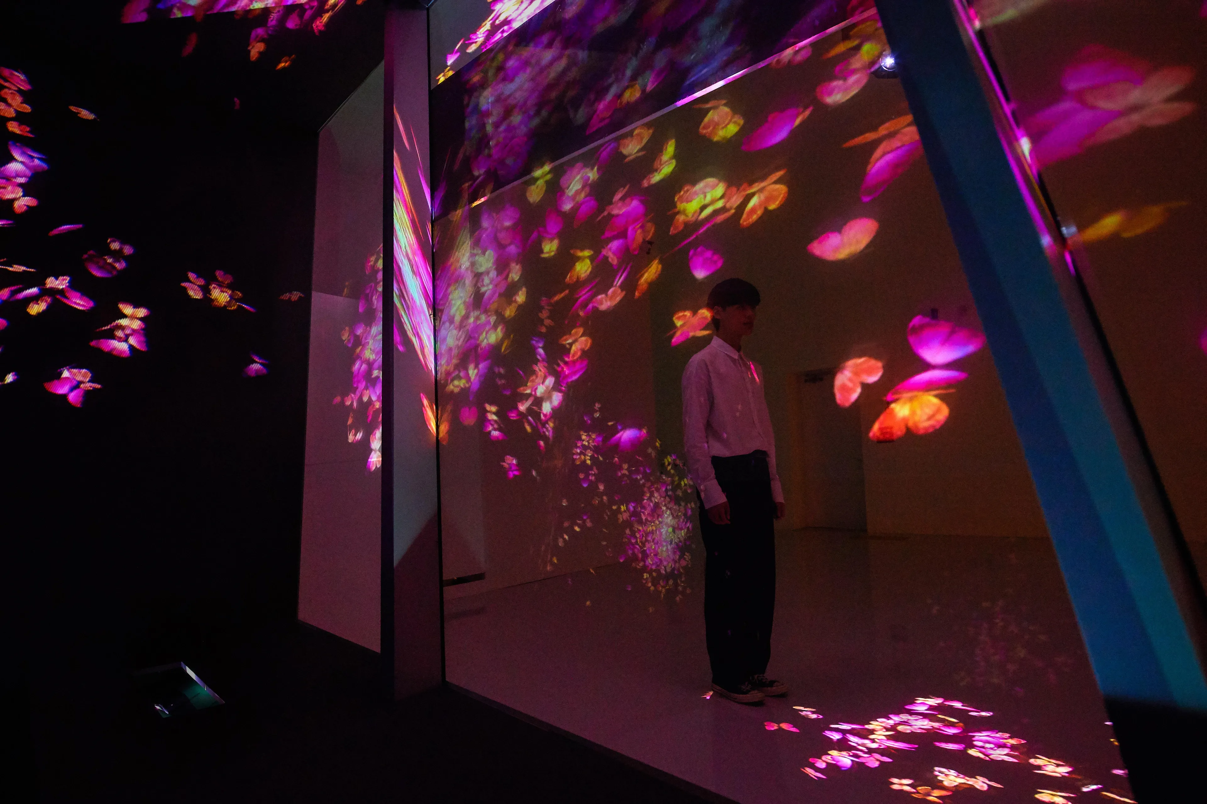 A flutter of butterflies. As people pass through the space on the other side of the glass, outside of the exhibition, butterflies are born from beneath their feet. The flutter of butterflies dance in the space, transcend the boundary created by the glass, and enter the exhibition. When people touch them, the butterflies die.