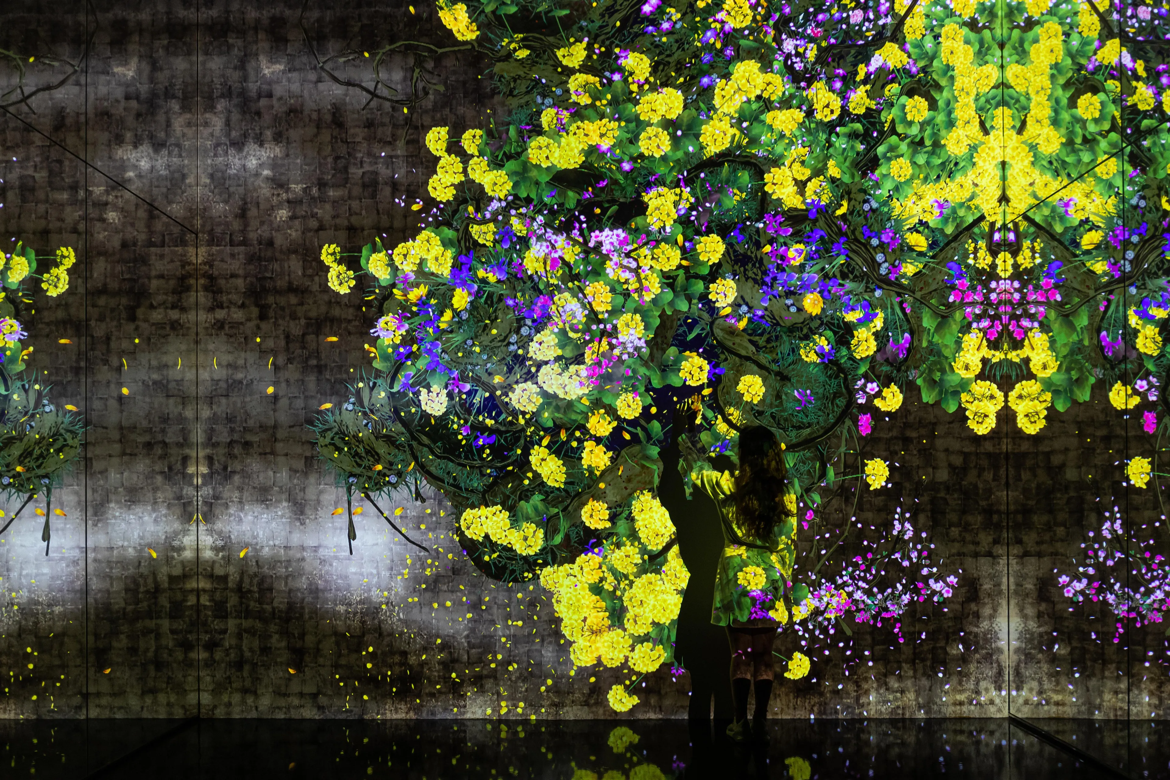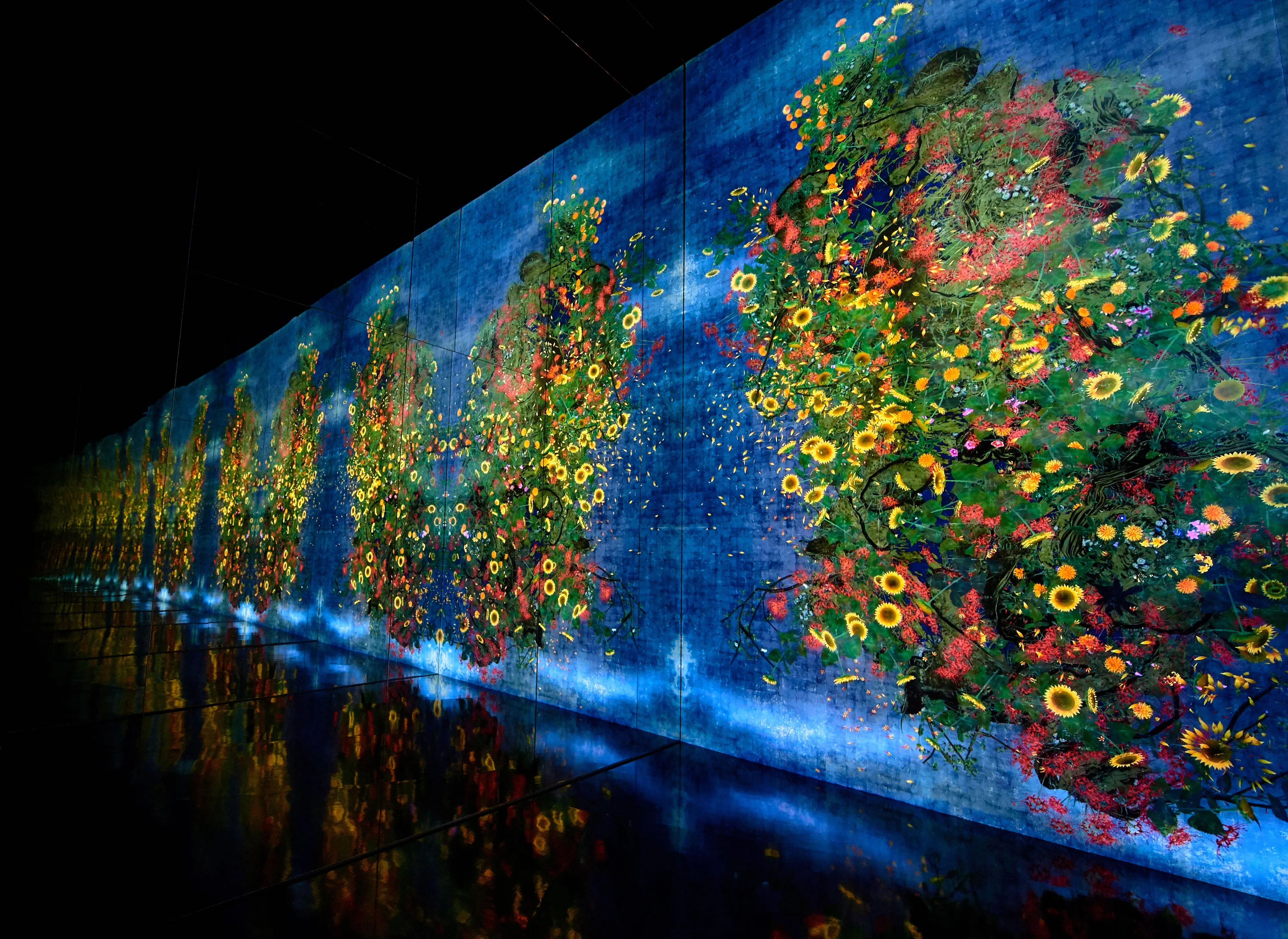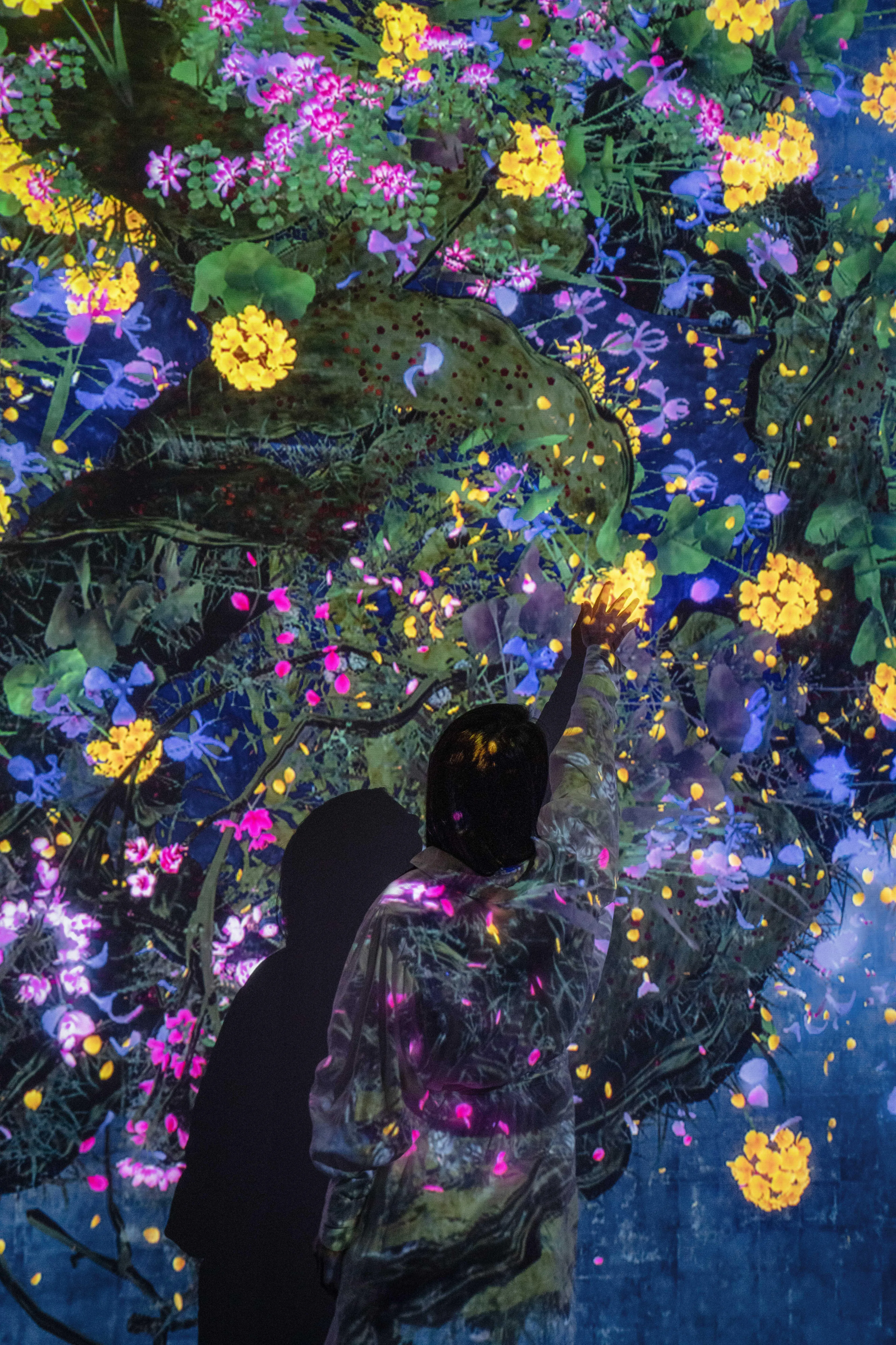 Flowers continue to blossom and die in an eternal cycle, the blooms changing with the passage of time in nearby artworks. When people touch the flowers, their petals scatter. But if people hold their hands still against the work, more flowers will be born than usual.