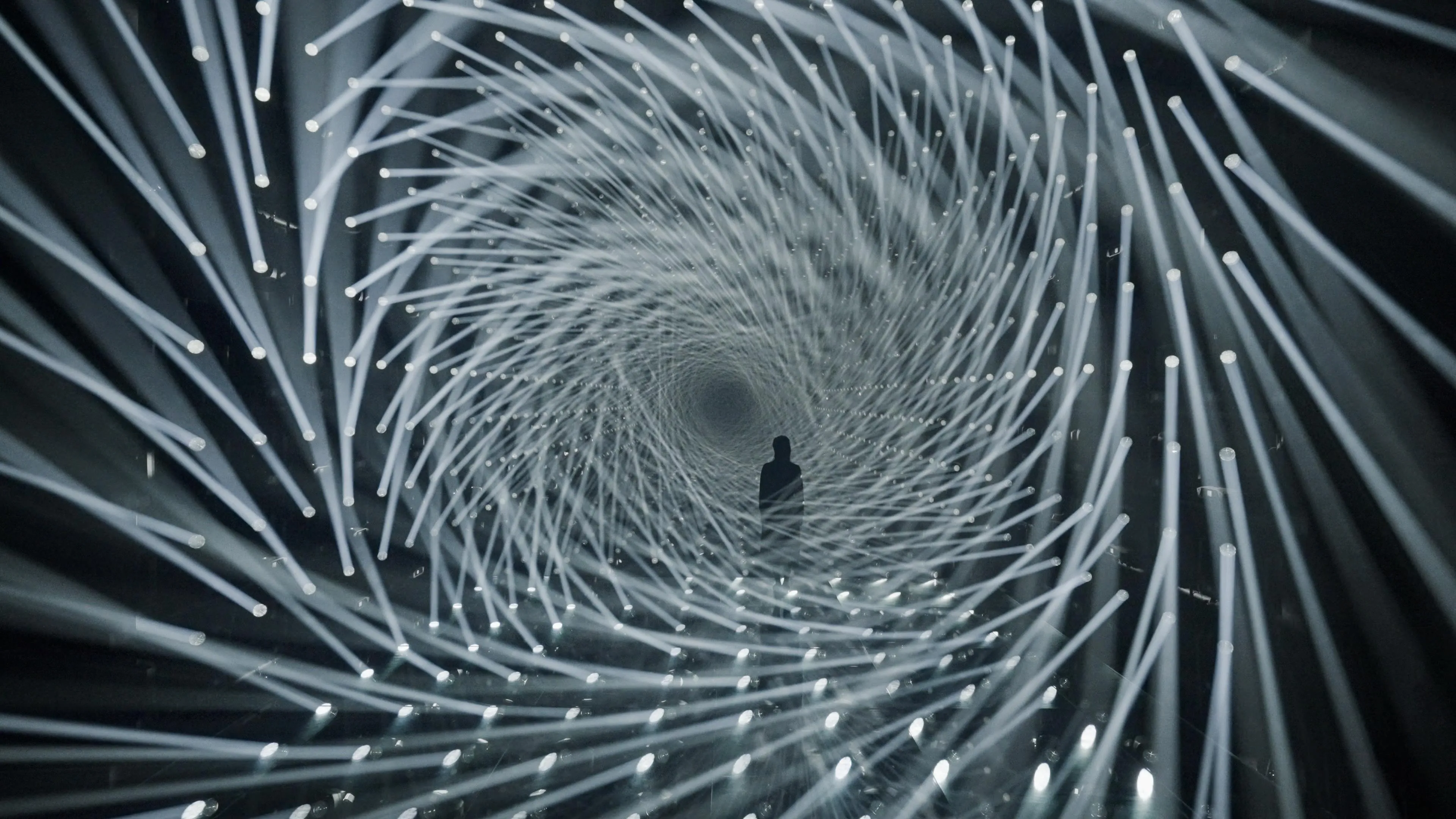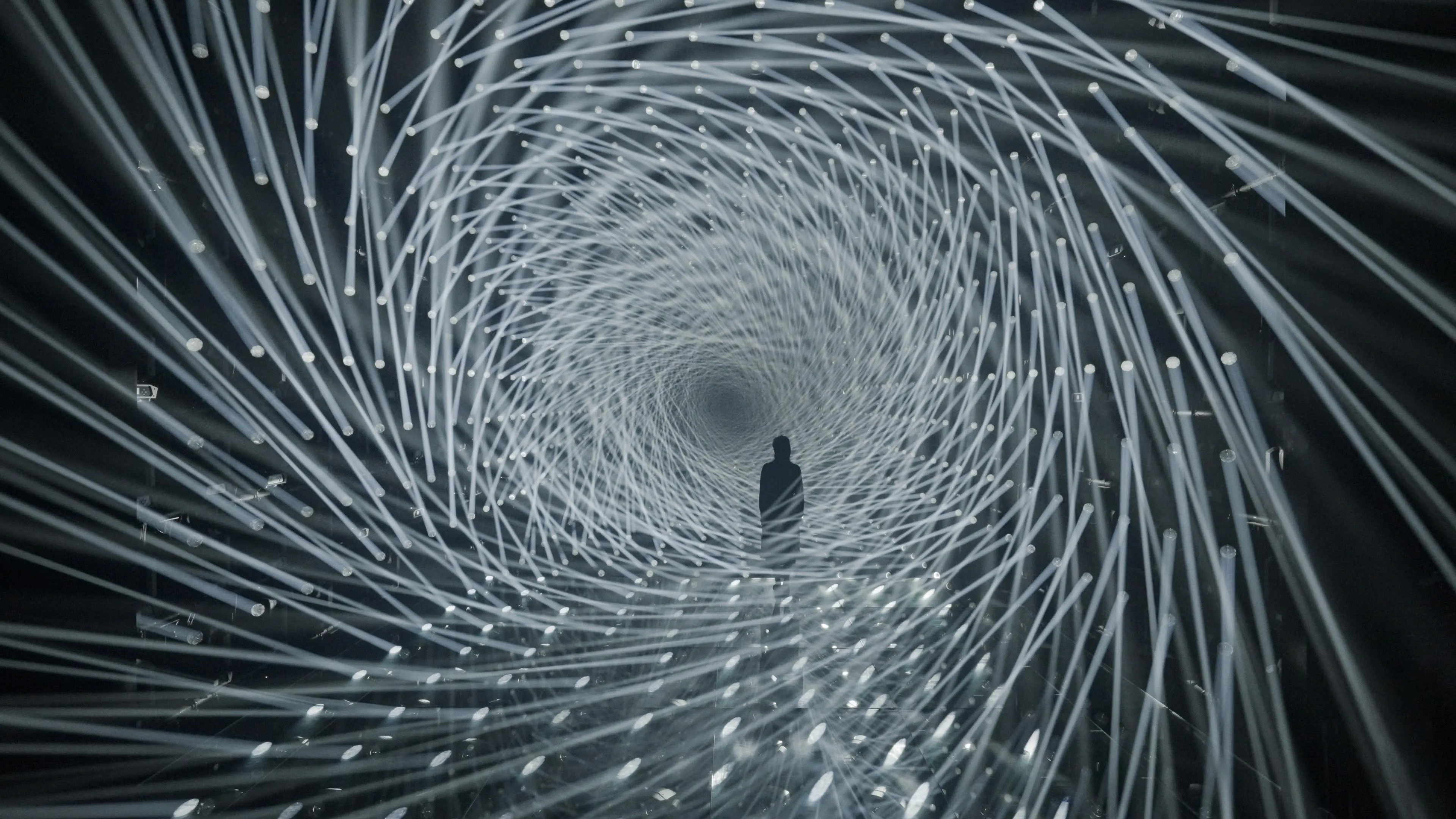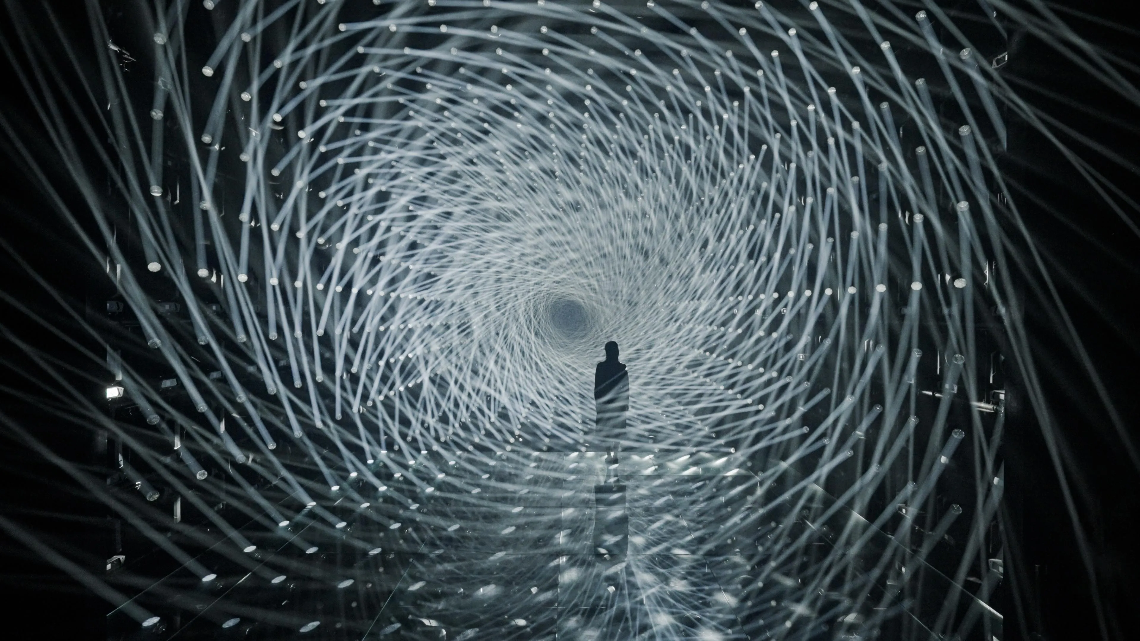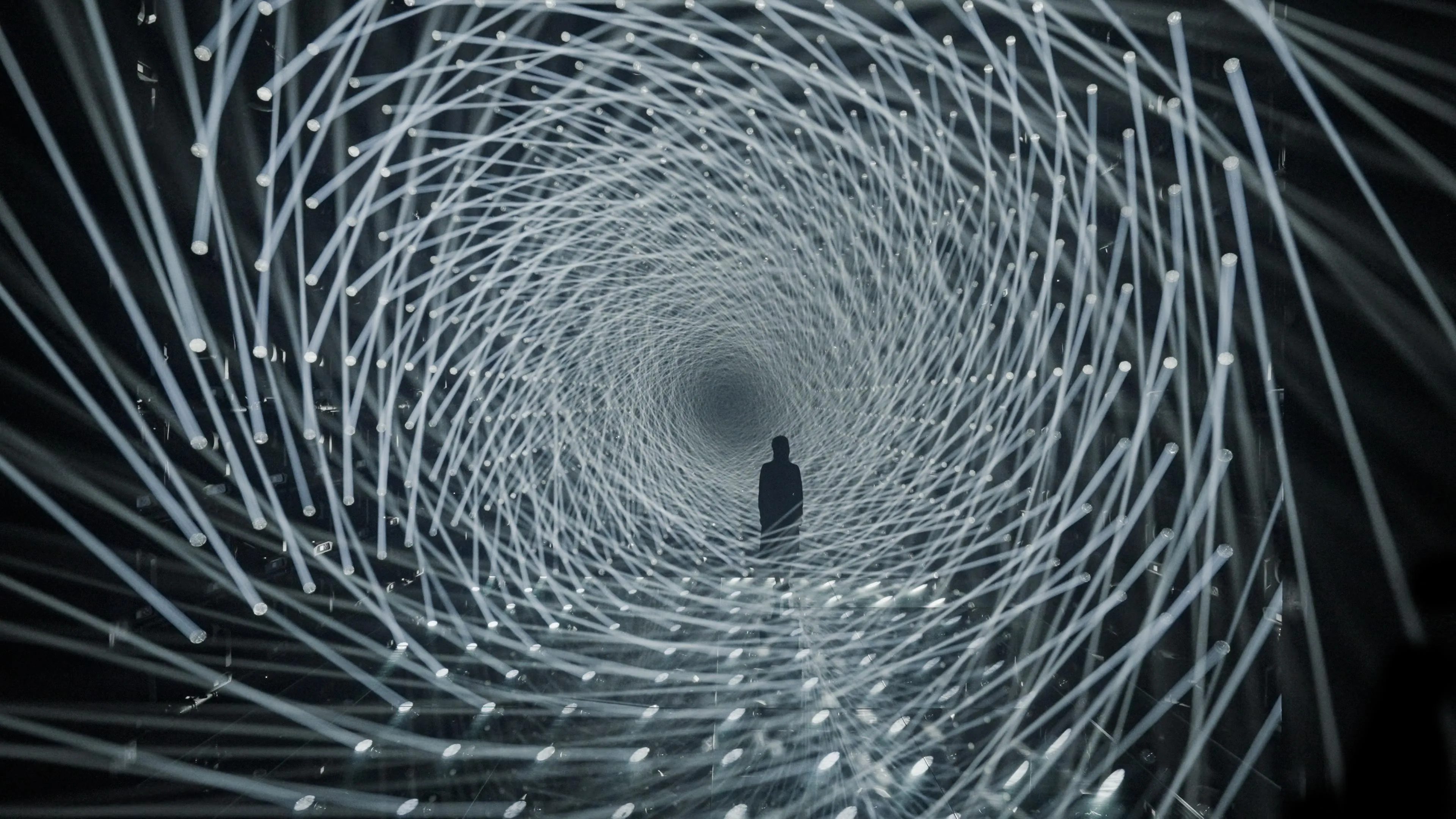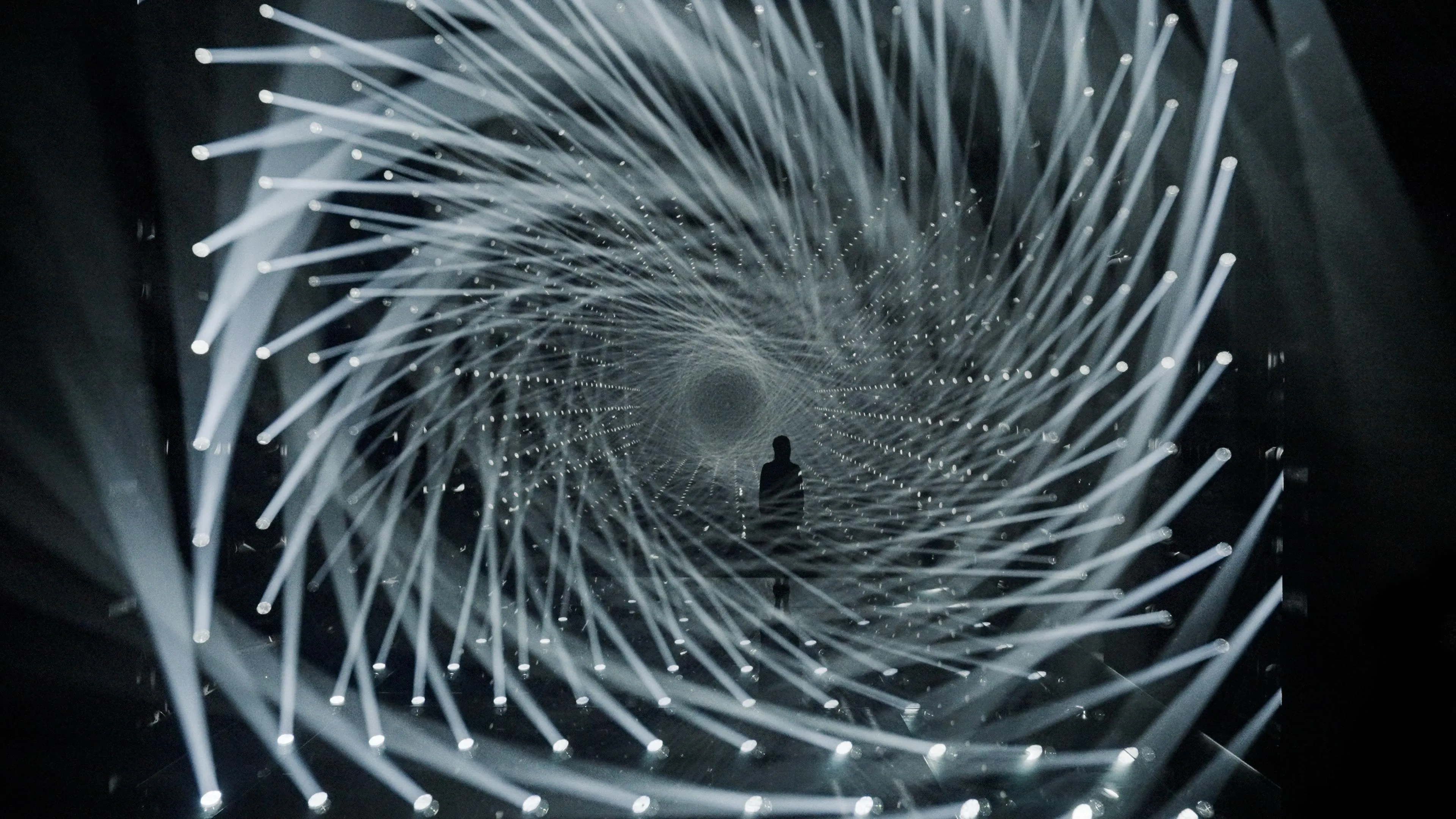 A sculpture made of light that continues to flow outward. The flowing light gathers and creates order in the center, and a biocosmos appears.