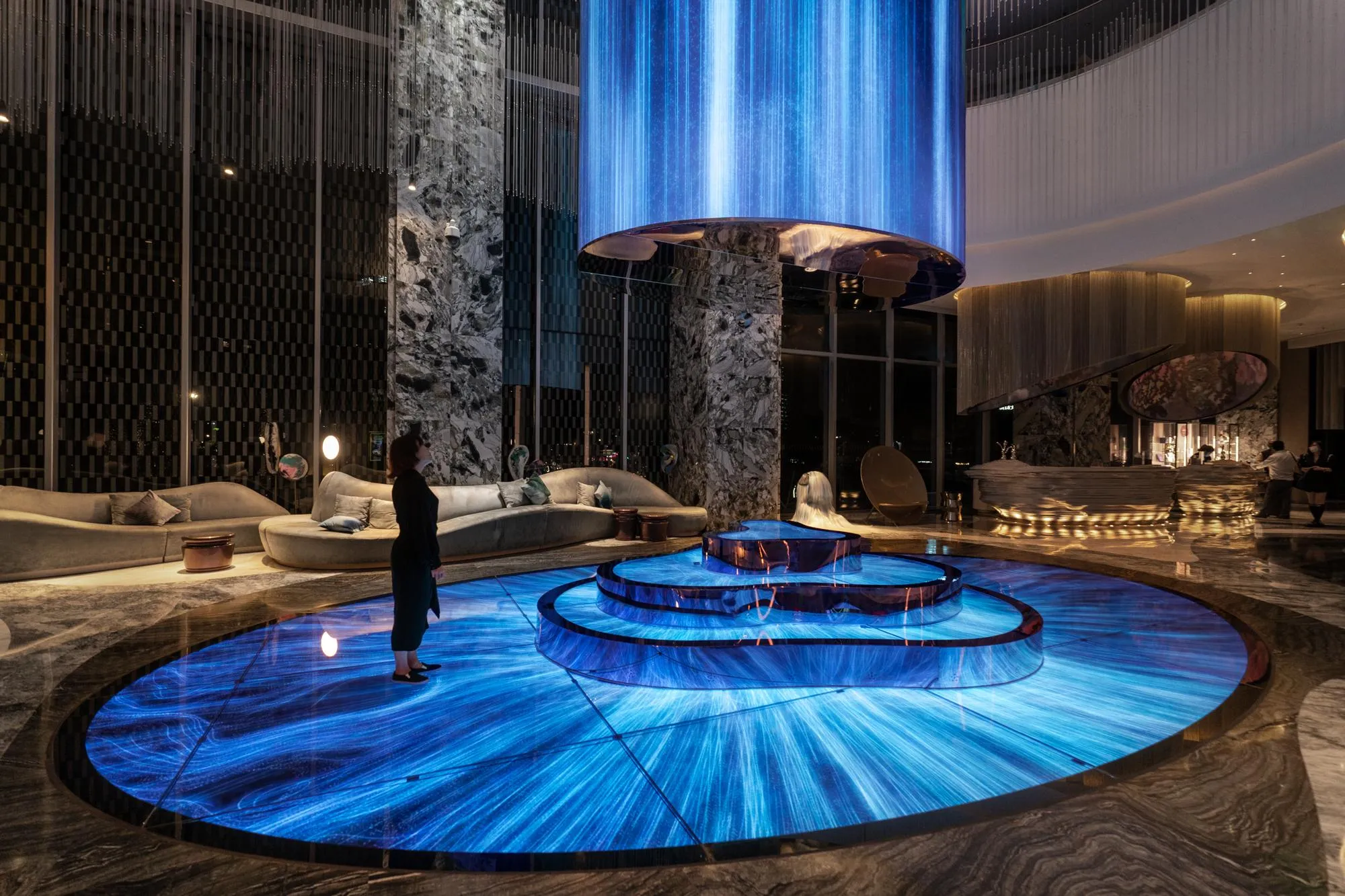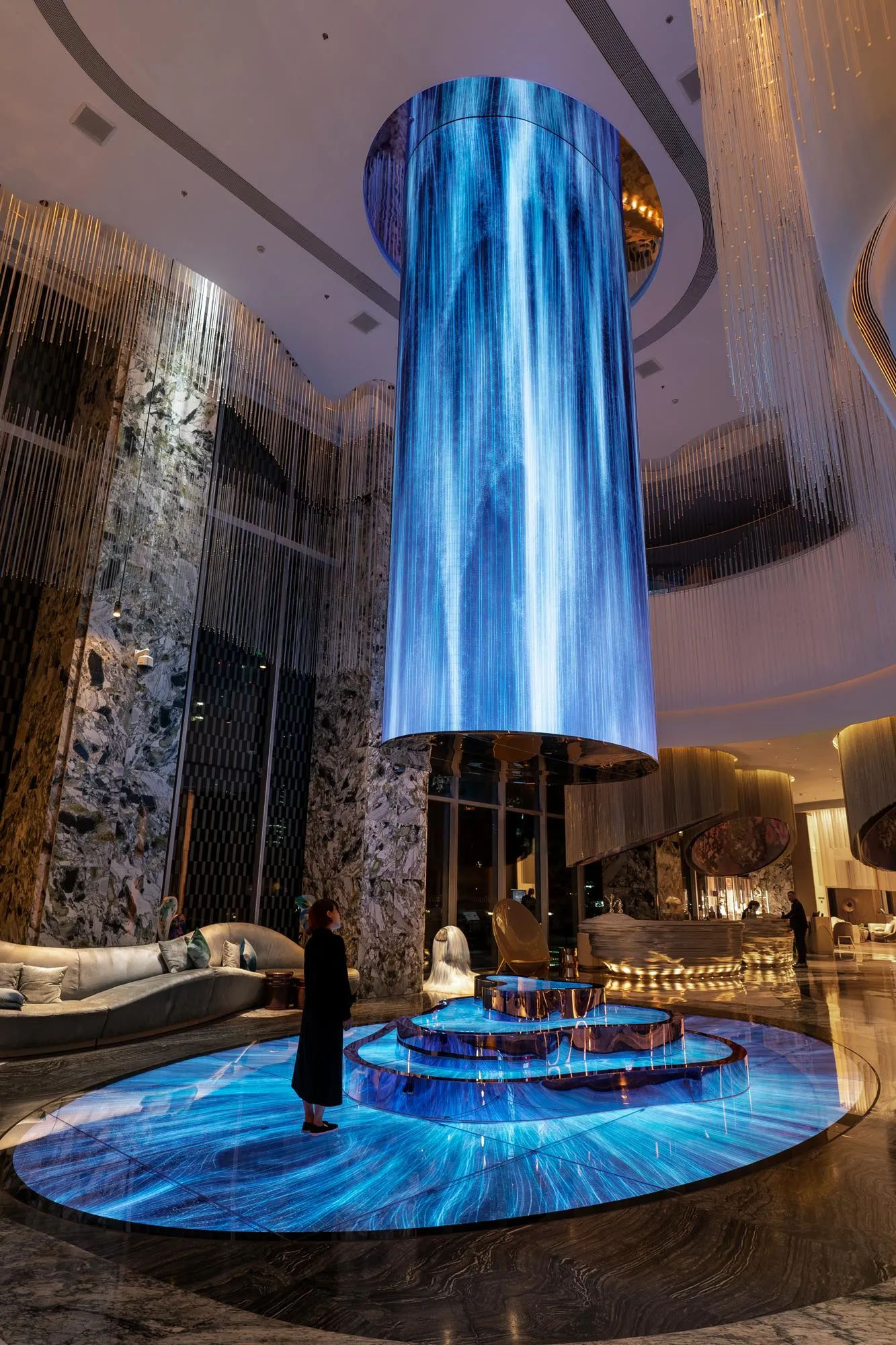 Water is represented as a continuum of numerous water particles. The interaction between the particles is calculated, and lines are drawn in relation to the behavior of the water particles. The lines are “flattened” using what teamLab considers to be ultrasubjective space.