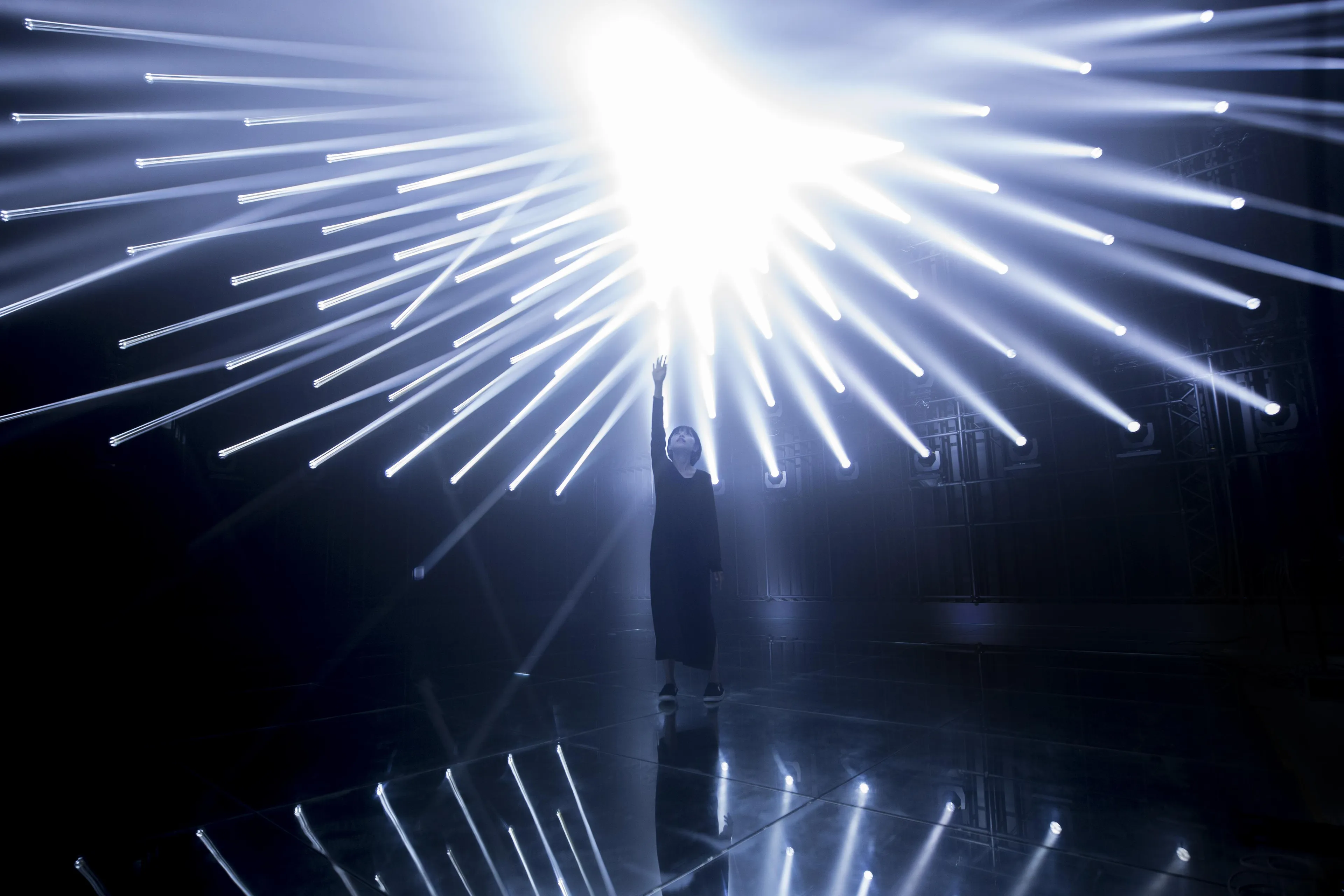 Light Sculpture - Line series. Reconstruction of space and three-dimensional objects with light lines. The space and three-dimensional objects move, wrapping around the body of people in the space, and immersing the body.