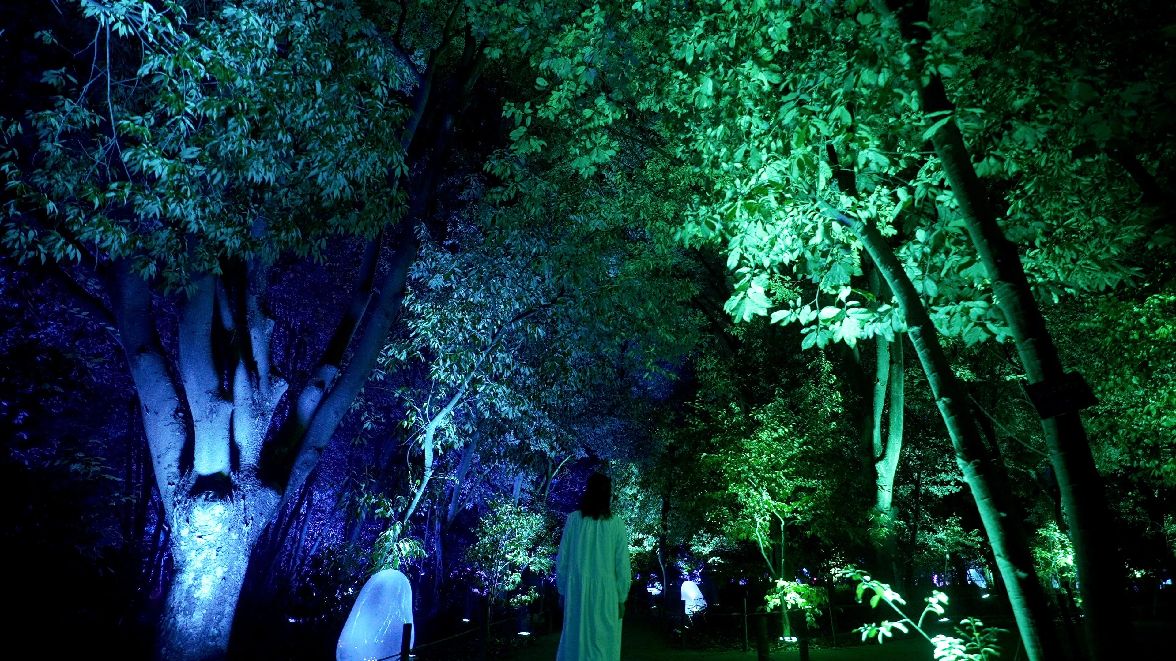 The light transmitted from Resonating Microcosms in the Common Camellia Garden - Liquified Light Color causes the trees’ lights to change color and produce a tone specific to that color. The tree’s light spreads to the surrounding trees one by one, continuously resonating with  the same tone.