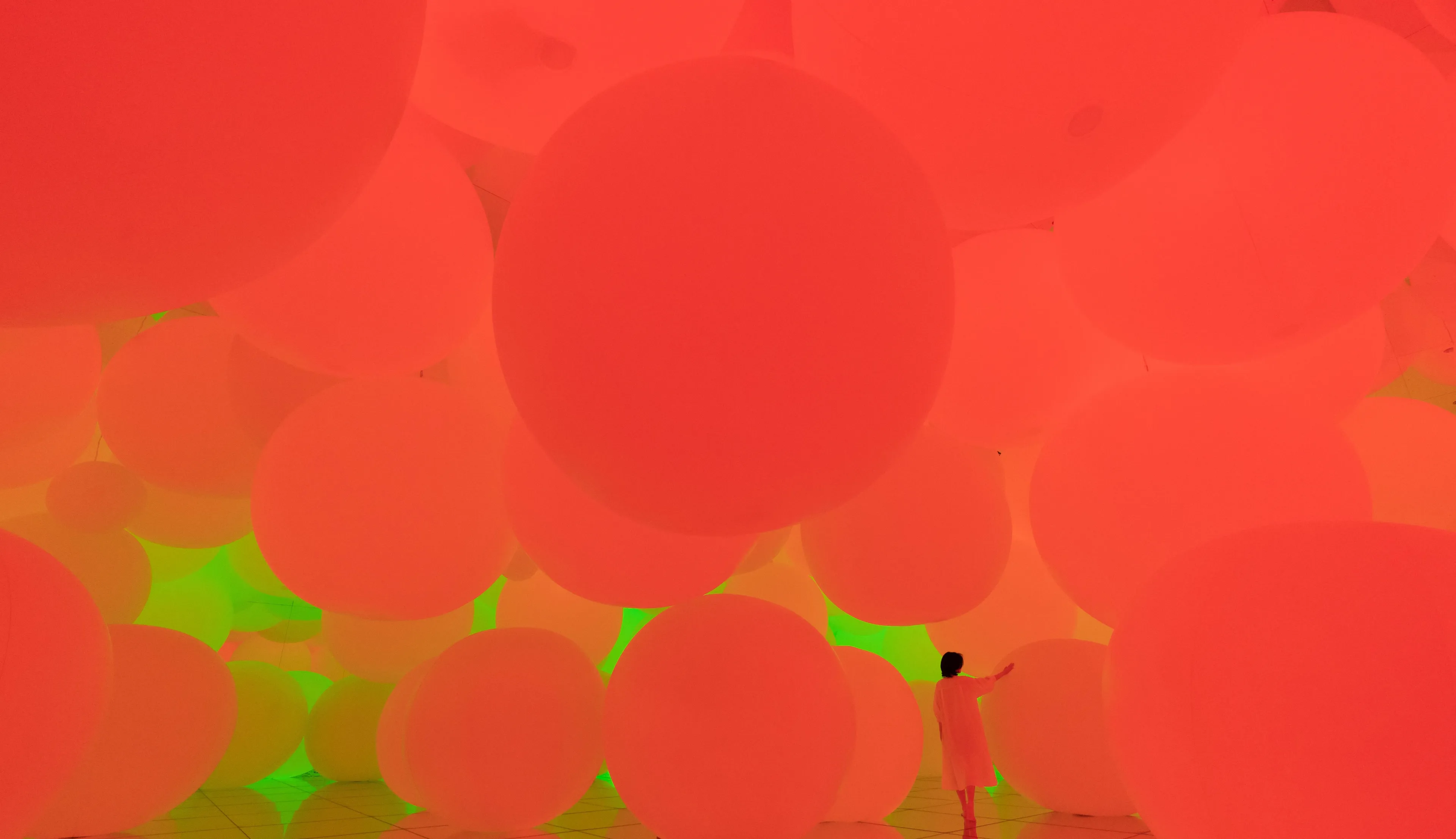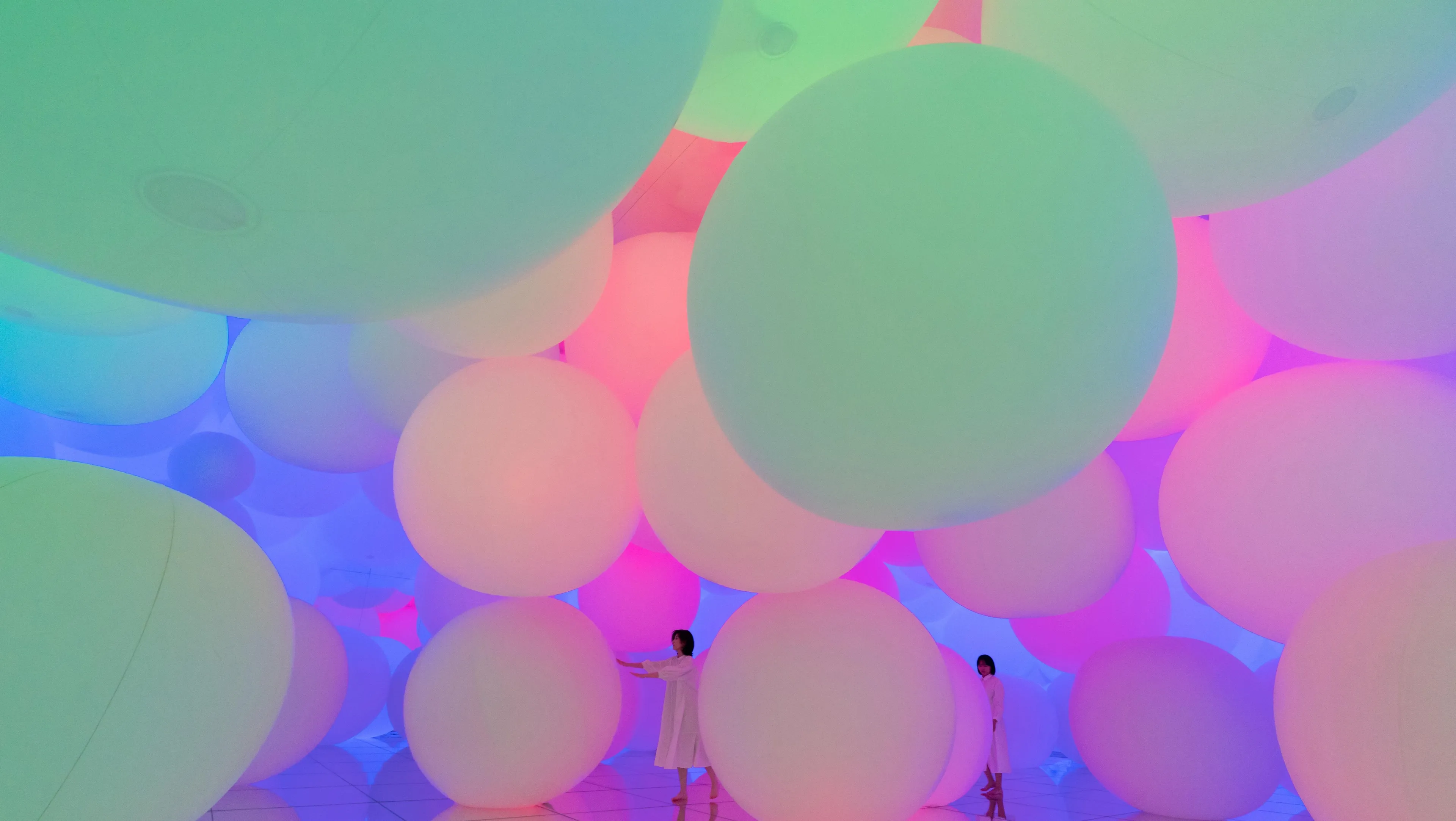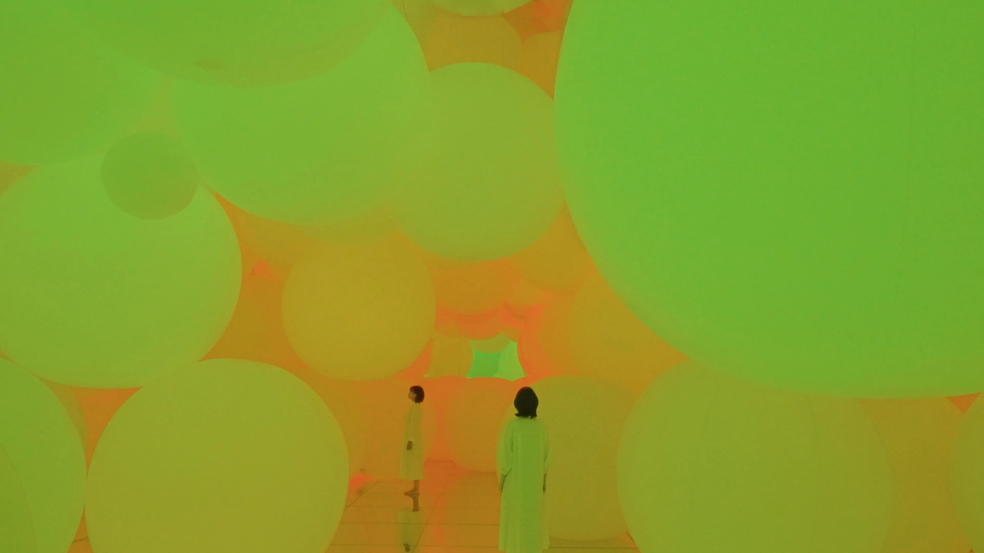 The space is filled with spheres of light. People move through the spheres and enter the space. When the spheres change color, the space itself shifts between a collection of spheres forming a three-dimensional space and a flat color wall.