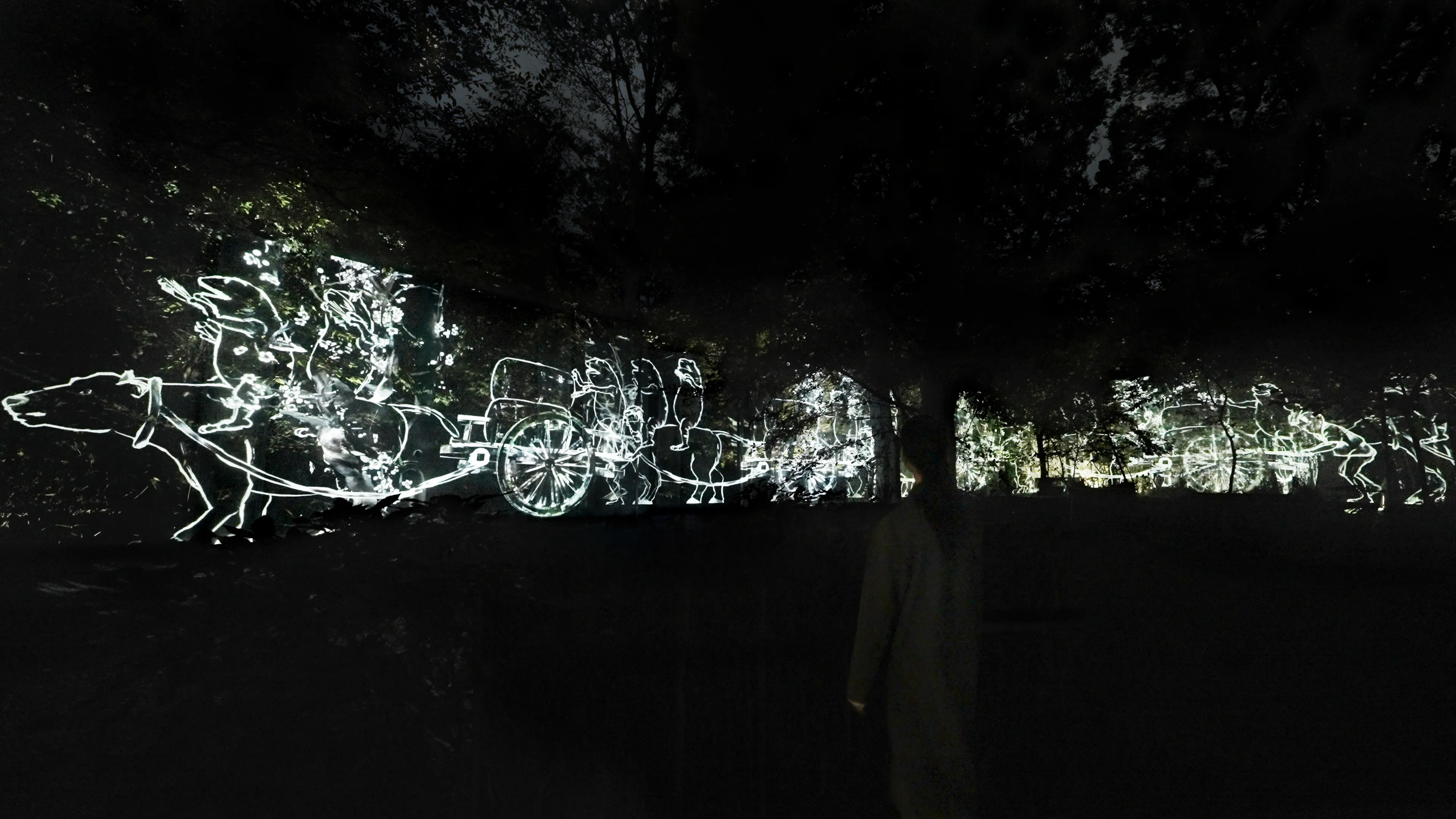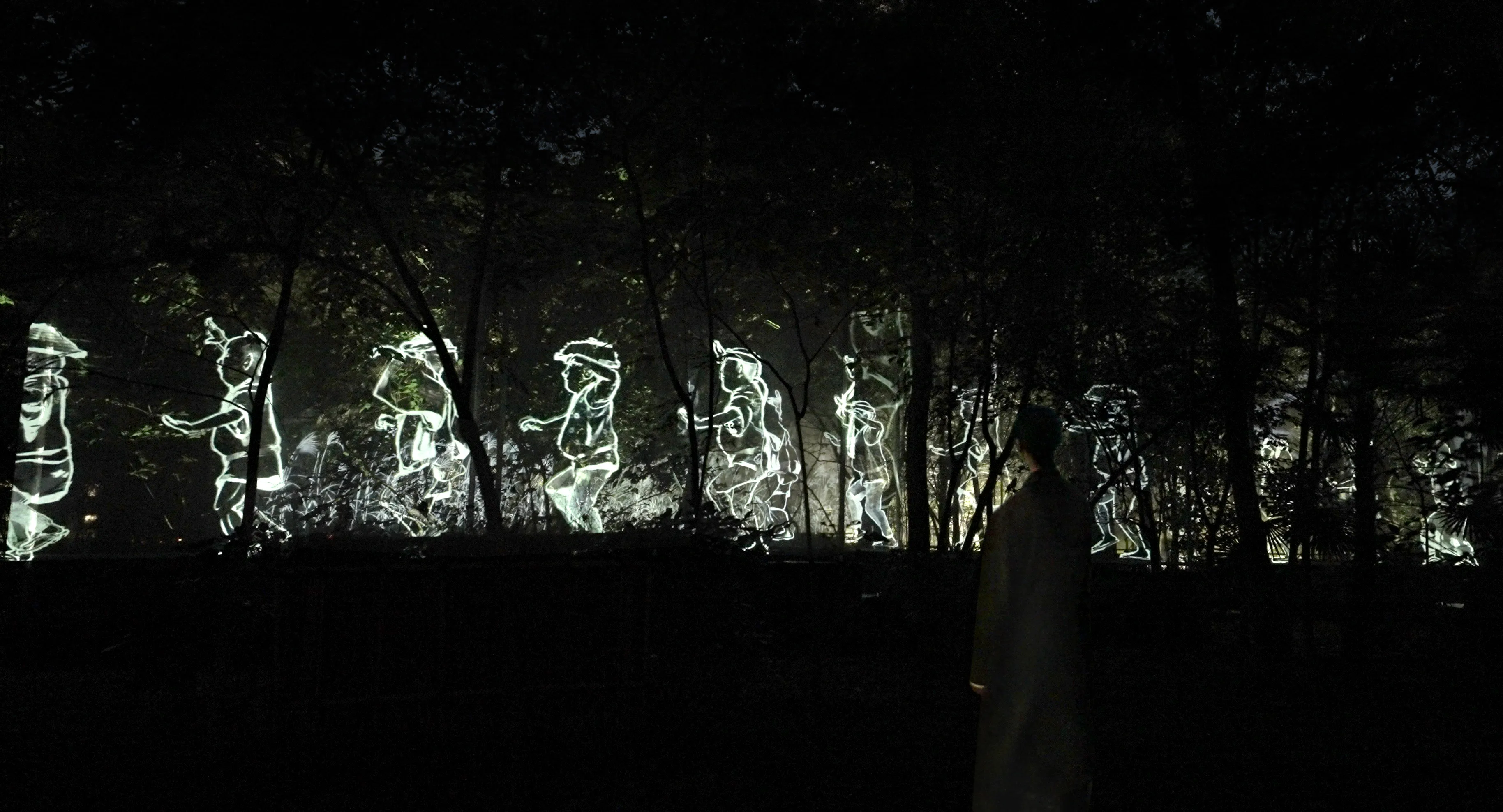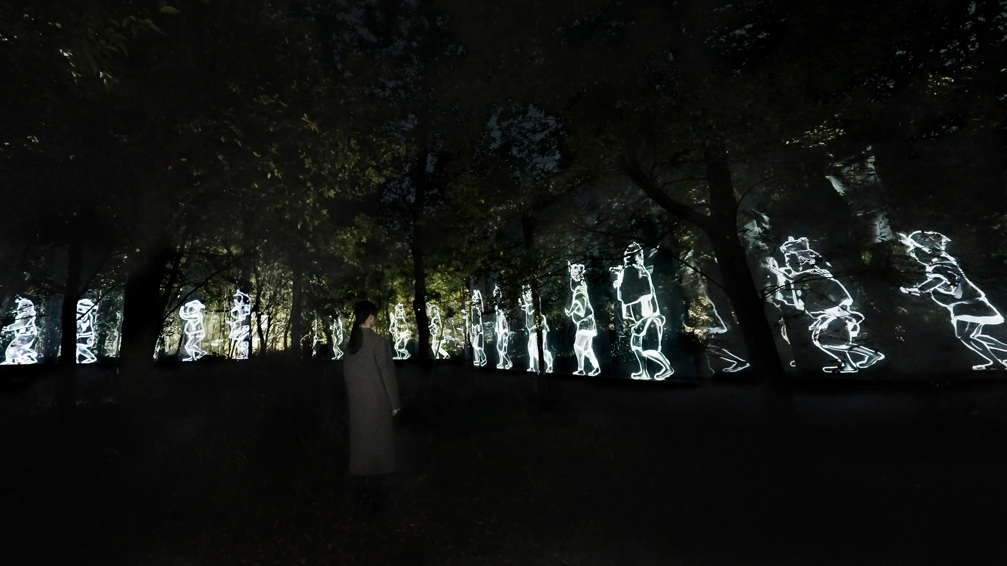 A group of anonymous and diverse figures walk along the trees in the forest.