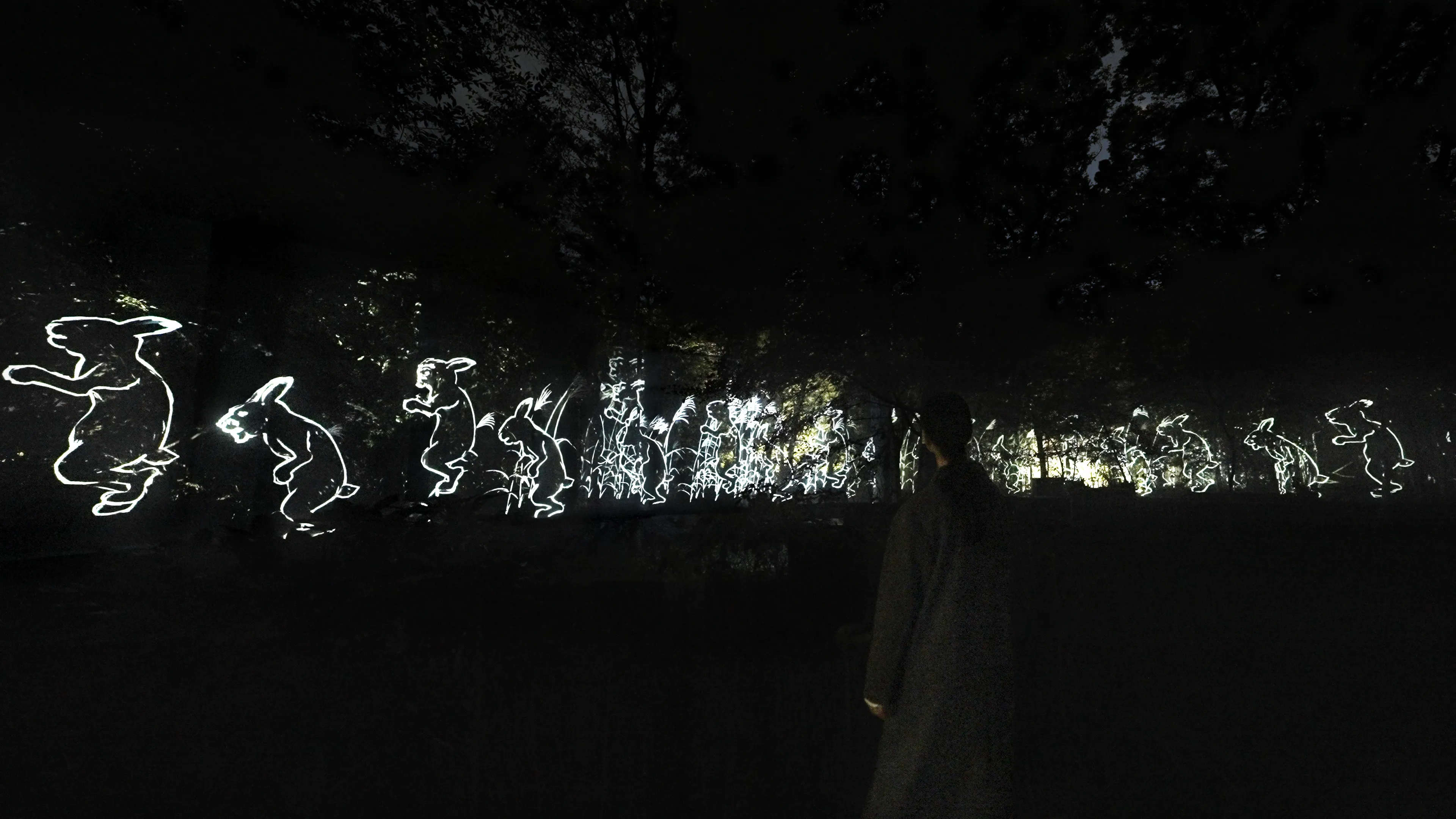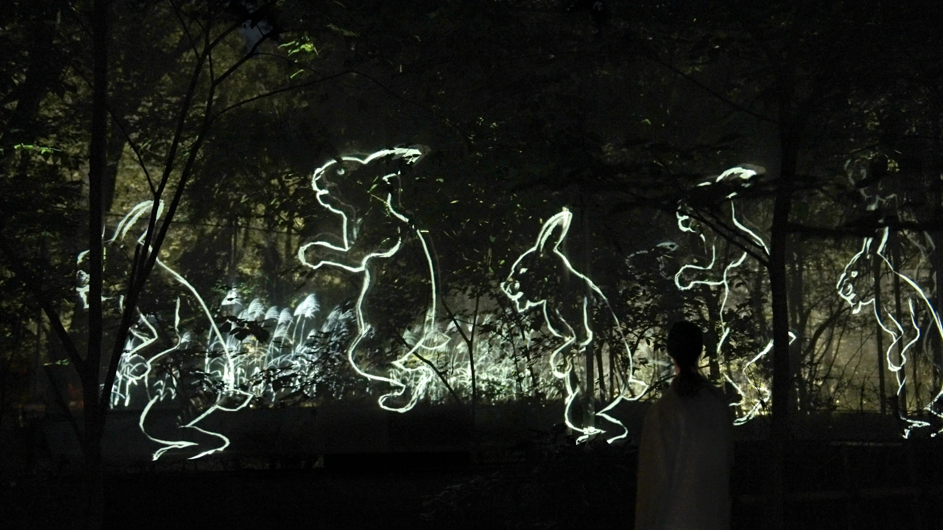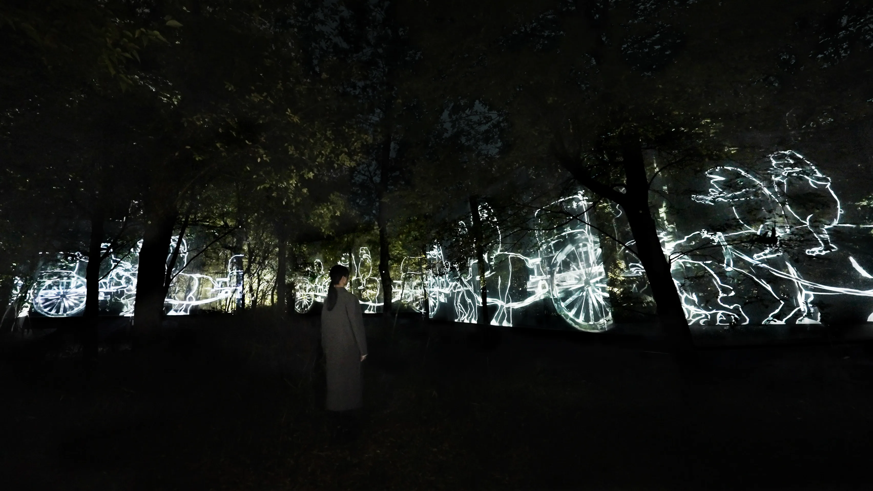 A group of anonymous and diverse figures walk along the trees in the forest.
