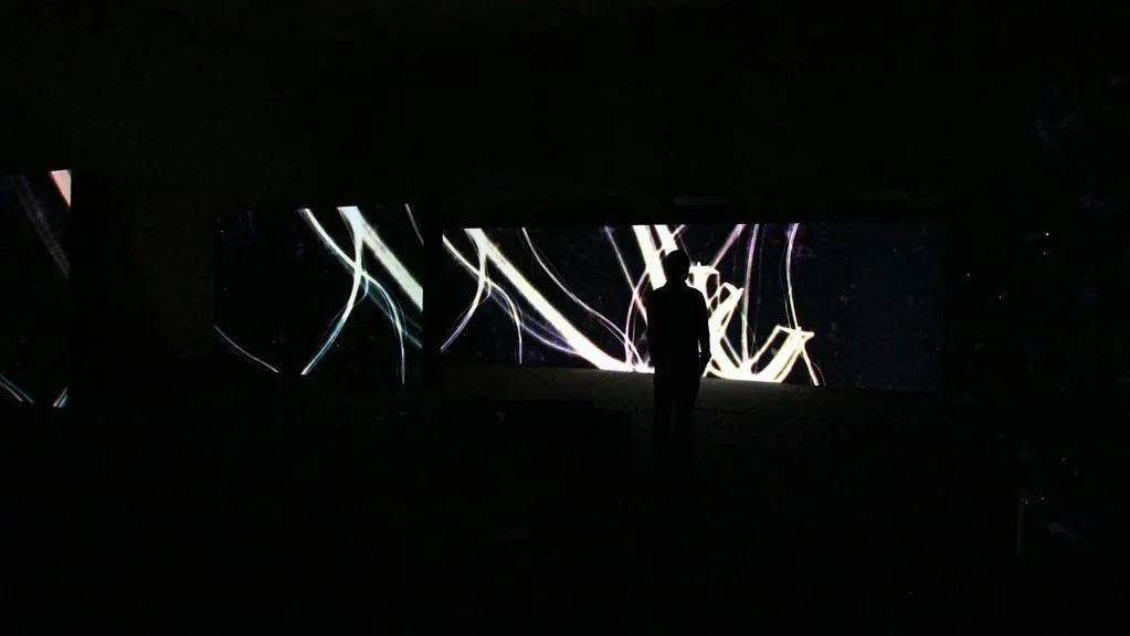 This artwork explores Japanese spatial awareness. It exists in a three-dimensional space that we call ultrasubjective space. The Japanese mythical bird Yatagarasu,* rendered in light, flies around the space leaving trails of light in its path, creating spatial calligraphy. As the crows chase and are chased by one another through the air, they turn into flowers and eventually scatter.
