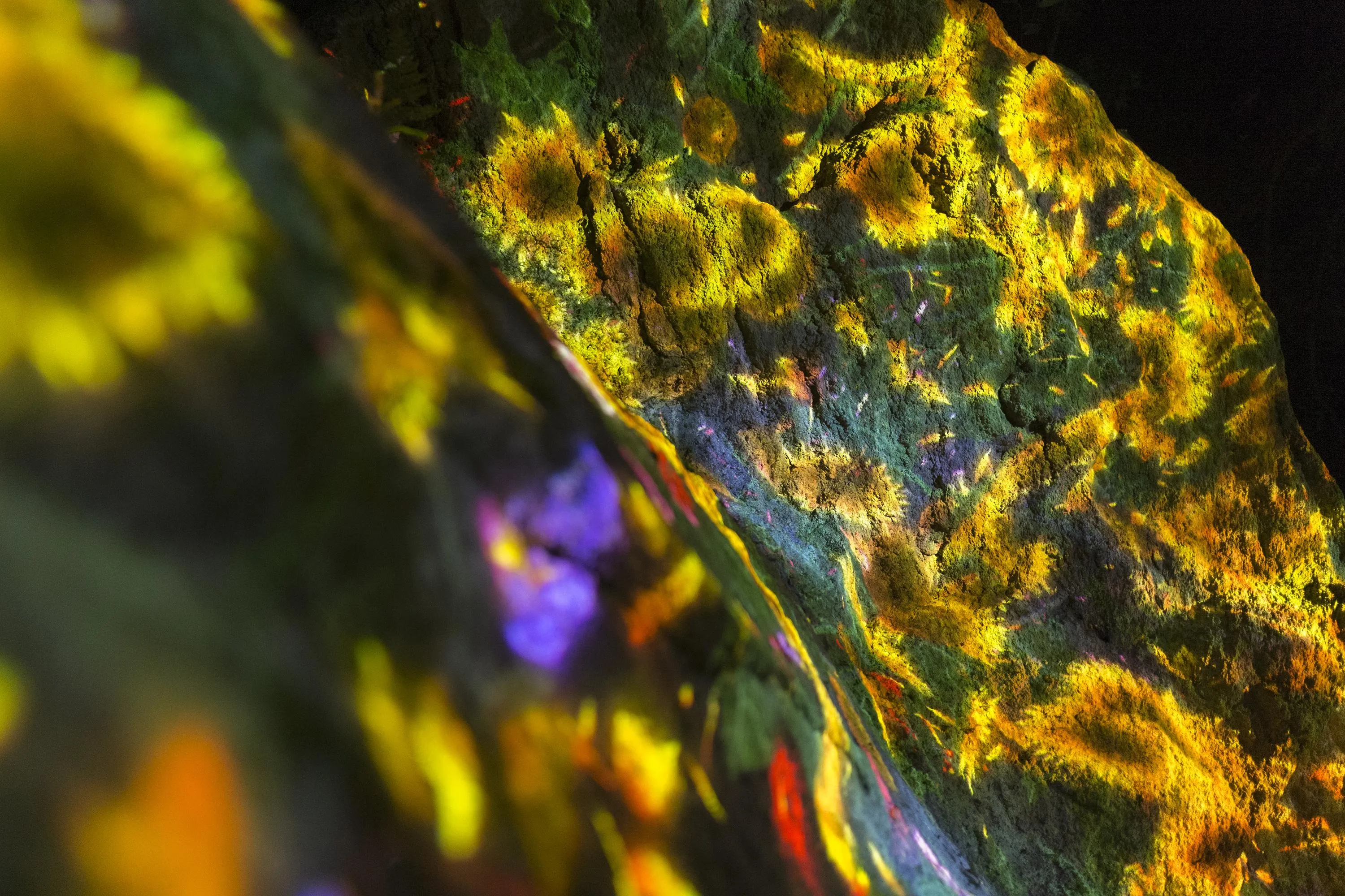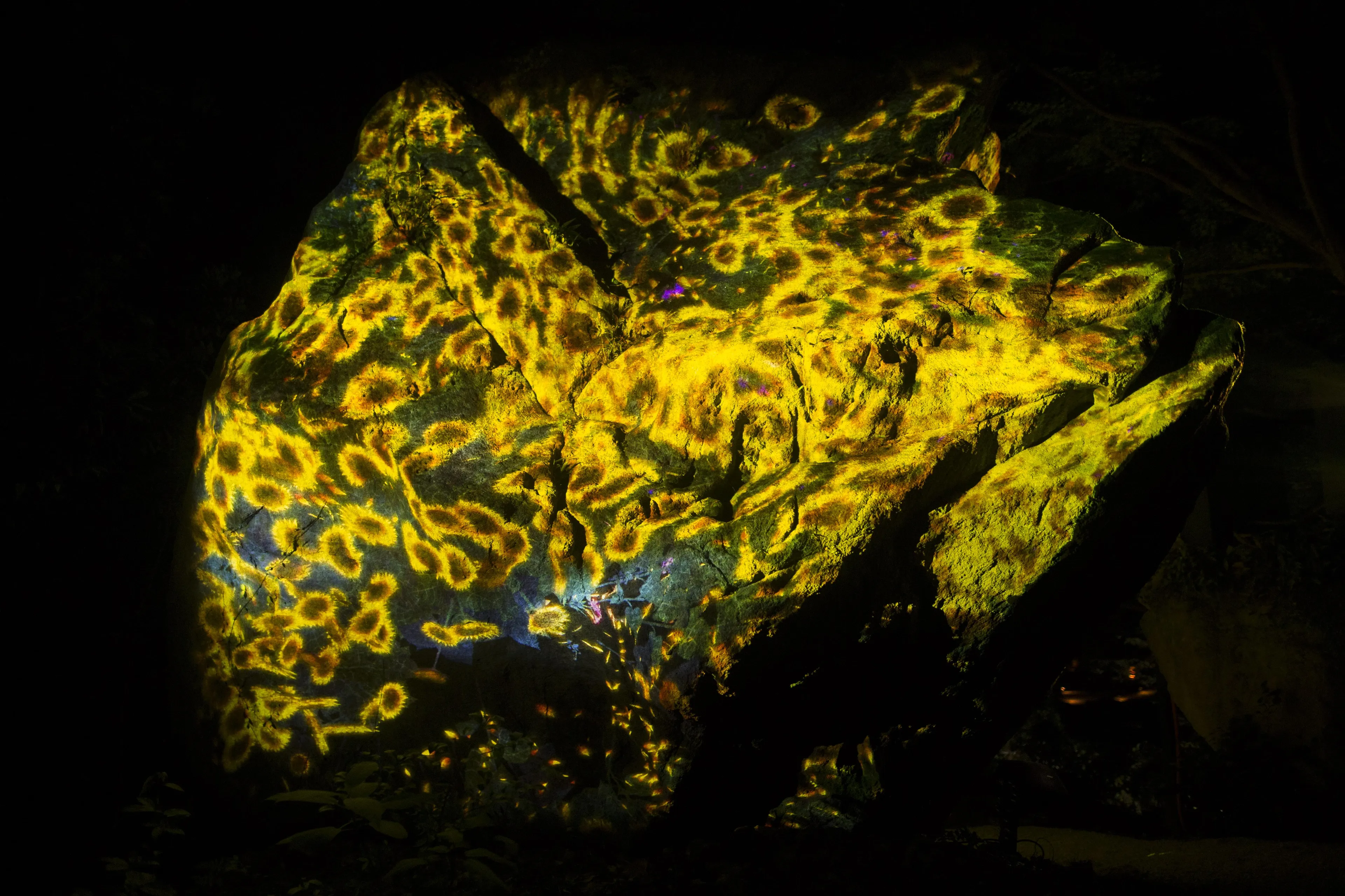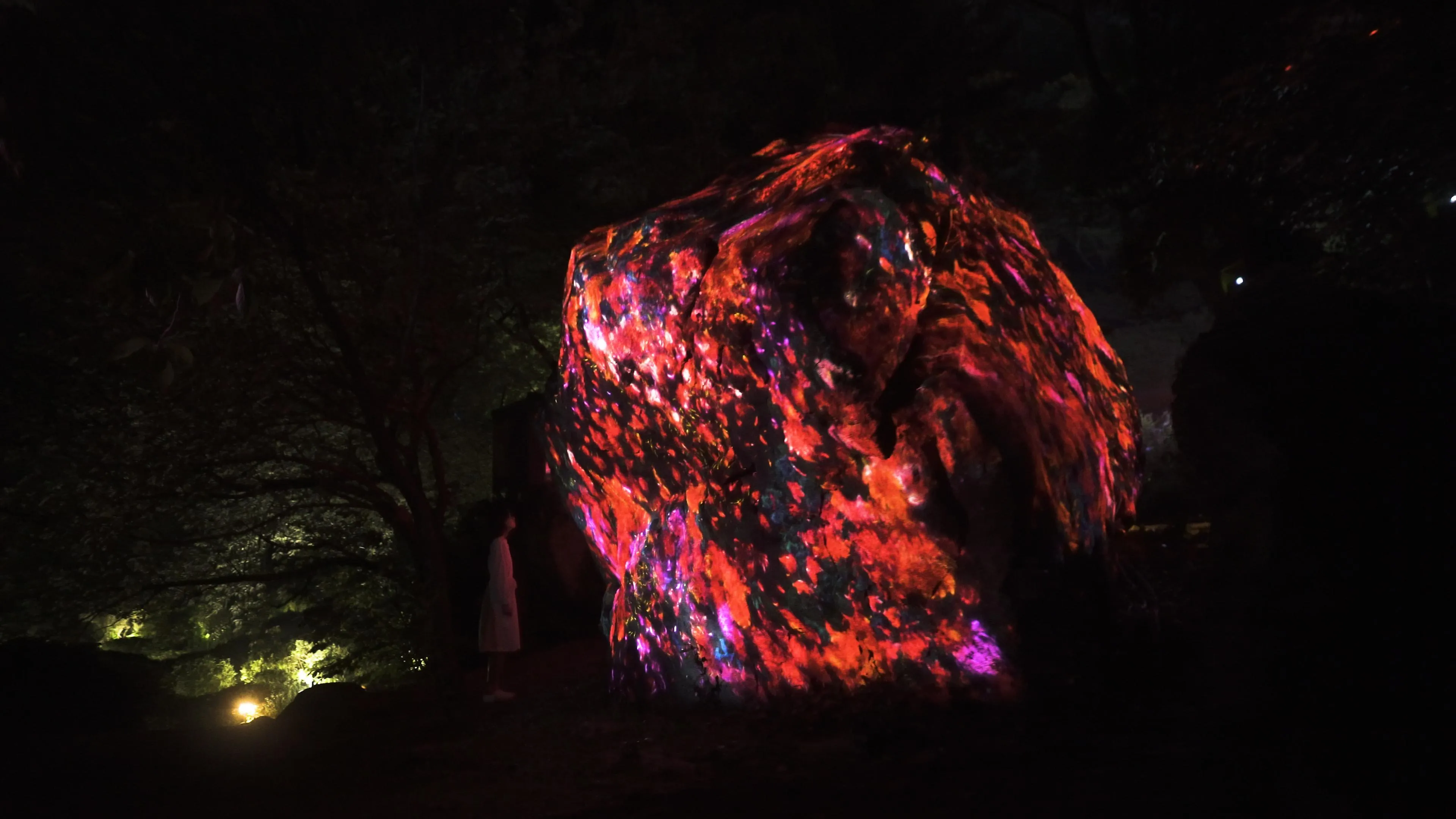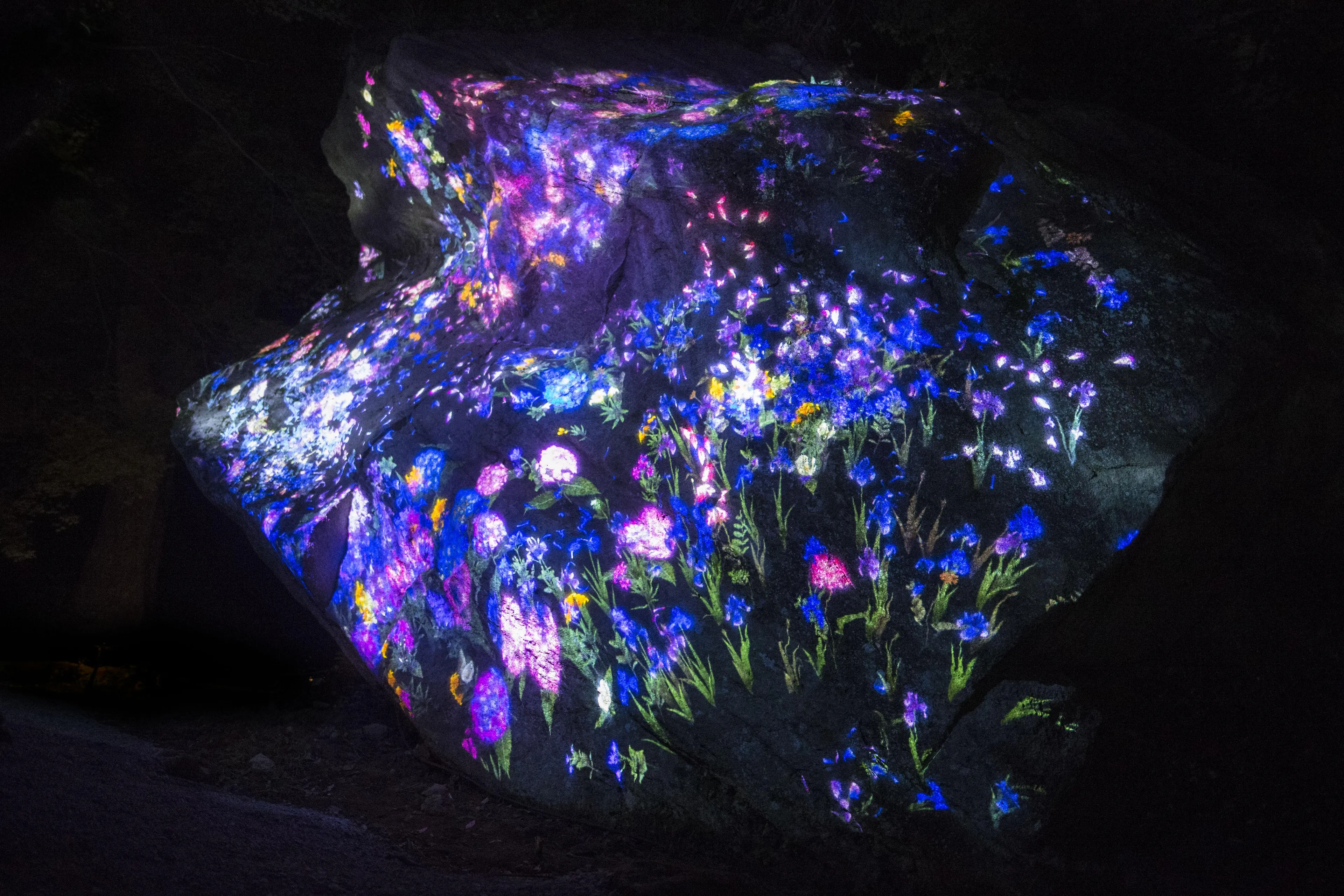 หินยักษ์ที่มีตะไคร่น้ำ (ความสูง 5.5m มิลลิเมตร กว้าง4.6m มิลลิเมตร6.5m) ก้อนนี้มีเหล่าบุปผชาติที่พร้อมจะเบ่งบานและร่วงโรยตลอดไป ตลอดระยะเวลาหนึ่งชั่วโมงของผลงานจะมีภาพแห่งการเปลี่ยนแปลงทั้งการเบ่งบานและร่วงโรยของดอกไม้ในดินแดนแห่งนี้