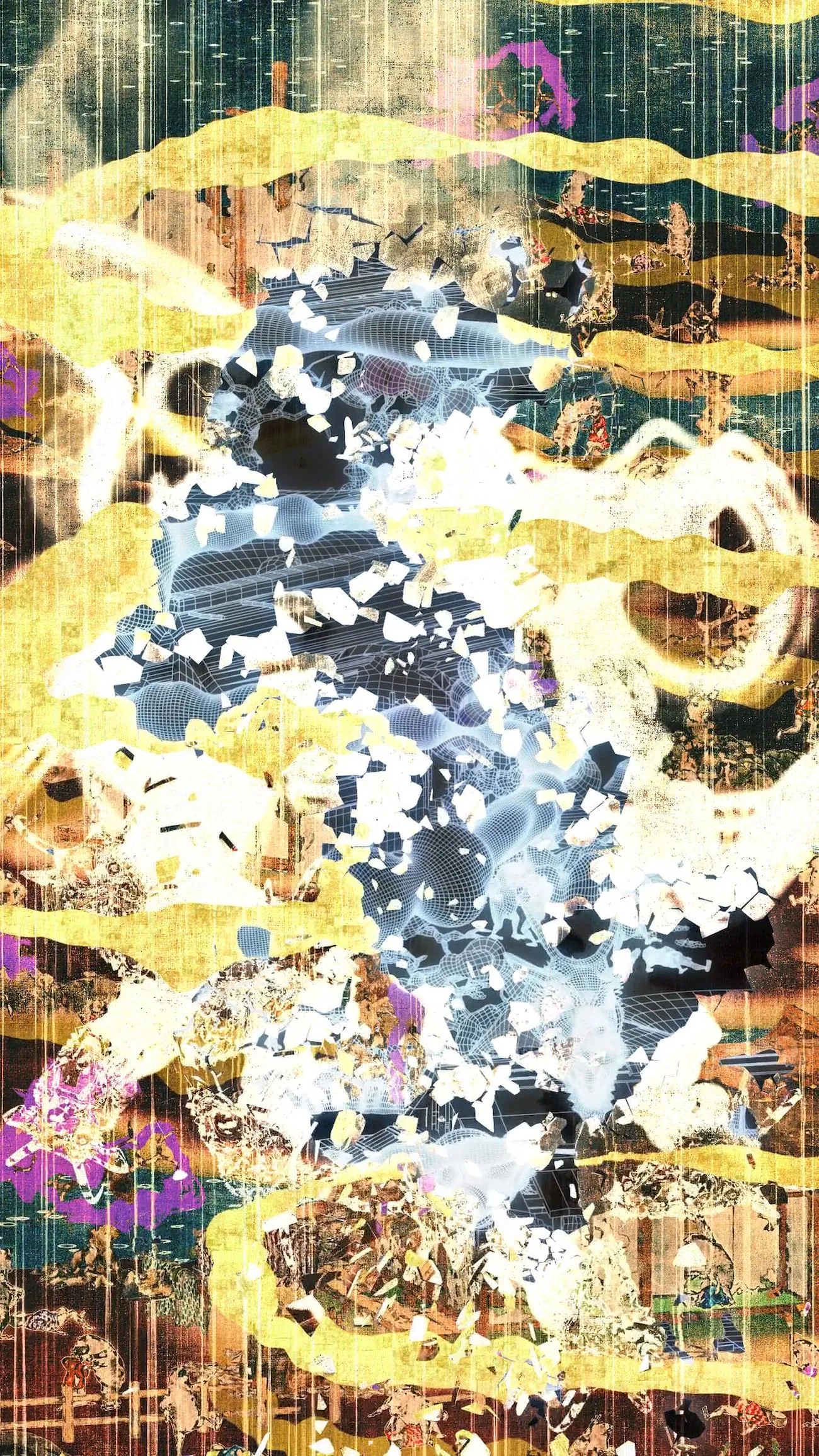 Three-dimensional shapes are represented by a computer as abstract, higher-order information described by a mesh construction. When the surfaces of those three-dimensional rendered objects are peeled away, it is apparent that they are created from various combinations of mesh structures. By peeling away the surface, the underside of the work is revealed allowing a glimpse into the creative process behind it.