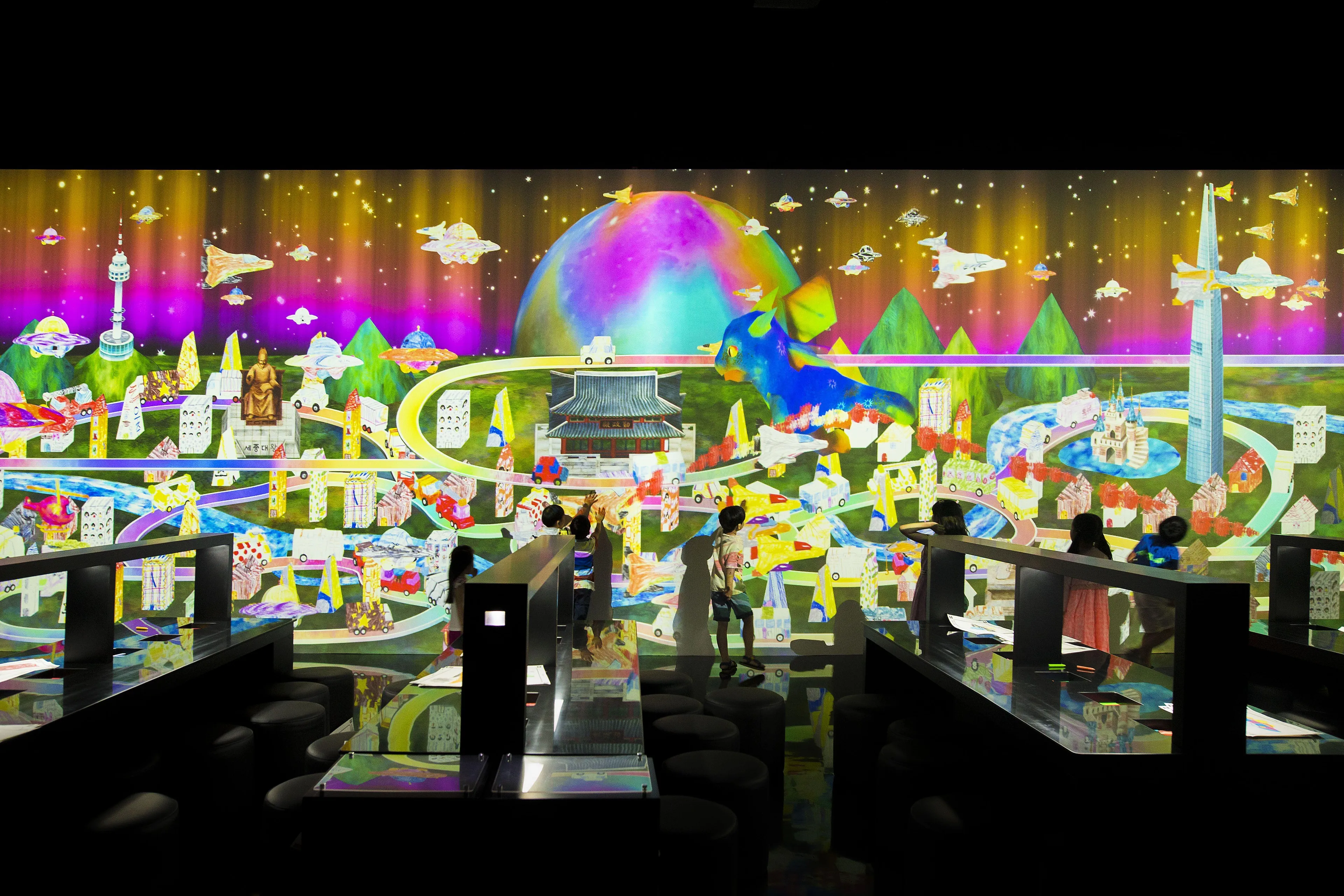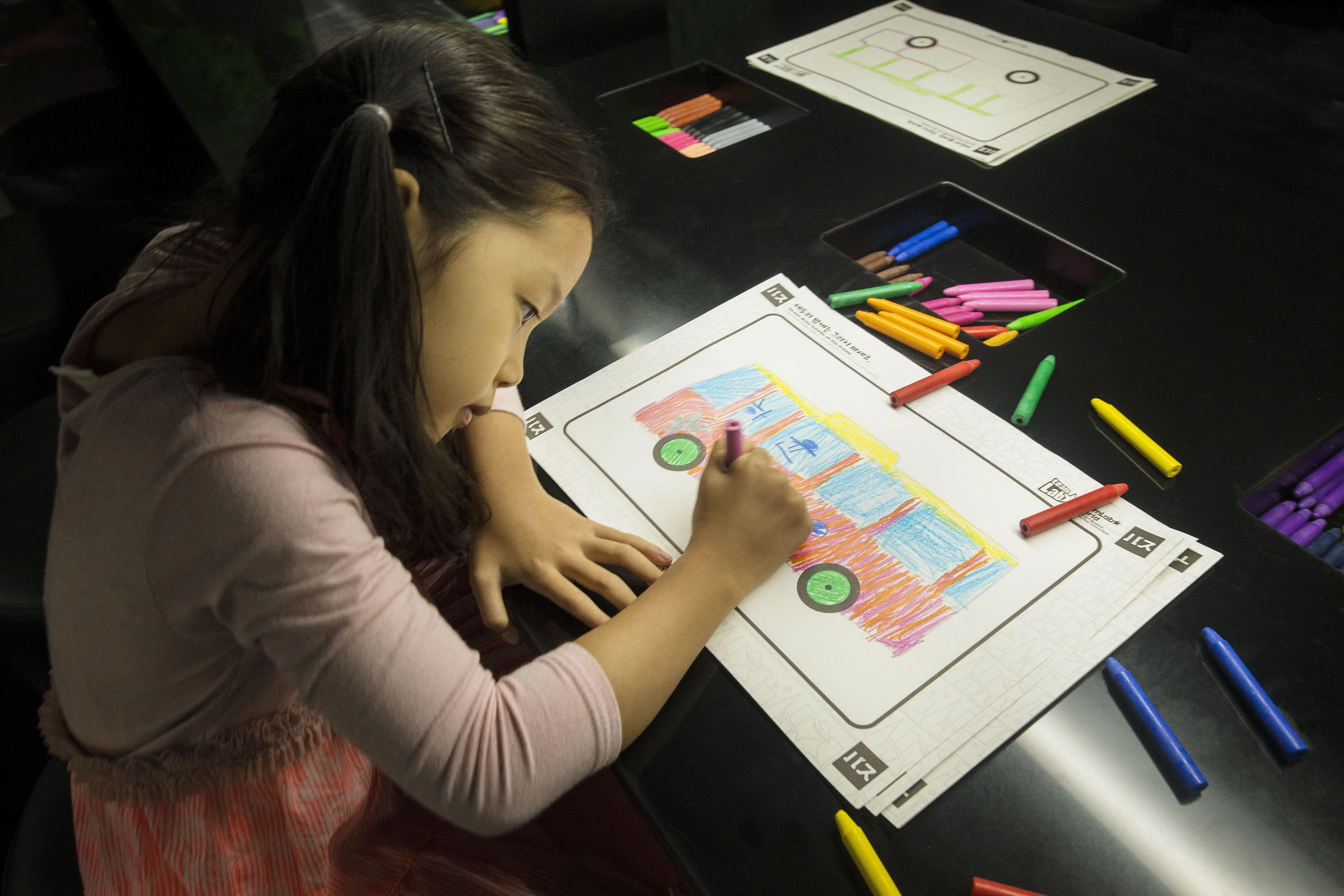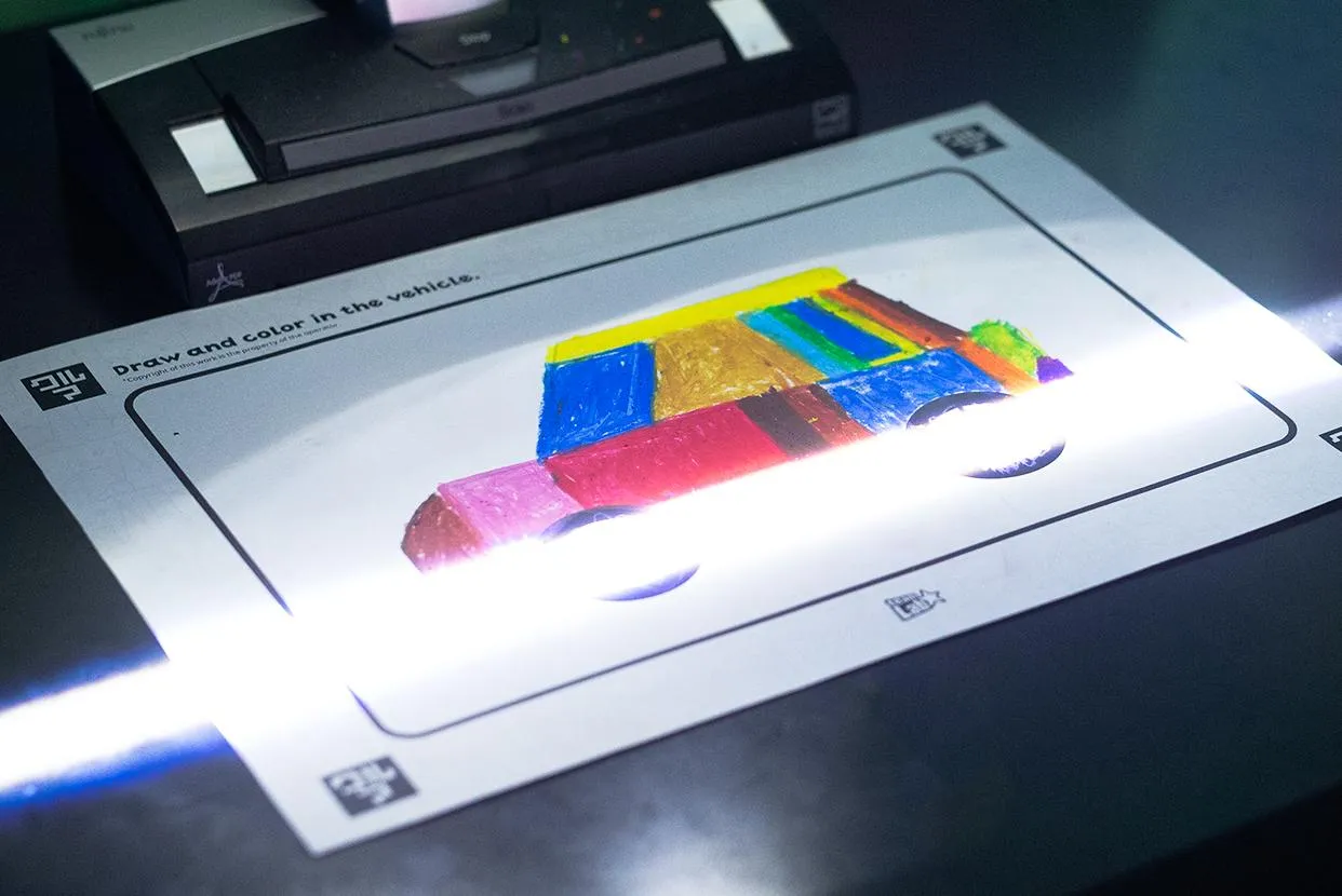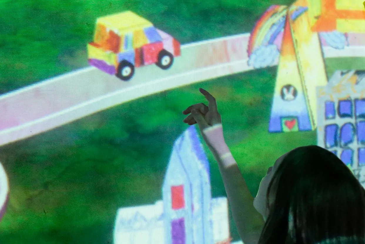 After the 2-D drawings of the cars, buildings, UFOs, and spaceships are completed, they are scanned, become 3-D and enter a virtual 3-D townscape. Every component of the town has a role to play; for example, the fire trucks and cranes serve to protect the town. Children can interact with the final townscape by touching individual components to alter their behavior.