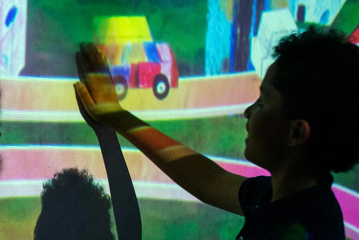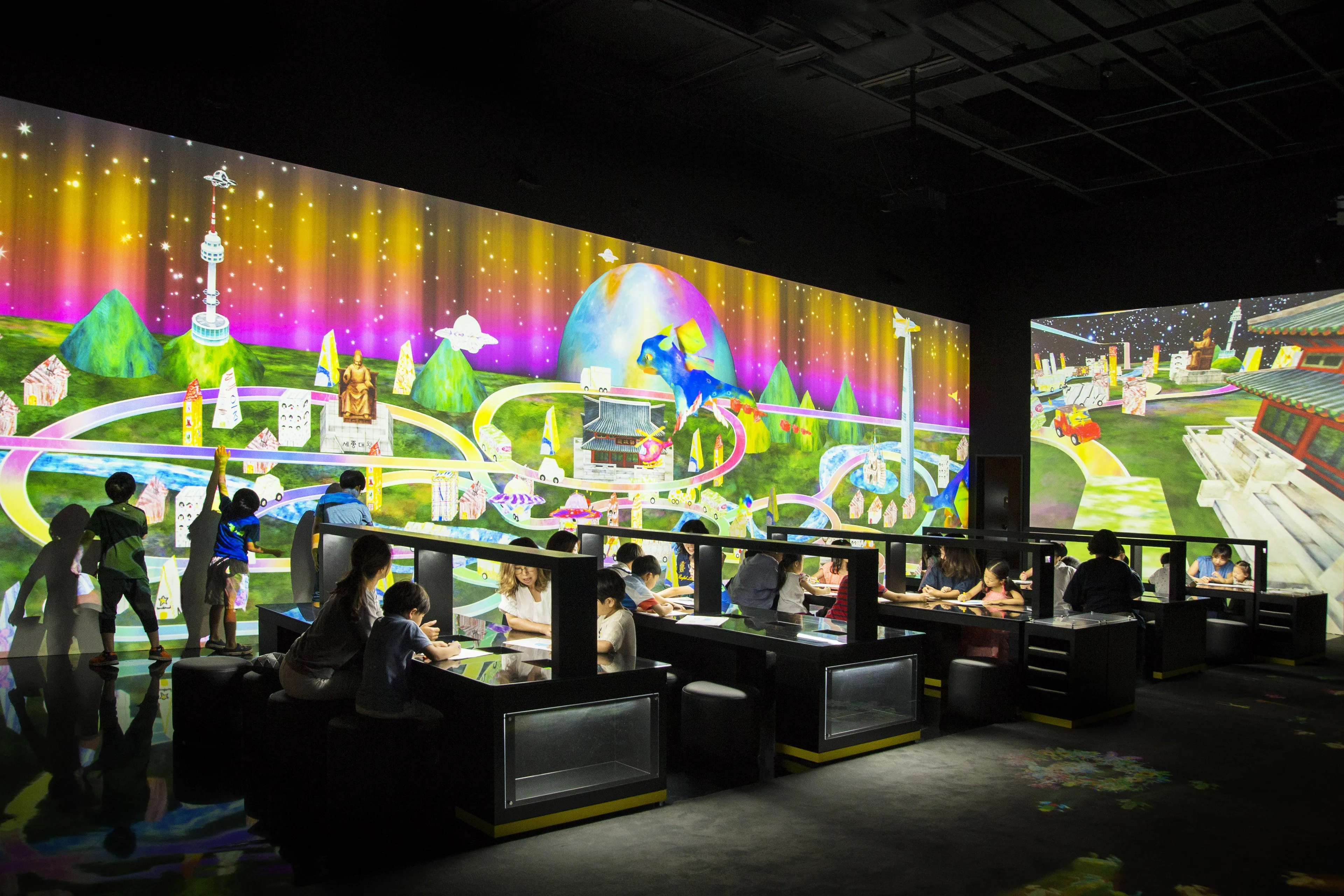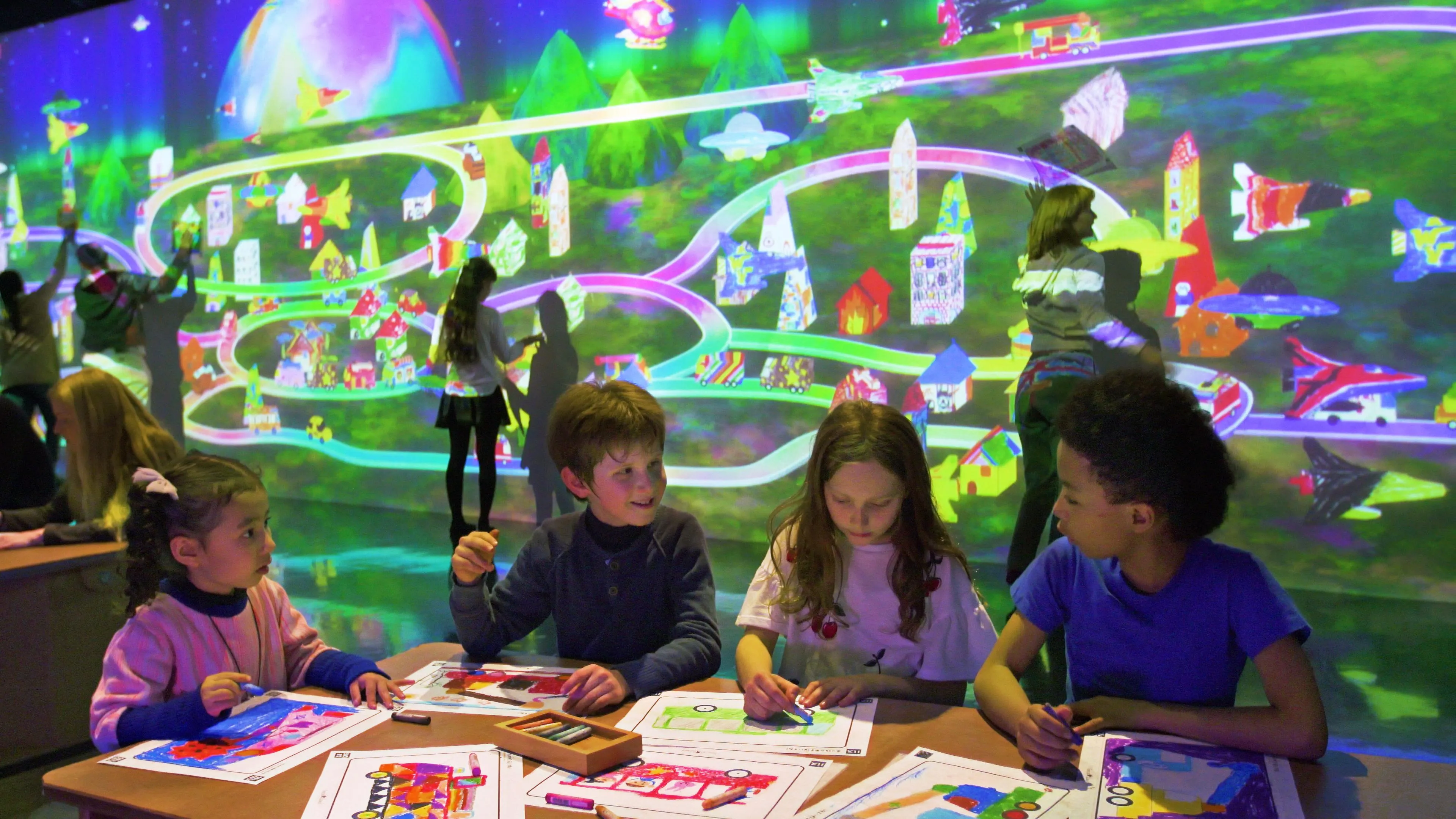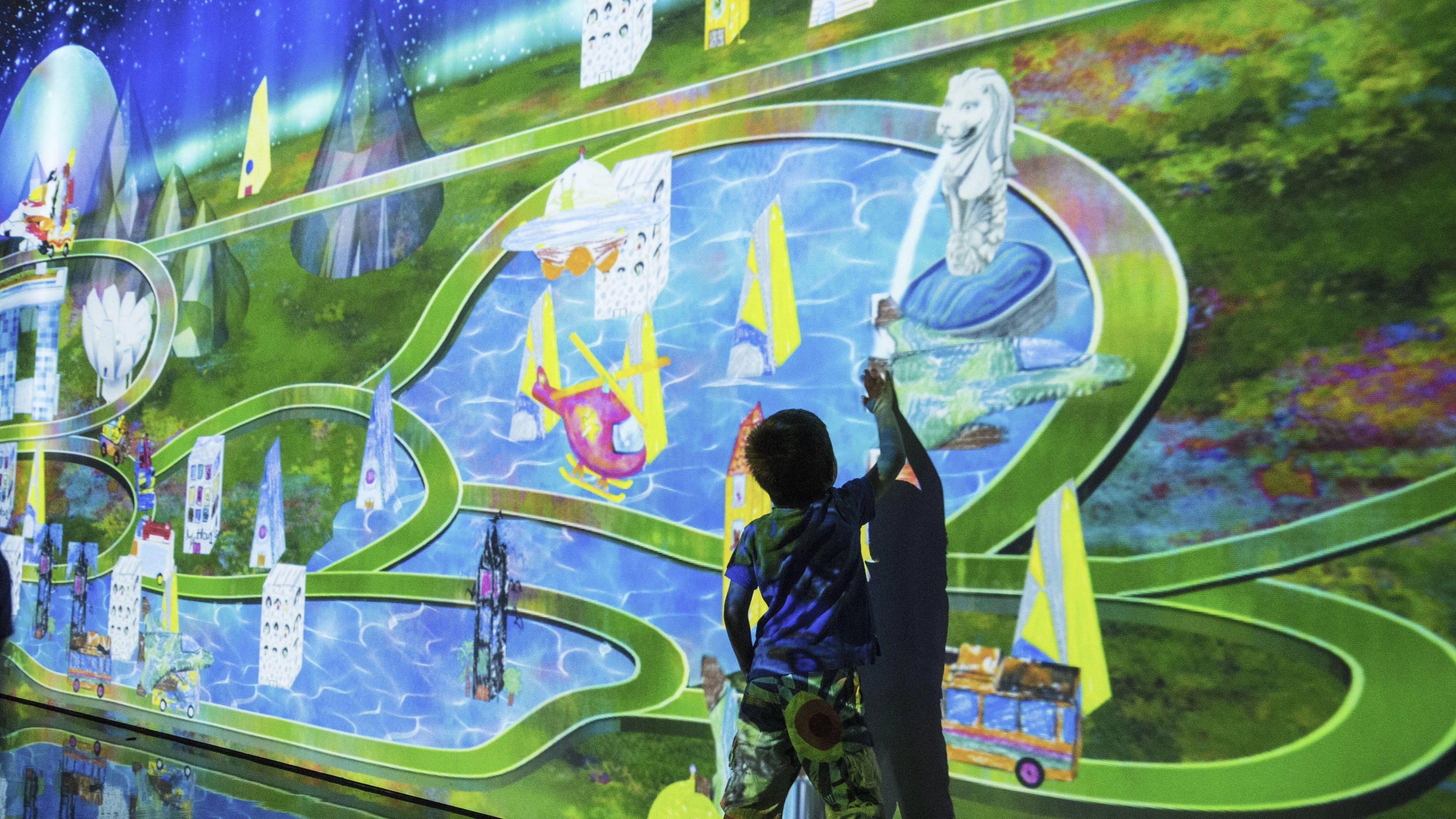 After the 2-D drawings of the cars, buildings, UFOs, and spaceships are completed, they are scanned, become 3-D and enter a virtual 3-D townscape. Every component of the town has a role to play; for example, the fire trucks and cranes serve to protect the town. Children can interact with the final townscape by touching individual components to alter their behavior.