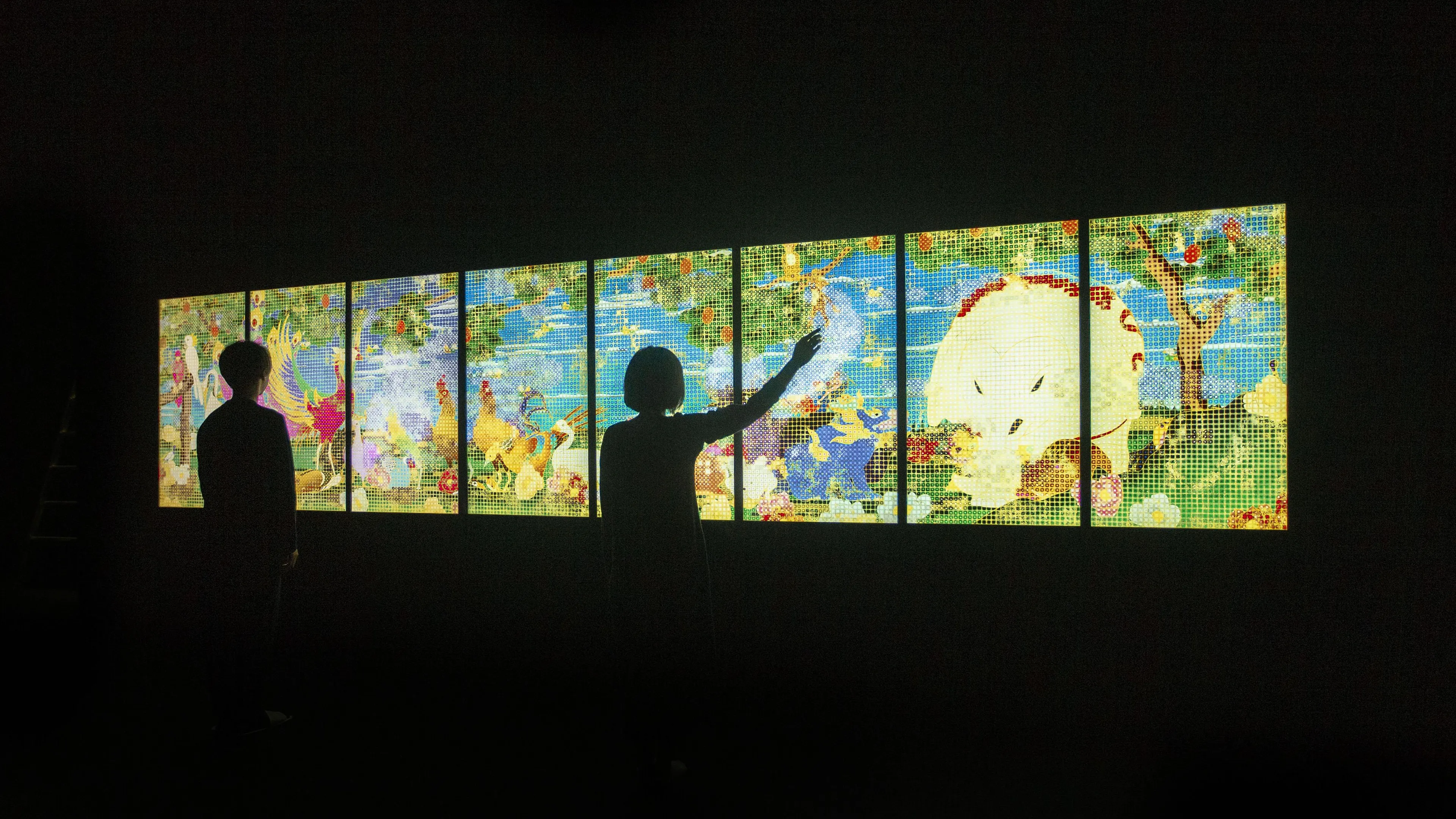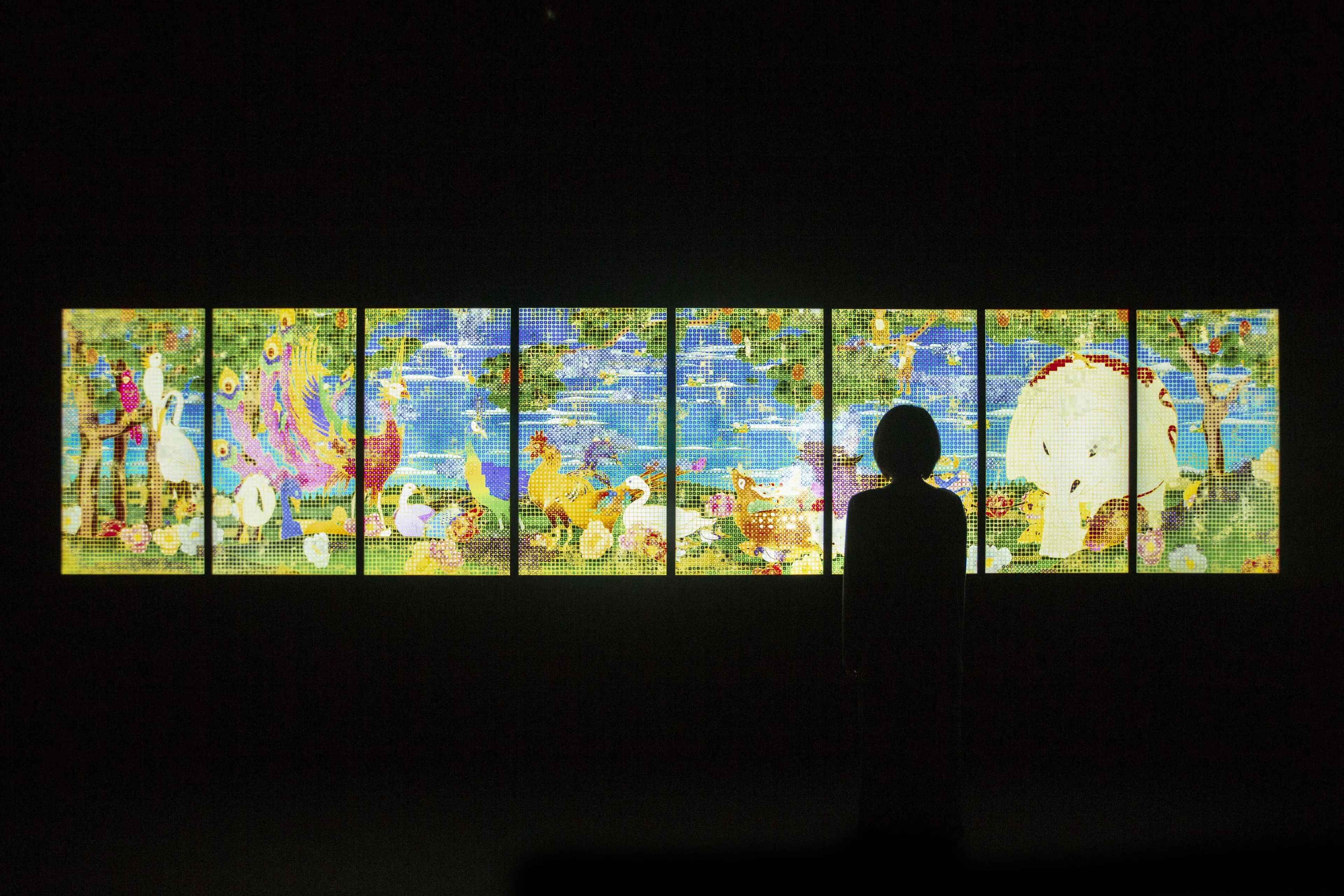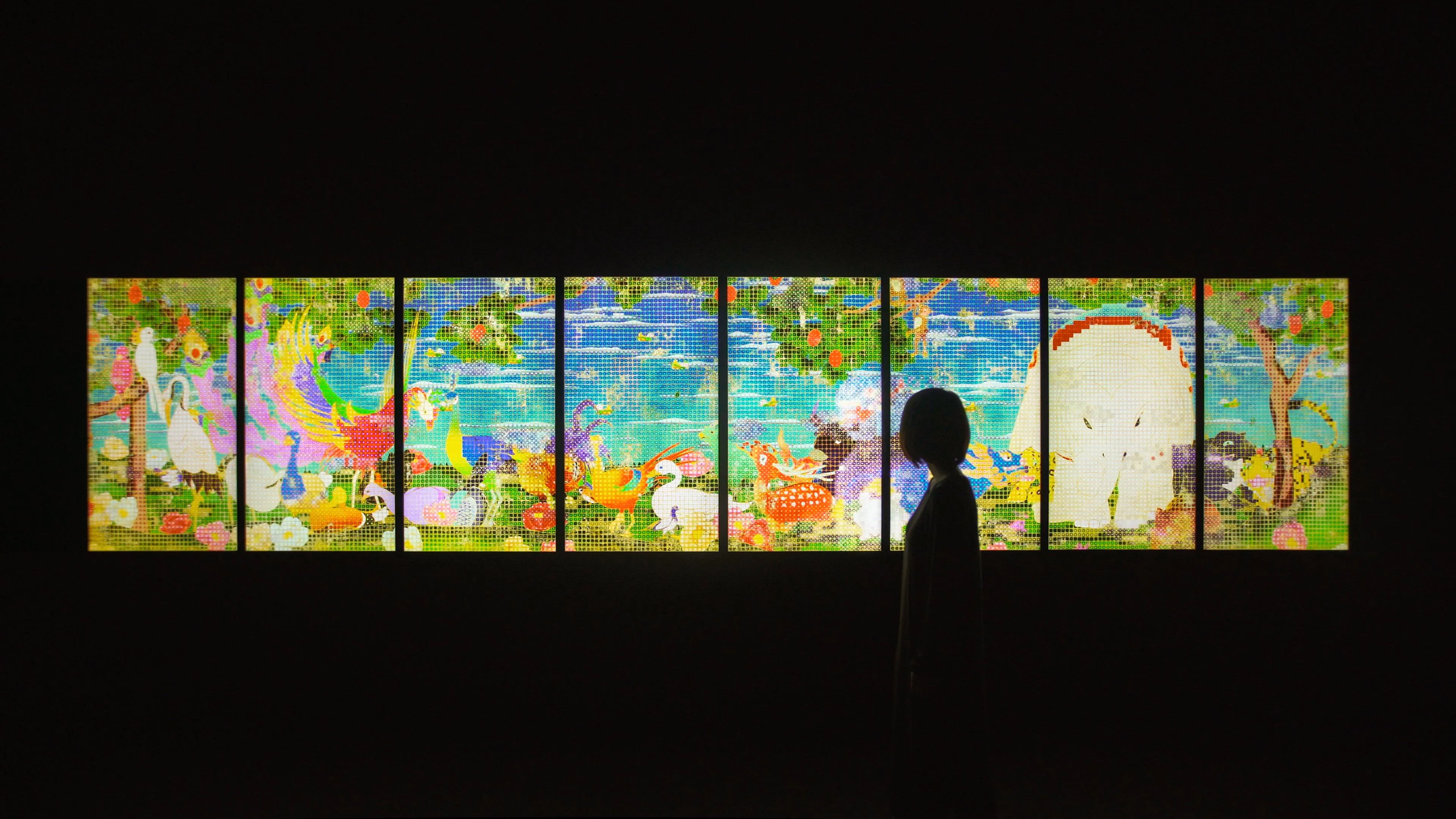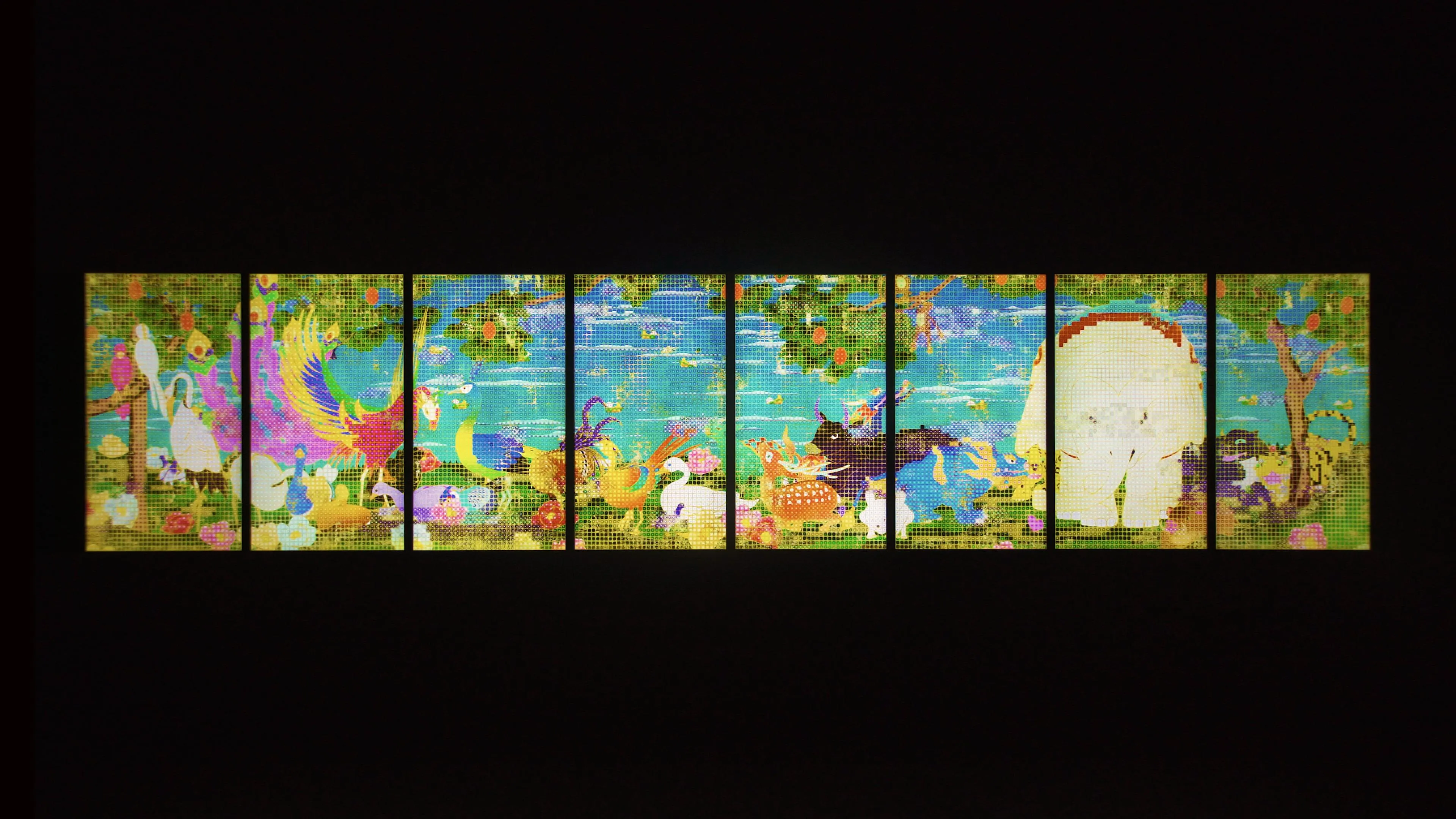 The squares of the screen are fixed while the space continues to move, and thus the color inside the squares is on a different time axis to the space. Seen as a whole from a distance, brilliantly shining  colors occur, and the world of plants and animals in the space will move at a slow time axis. When viewed up close, the colors divided by the finely drawn patterns of each square will change on a rapid time axis. Two time axes co-exist in this work.