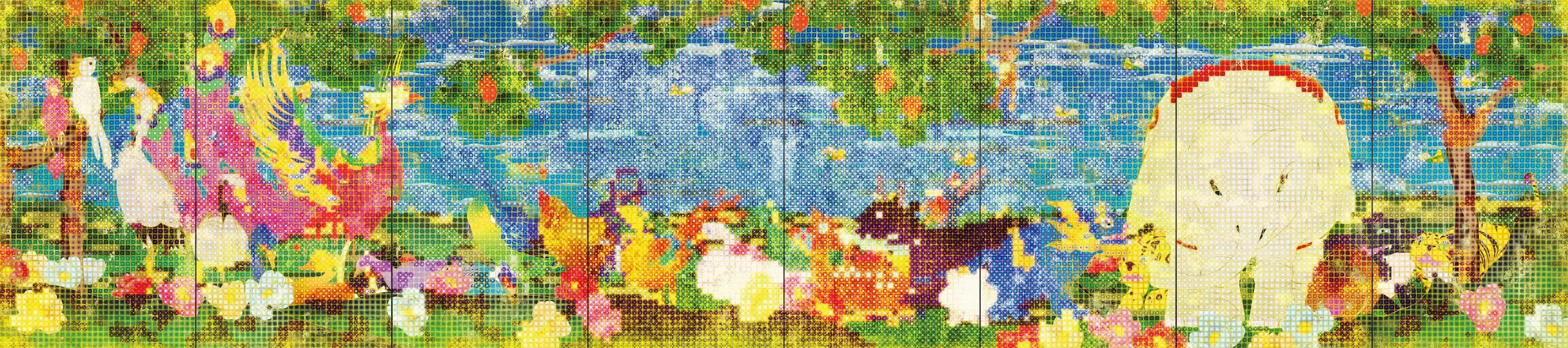 Itō Jakuchū (1716–1800) was an early modern Japanese painter who was active in Kyoto in the mid-Edo period. Jakuchū has left us with a unique style of painting in which the surface is made up of a grid of tens of thousands of squares that are individually colored. This work was inspired by the screen paintings Birds, Animals, and Flowering Plants and Trees, Flowers, Birds and Animals.