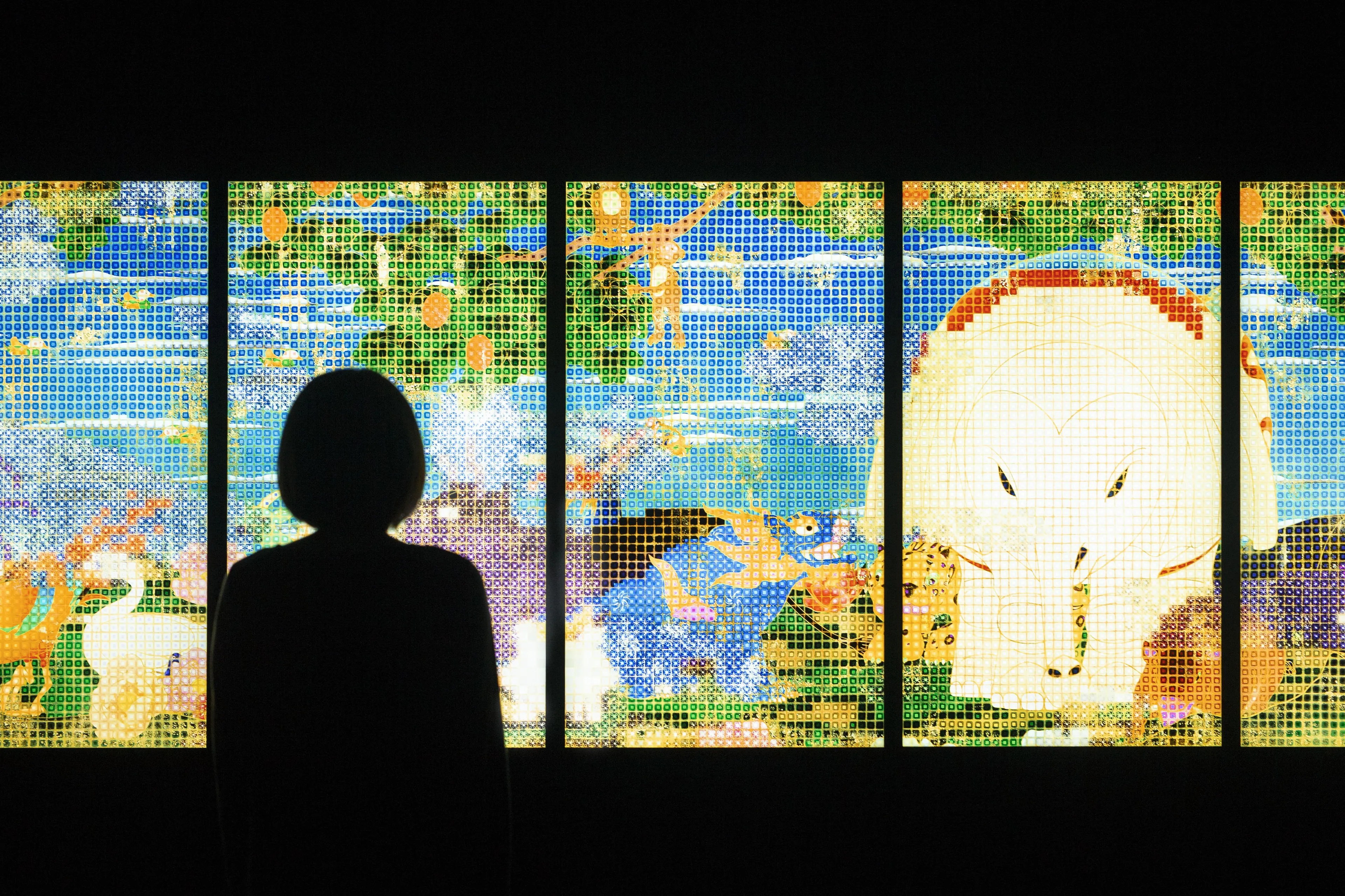 This artwork was created in a virtual 3-D space in which 3-D animals move. The space was then converted into what teamLab calls ultrasubjective space. Then,  the color in the 3-D space is split by the color pattern of the squares. For example, if the pattern of a square is colored in red and blue, that part corresponds to purple in the three dimensional space.