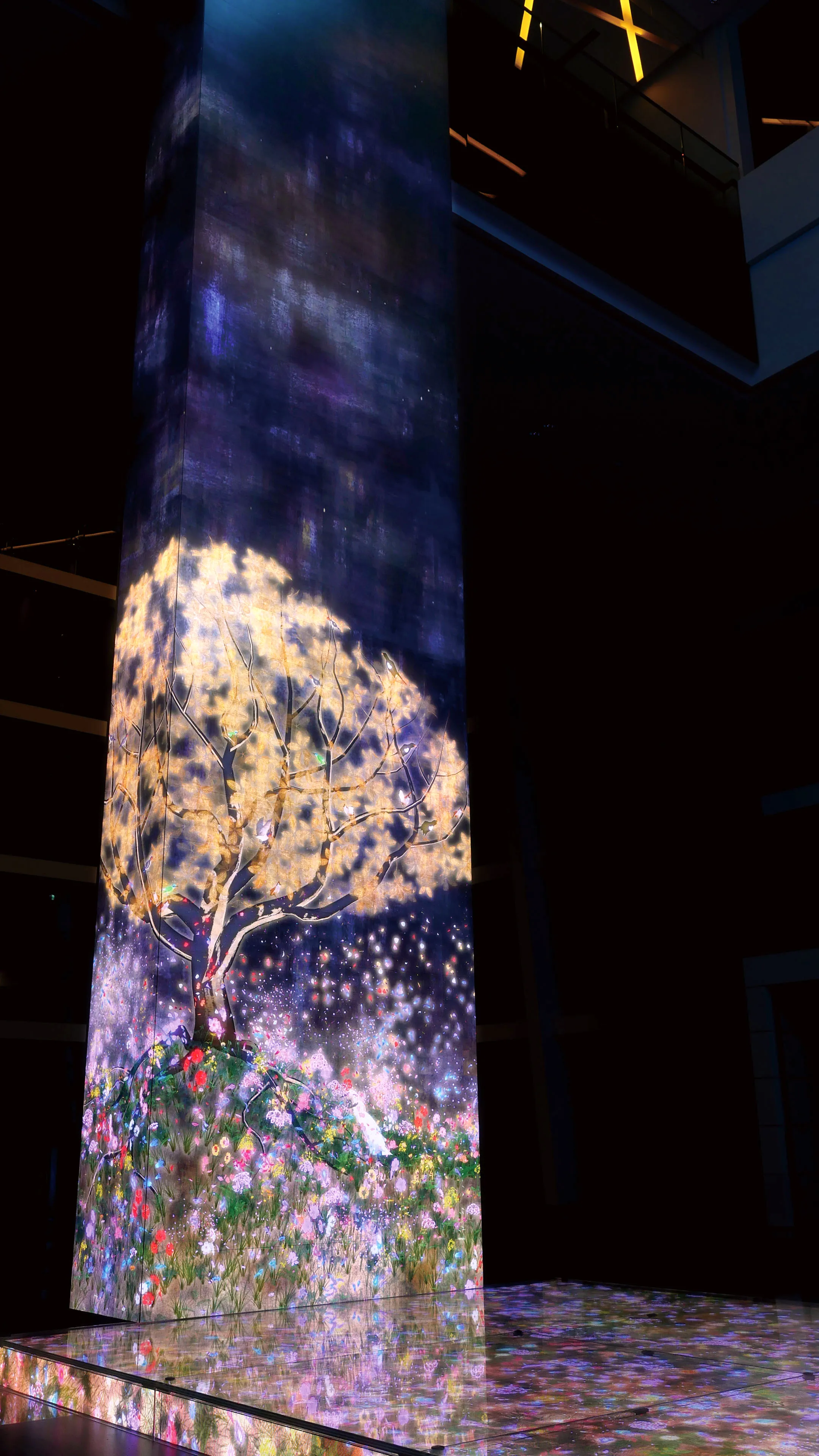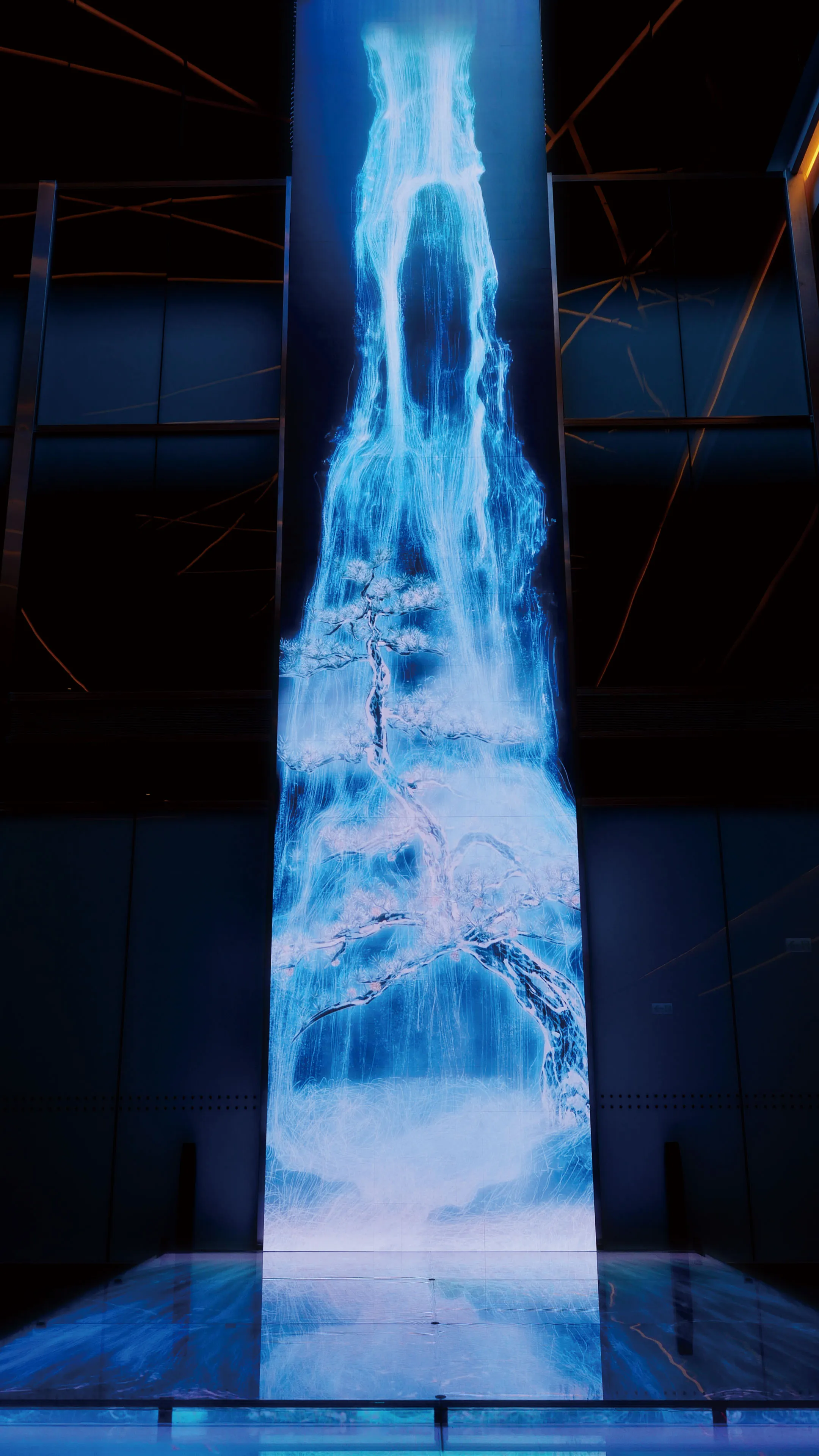 Dynamic, hued landscapes controlled by different factors, like viewers’ movements, or the temperature outside, emerge in “ultra-technologists group” teamLab’s magnificent interactive art installation at the CTBC Financial Park in Taipei. In a video released on their YouTube channel yesterday, the towering LED sculpture in the shape of ChinaTrust’s “Double-C Logo” cycles through a collection of visuals, including long strings of neon blue water with the consistency of angel hair trickling down a giant screen wall. The waterfall cascades down through a tall cherry blossom bonsai tree and onto a stage of glass panels, warping around the viewer’s stance. “Everything is connected in a cycle, but no events are ever repeated in exactly the same way,” teamLab explains in Circulum Formosa’s video description, channeling the complexity of the natural forces the piece imitates.