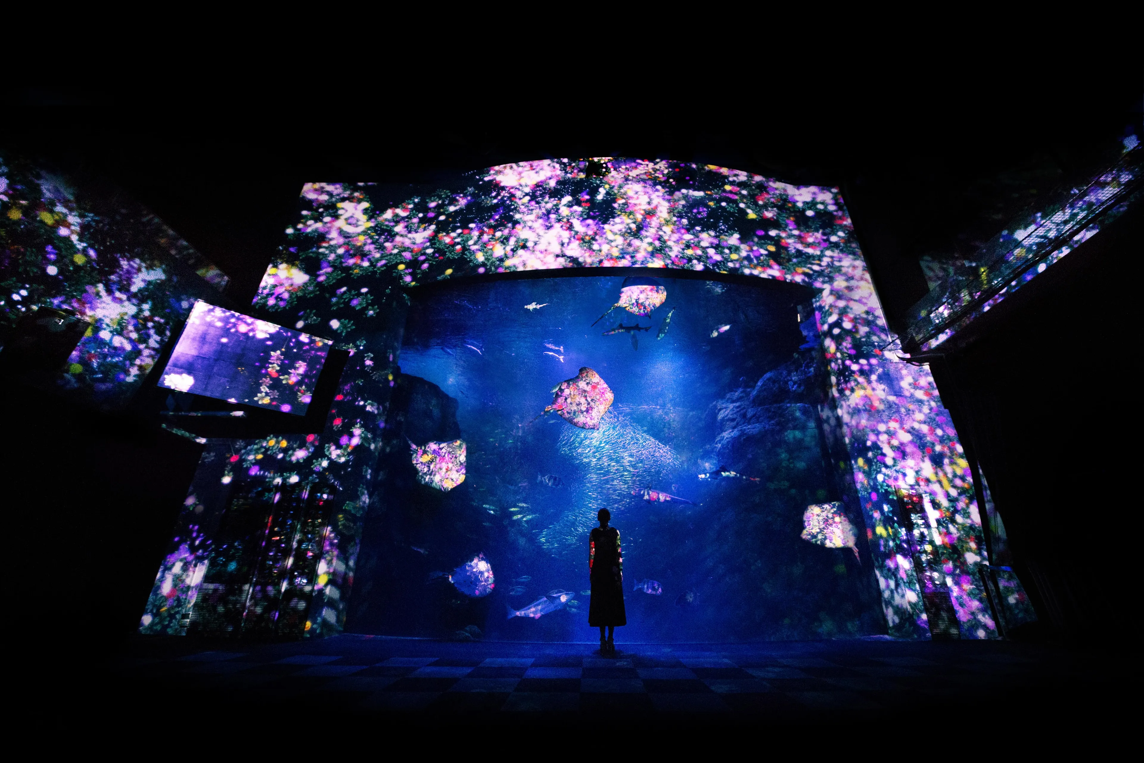 绽放的花朵投影在相模湾大水槽上,蔓延向无边无际,将整个空间变成一件艺术装置。水槽的灯光令人震撼,投影出来的图像更是给空间添了一份柔光。水槽中的鱼儿游过花朵的投影时,花朵便会凋零,化作片片花瓣。这件作品不是预先录制好的,也无法回放;而是随着鱼儿的游动永恒地改变着外观。此刻的画面在下一刻便会消失,再也不会重新出现。