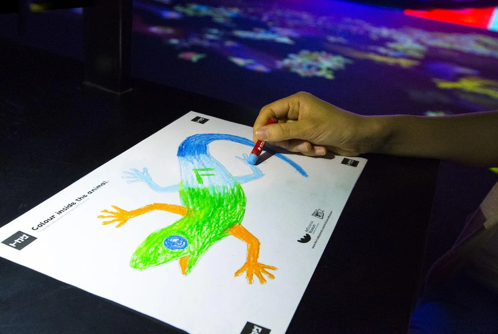 本作品是由大家所画的各种生物所创造出来的自然世界。这个自然世界会在大家所在的空间里慢慢延展开来。你所画的生物一定会出现在某处。请你试着寻找看看。生物们会吃掉其他的生物或是被其他生物吃掉,这就是一个由动物组建起来的生态系统。由你的画作所诞生的生物,也会吃掉其他的生物然后生长繁衍。而蝴蝶则会在有花朵的地方诞生。生物们被其他生物吃掉,或是无法吃到其他生物时就会死亡并消失。鳄鱼在人踩踏过度时就会死去。如你待在原地不动,花朵会大量盛开。相反地如你四处走动,花朵就会散落。您可以一边寻找由画作所诞生的生物,一边试着让花朵绽放,然后在大家所创造出来的这个世界里进行探险。