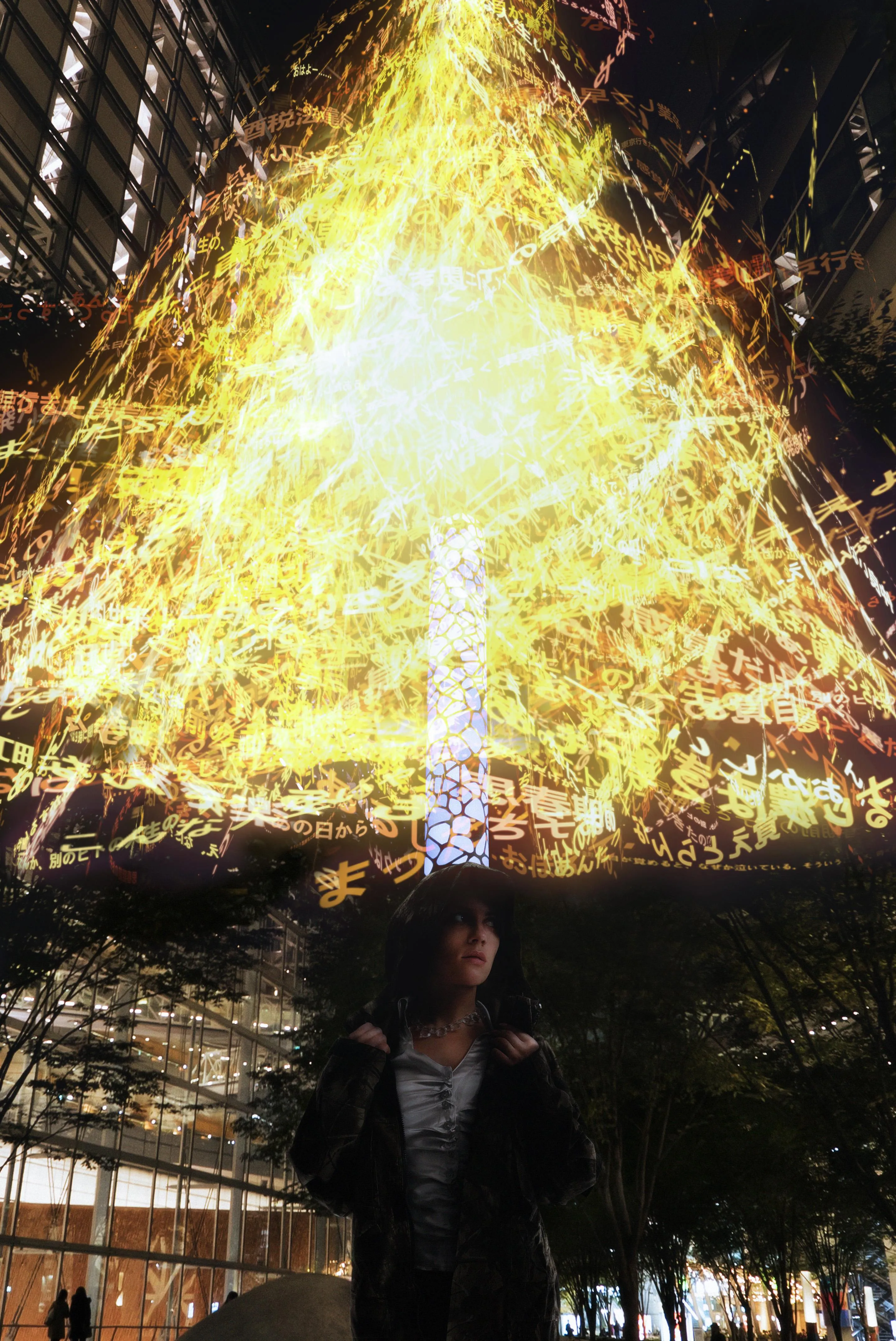 透过智能手机应用程序「Message Pillar」(信息光柱)的镜头来观察信息光柱,会发现柱子的周围漂浮着文字。只要在应用程序上书写讯息并上传,该讯息就会和之前被发布上去的信息一起飘浮在空中,变成一个由信息组成的树木。