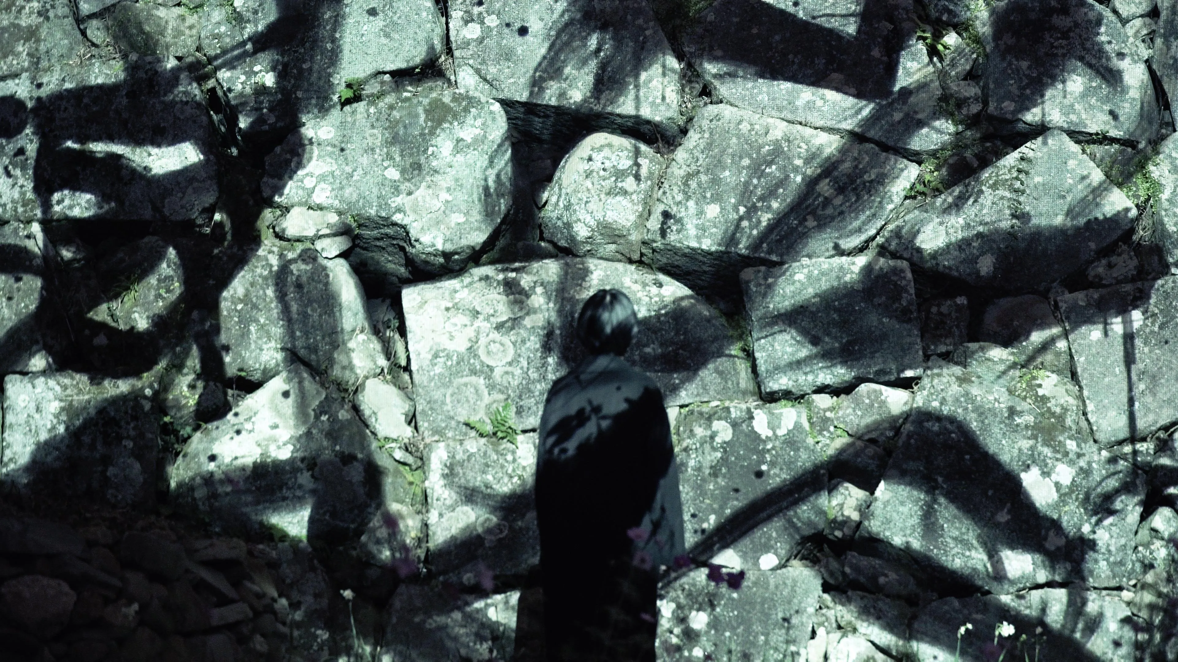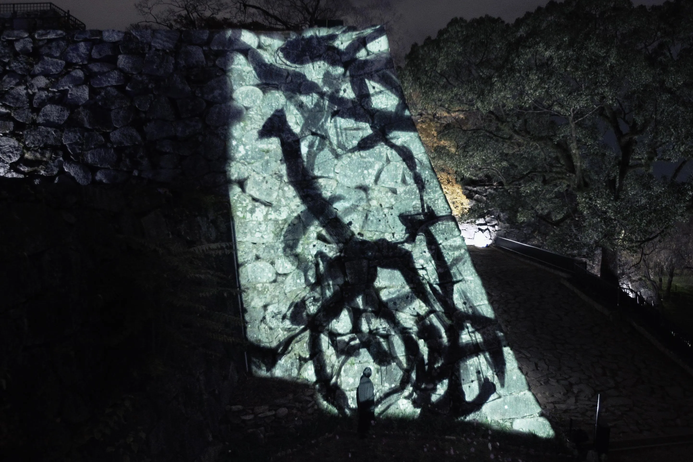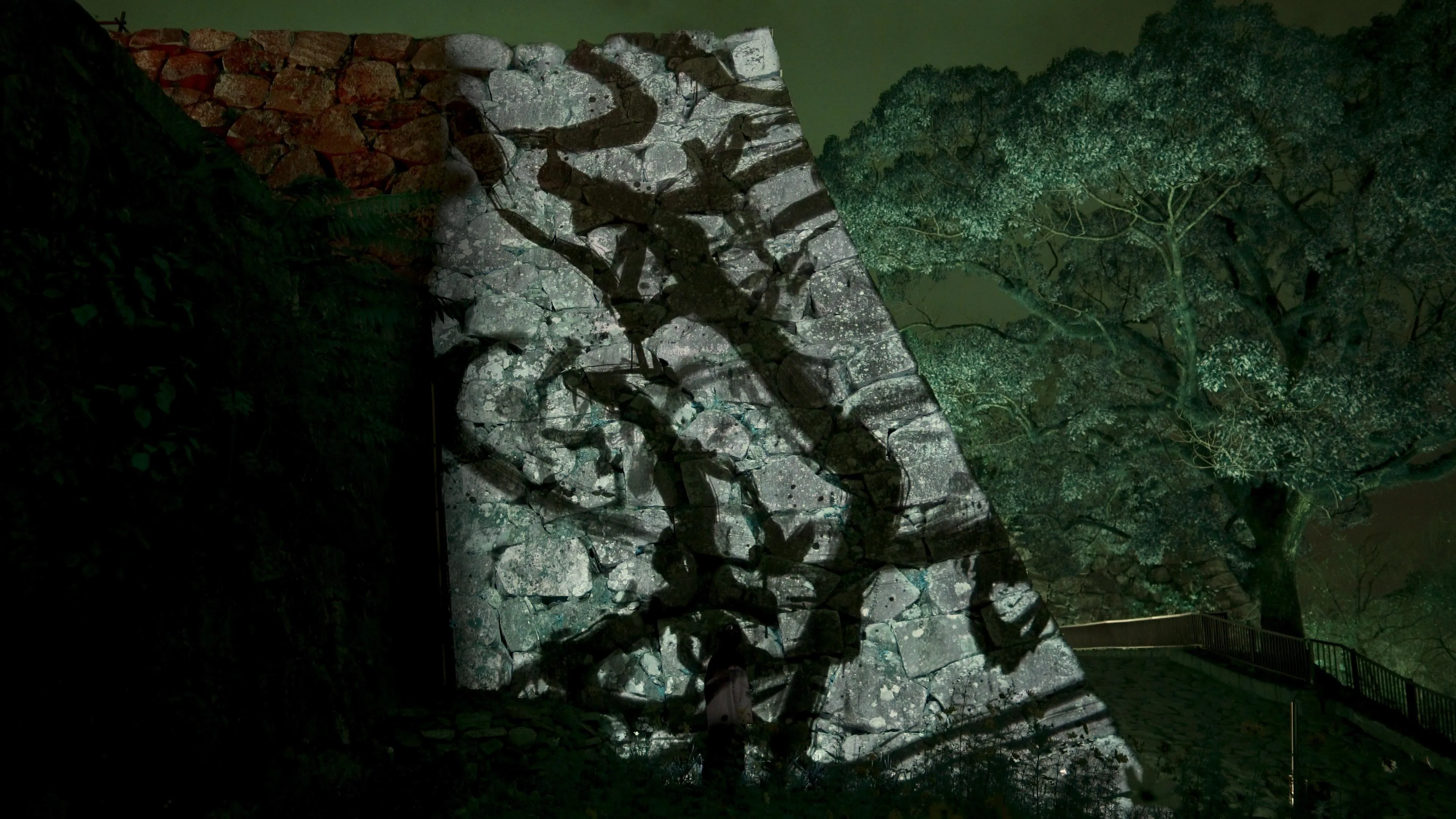 用光書寫下的黑色,意味著沒有光線,經歷數百年風化的石垣造成的陰影,無法與之區分開來。書法與石牆的陰影融為一體,永遠在石垣上書寫著”空書”。
