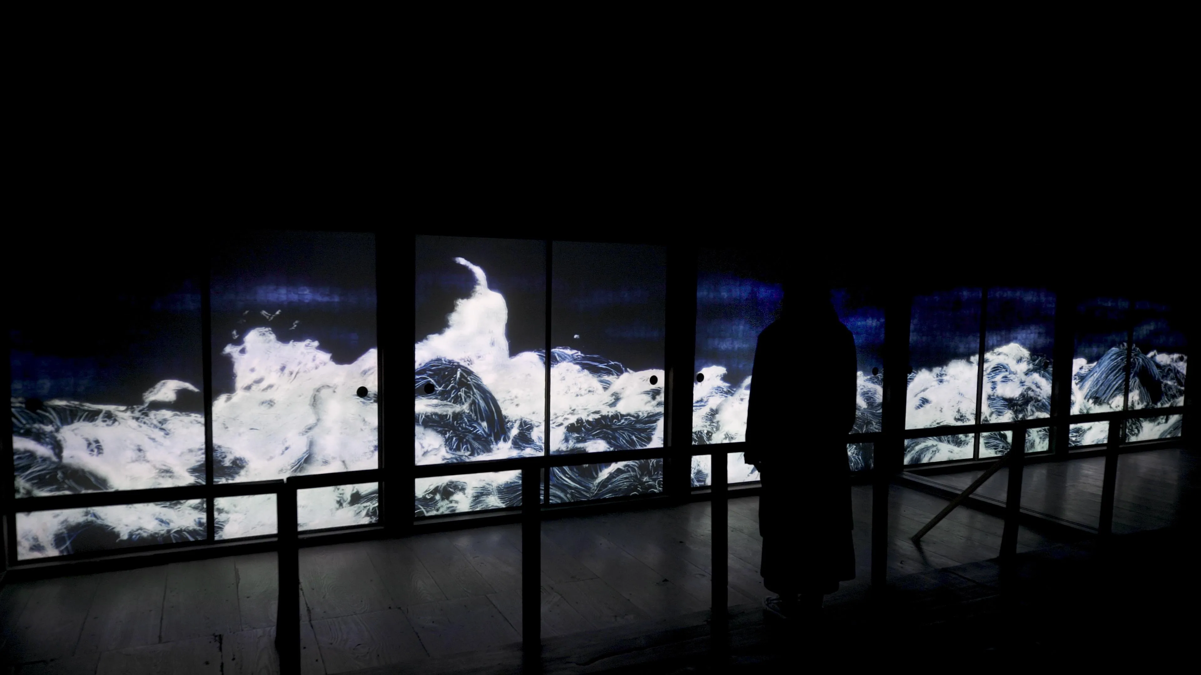 我們在電腦空間內以模擬波型來建構水在三次元空間下的動作。透過無數水分子的連續體來表現水,並且不斷計算分子之間的相互作用。而且我們還利用水分子動作來描繪線條,在三次元空間的波浪表層上描繪線條。而這樣在立體的描繪線條的集合體,也透過teamLab所發想的「超主觀空間」理論轉換成平面化的影像作品。