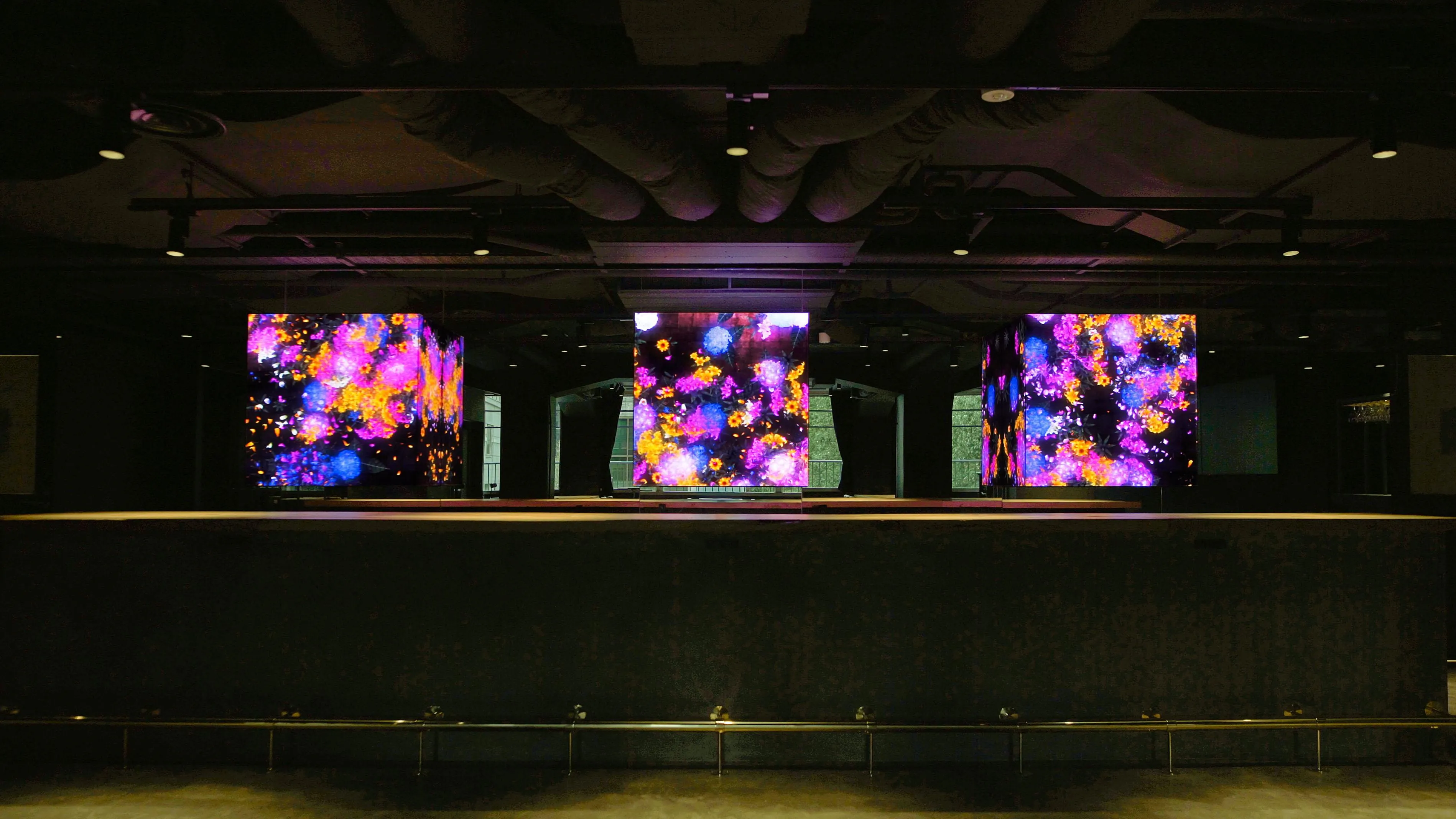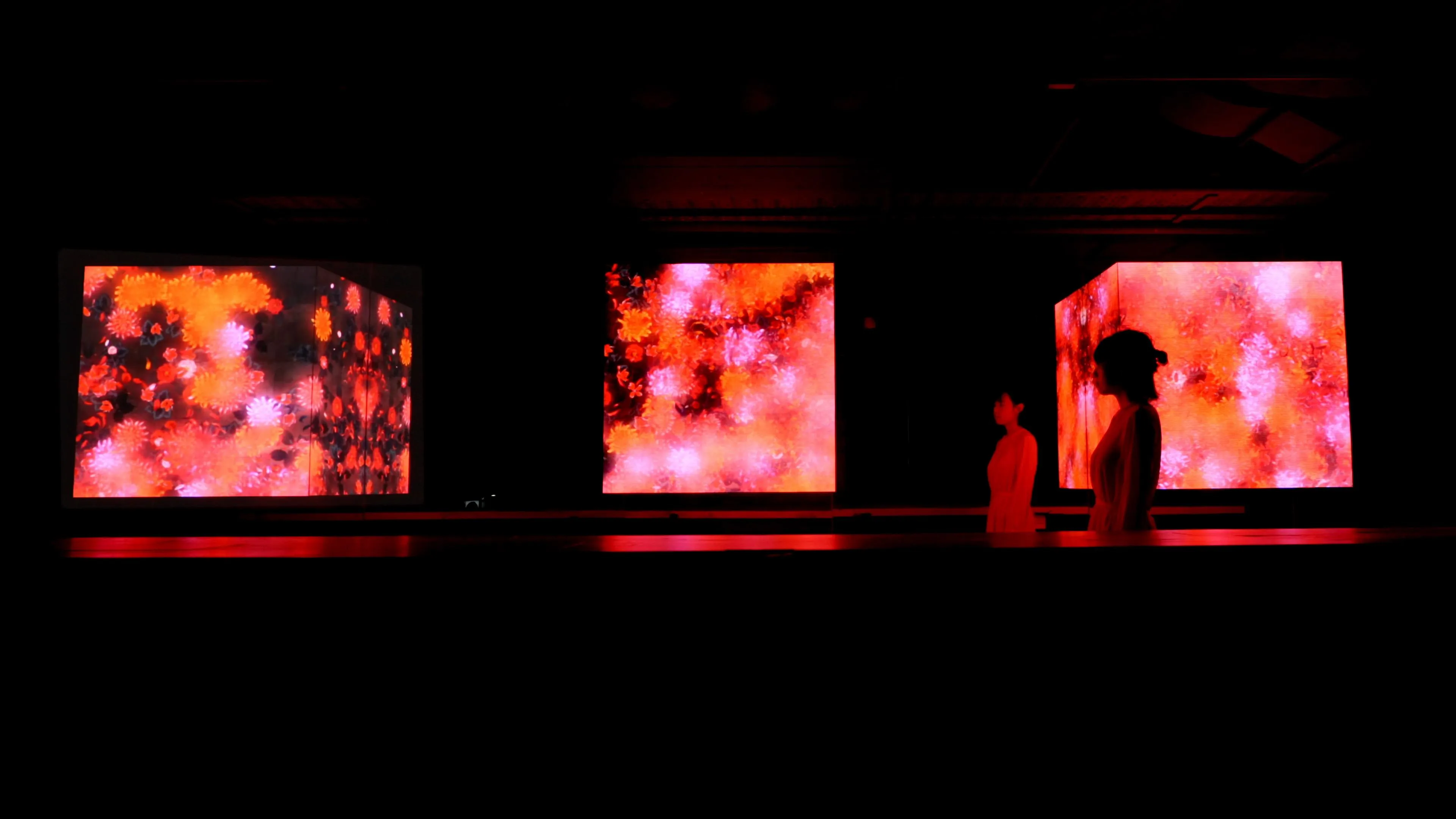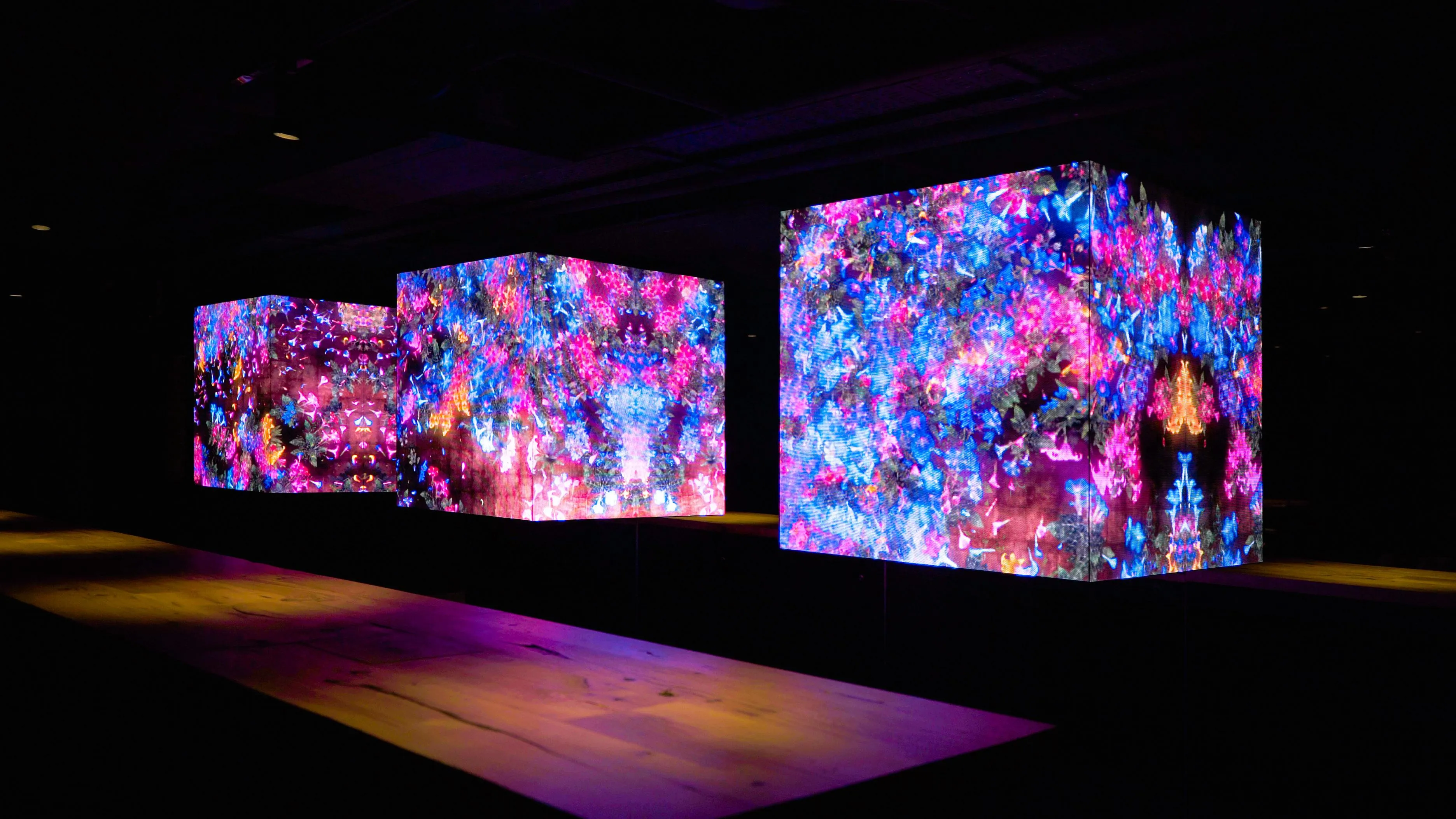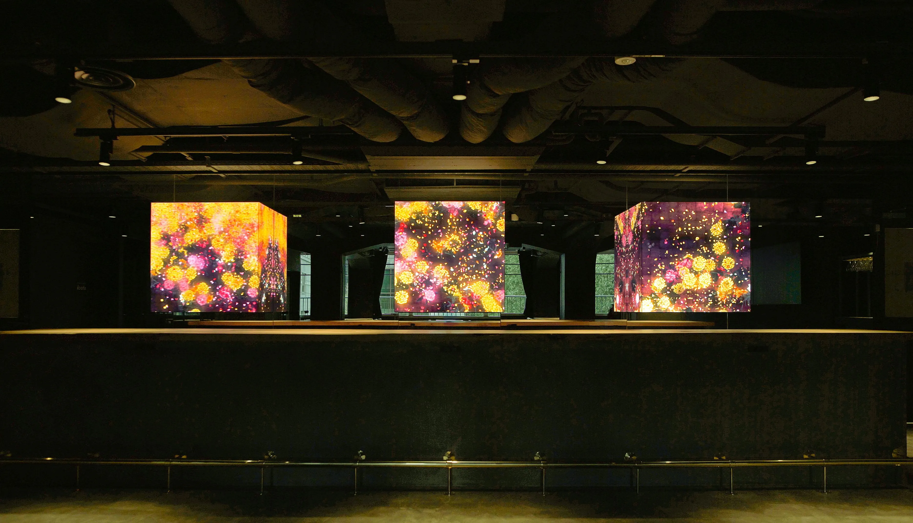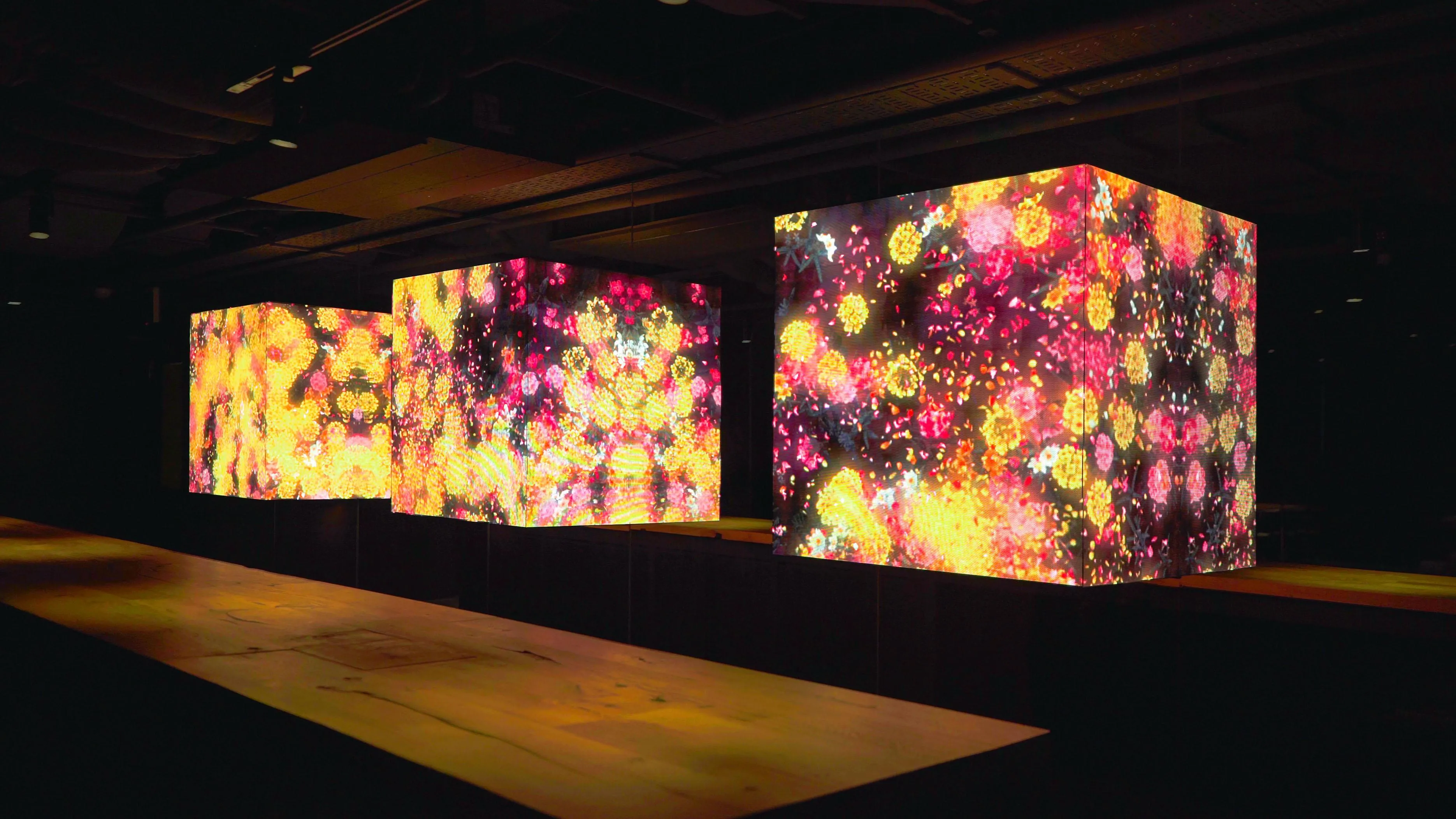 The artwork is not a pre-recorded image that is played back: it is created by a computer program that continuously renders the work in real time. The interaction between people and the installation causes continuous change in the artwork: previous visual states can never be replicated, and will never reoccur. The picture at this moment can never be seen again.