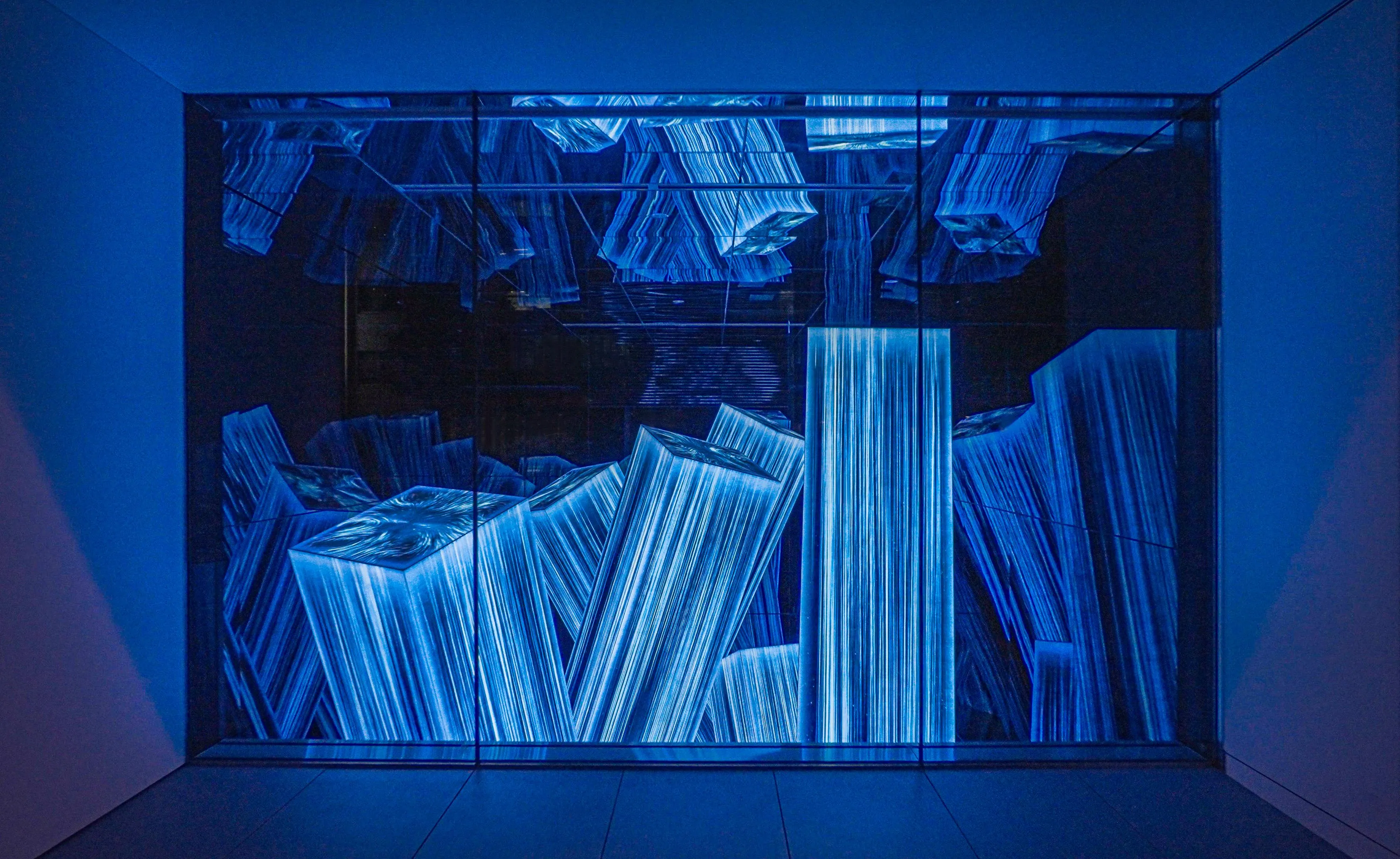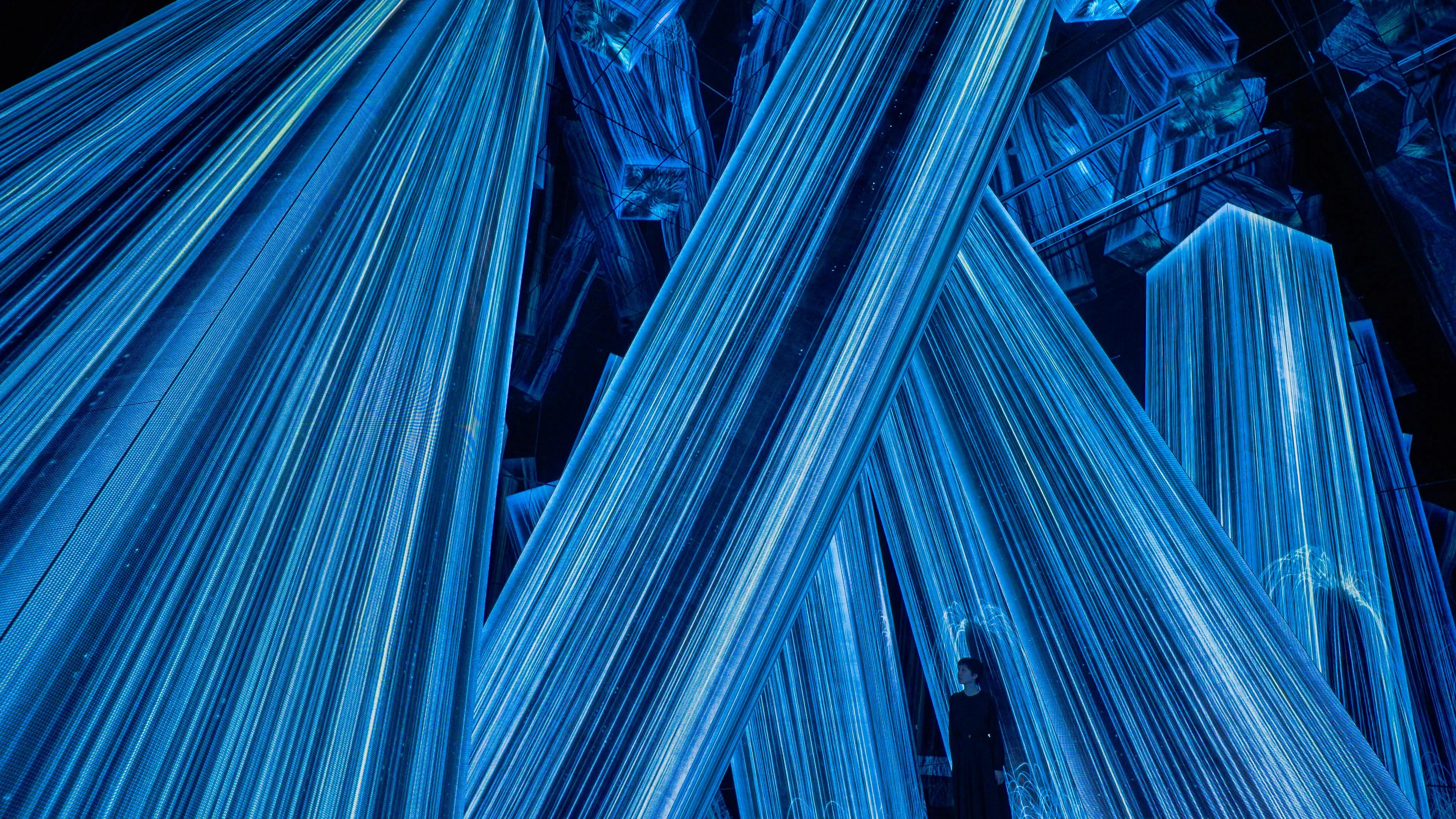用無數的粒子的連續形態來表現水,並且通過粒子的舉動變化在空間裡描繪線條。這些線條的集合,被teamLab“超主觀空間”理論平面化之後,描繪出了瀑布。